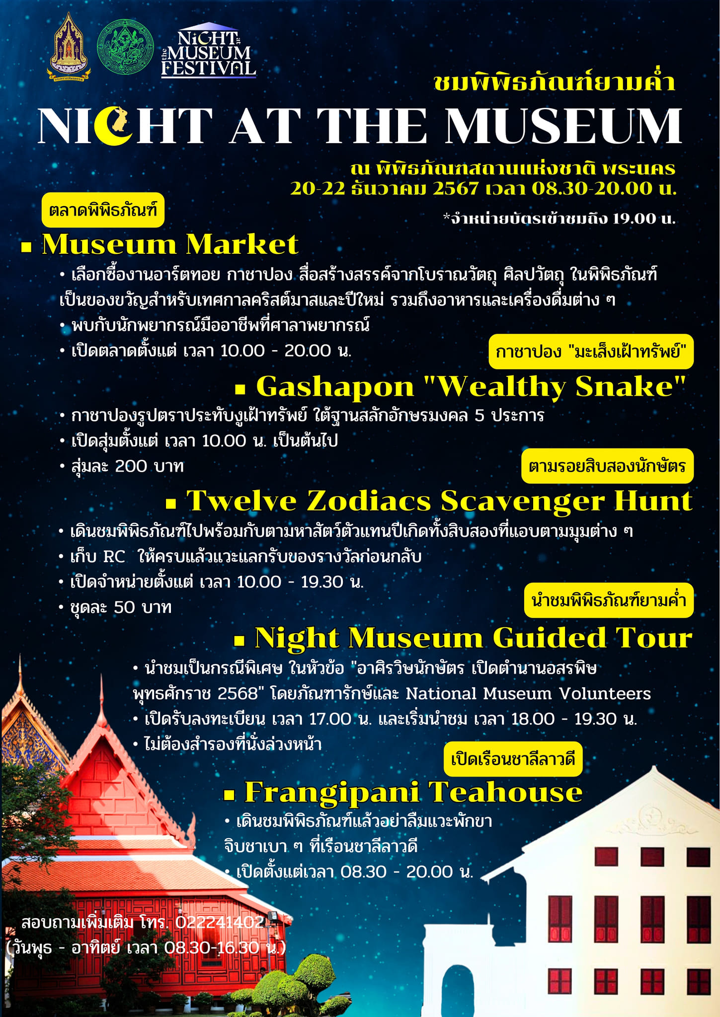 ขอเชิญผู้สนใจร่วมกิจกรรม "ชมพิพิธภัณฑ์ยามค่ำ" Night at the Museum ตั้งแต่เวลา ๐๘.๓๐ - ๒๐.๐๐ น. ในวันศุกร์ - อาทิตย์ ที่ ๒๐ - ๒๒ ธันวาคม ๒๕๖๗ จำหน่ายบัตร เวลา ๐๘.๓๐ - ๑๙.๐๐ น. ณ พิพิธภัณฑสถานแห่งชาติ พระนคร สอบถามเพิ่มเติม โทร. ๐ ๒๒๒๔ ๑๔๐๒ (วันพุธ - อาทิตย์ เวลา ๐๘.๓๐ - ๑๖.๓๐ น.) ติดตามรายละเอียดแต่ละกิจกรรมได้ทางเฟสบุ๊ก Education.National Museum Bangkok เที่ยวพิพิธภัณฑสถานแห่งชาติ พระนคร