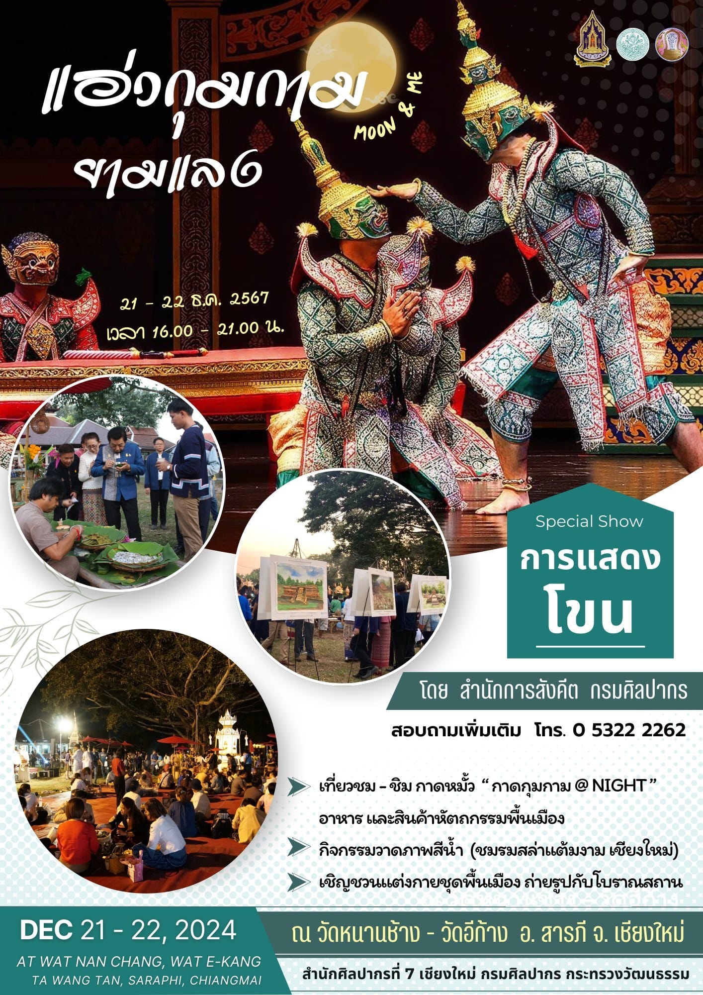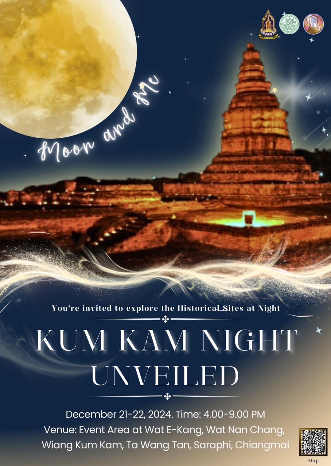 กระทรวงวัฒนธรรม โดยกรมศิลปากร สำนักศิลปากรที่ ๗ เชียงใหม่ ขอเชิญร่วมงาน “แอ่วกุมกามยามแลง: Moon & Me”งานท่องเที่ยวโบราณสถานยามค่ำคืน ณ เวียงกุมกาม วันเสาร์ที่ ๒๑ และ วันอาทิตย์ที่ ๒๒ ธันวาคม ๒๕๖๗ เวลา ๑๖.๐๐ - ๒๑.๐๐ น. ณ ลานกิจกรรม วัดอีก้าง - วัดหนานช้าง เวียงกุมกาม ต.ท่าวังตาล อ.สารภี จ.เชียงใหม่