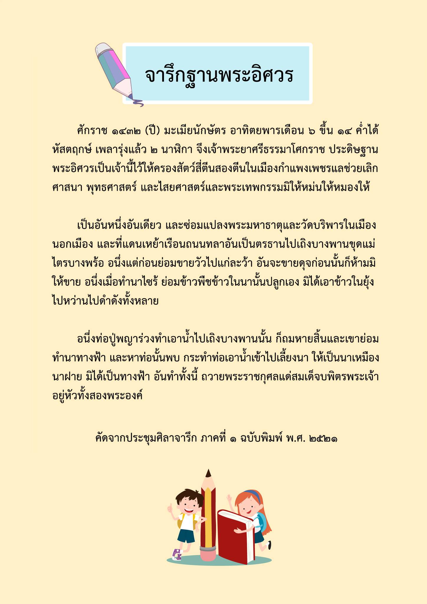 พิพิธภัณฑสถานแห่งชาติ กำแพงเพชร ขอเชิญชวนร่วมกิจกรรมออนไลน์วันเด็กแห่งชาติ ประจำปี ๒๕๖๘ ปีนี้พบกับกิจกรรมคัดลายมือจารึกฐานพระอิศวรตัวอักษรไทยปัจจุบัน และกิจกรรมวาดภาพระบายสีพระอิศวรเมืองกำแพงเพชร น้อง ๆ ทุกระดับชั้นสามารถเข้าร่วมสนุกกับกิจกรรมได้ โดยถ่ายผลงานและรูปคู่ผลงาน พร้อมแจ้งชื่อ นามสกุล อายุ ชั้น โรงเรียน ที่อยู่ และเบอร์โทร ส่งมาทาง Email : kpp_museum14@hotmail.com หรือทางพิพิธภัณฑสถานแห่งชาติ กำแพงเพชร เลขที่ ๑๒๐ ถนนปิ่นดำริห์ ตำบลในเมือง อำเภอเมืองฯ จังหวัดกำแพงเพชร ๖๒๐๐๐