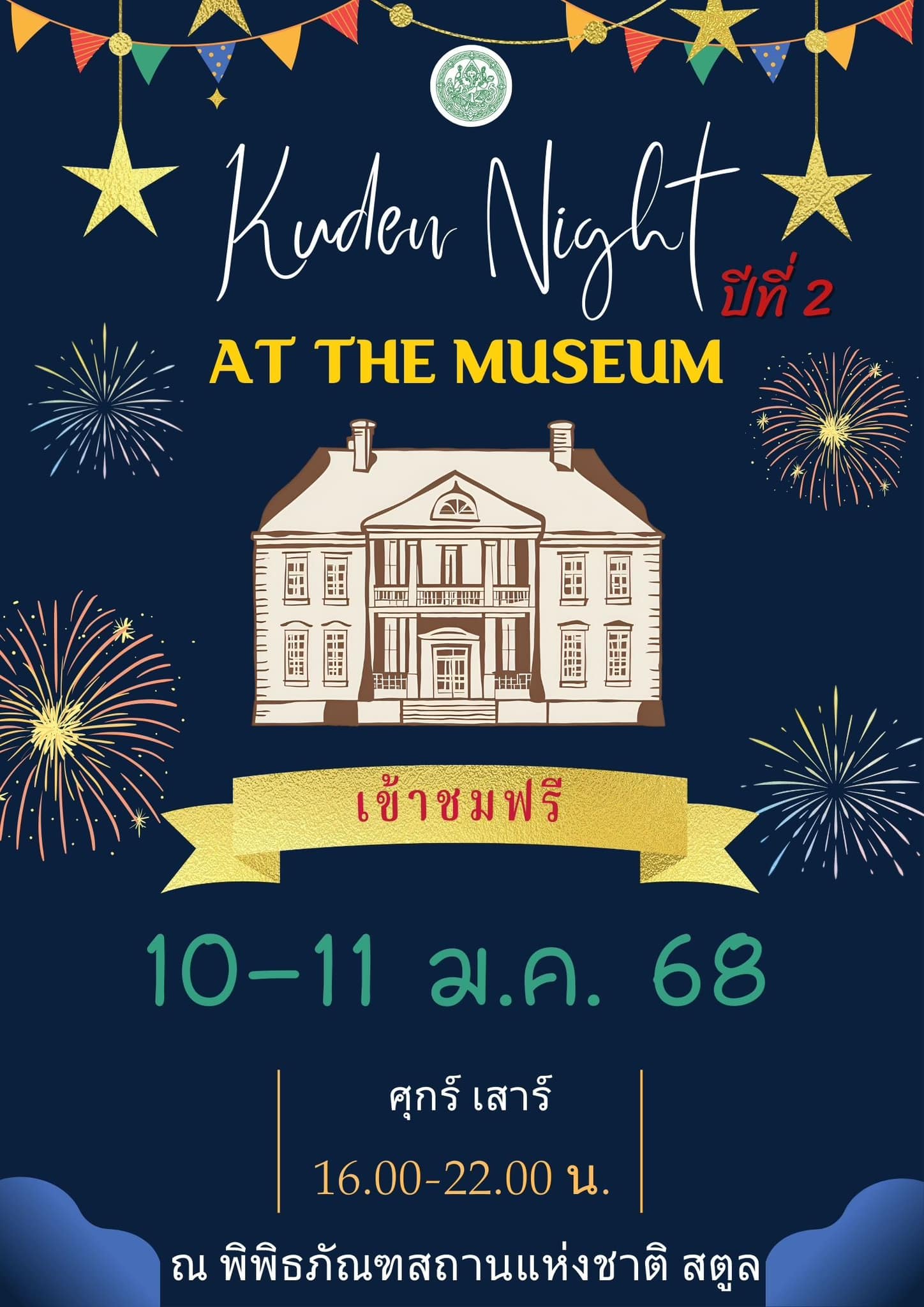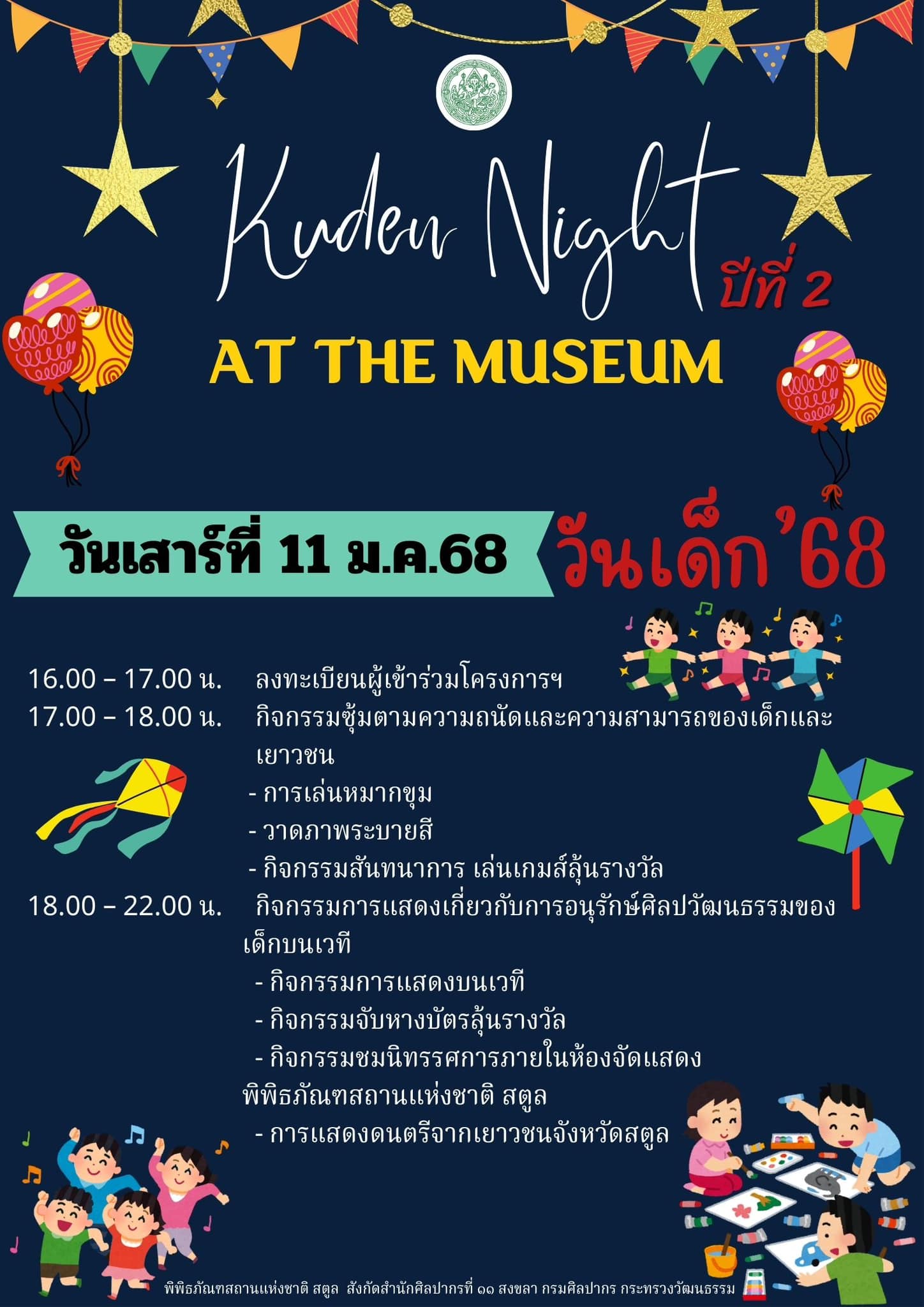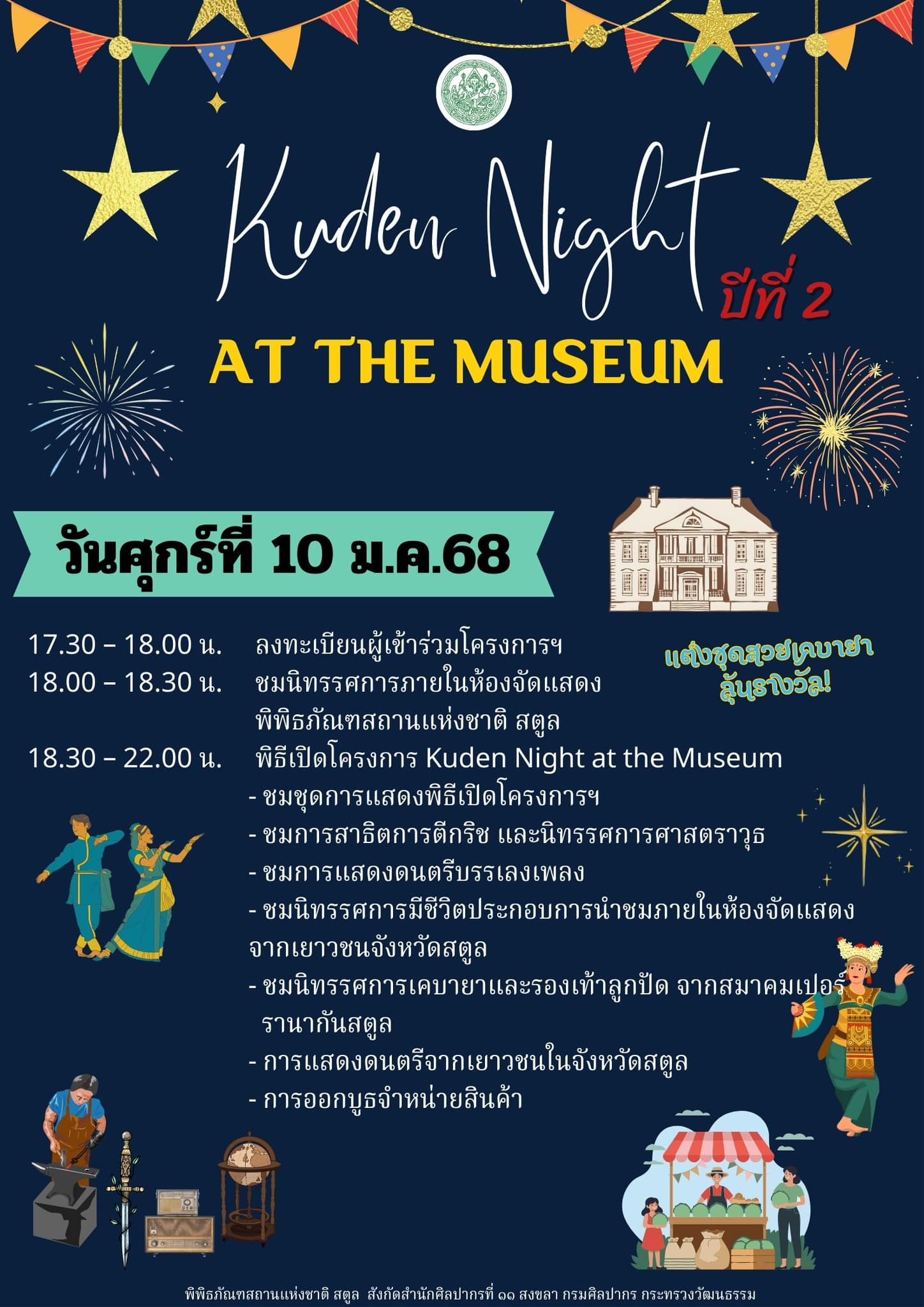 กรมศิลปากร โดยพิพิธภัณฑสถานแห่งชาติ สตูล หรือคฤหาสน์กูเด็น ดำเนินการตามนโยบายของรัฐบาลในการส่งเสริมการท่องเที่ยว ประวัติศาสตร์ ศิลปวัฒนธรรม ยกระดับแหล่งท่องเที่ยว โบราณสถานและพิพิธภัณฑสถานแห่งชาติของกรมศิลปากร เป็นทุนทางวัฒนธรรมที่ช่วยสร้างรายได้ สร้างอาชีพและสนับสนุนการ ท่องเที่ยวทางวัฒนธรรมในระดับจังหวัด ให้พิพิธภัณฑสถานแห่งชาติ สตูล เป็นแหล่งท่องเที่ยวกลางเมืองและเป็นสถานที่ต้อนรับนักท่องเที่ยวทั้งชาวไทยและชาวต่างชาติที่มาเยี่ยมเมืองสตูล จึงกำหนดจัดโครงการ Kuden Night at the Museum ประจำปีงบประมาณ 2568 เปิดให้เข้าชมพิพิธภัณฑ์ในยามค่ำคืน ระหว่างวันที่ 10 – 11 มกราคม 2568 ระหว่างเวลา 16.00 – 22.00 น. โดยงดเว้นค่าเข้าชม และมีการจัดกิจกรรมมากมาย อาทิ ชมนิทรรศการมีชีวิตภายในพิพิธภัณฑ์ นิทรรศการเคบายาและรองเท้าลูกปัดจากชมรมเปอร์รานากัล สตูล สาธิตการตีกริชและนิทรรศการศาตราวุธ กิจกรรมส่งเสริมหนูน้อยนักอนุรักษ์มรดกทางศิลปวัฒนธรรม เนื่องในวันเด็กแห่งชาติ รวมถึงการจำหน่ายอาหารและสินค้าพื้นเมืองที่มีชื่อเสียงของจังหวัดสตูล พร้อมทั้งมีการแสดงบนเวทีจากสถาบันการศึกษาในจังหวัดสตูล ซึ่งมีผู้ประกอบการร้านค้าในจังหวัดสตูลเข้าร่วม จำนวน 30 ร้าน คาดว่าจะมีจำนวนนักท่องเที่ยวเพิ่มขึ้นไม่น้อยกว่า 5,000 คน