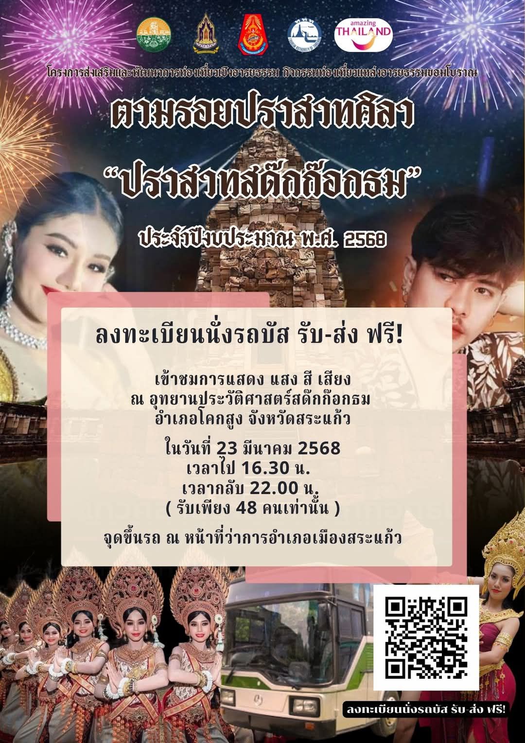 อุทยานประวัติศาสตร์สด๊กก๊อกธม จังหวัดสระแก้ว ขอเชิญชมการแสดงแสง สี เสียง สื่อผสม และเทคนิคเอฟเฟกต์พิเศษ “อัศจรรย์เกริกก้องฟ้า เทวศิลาปราสาทสด๊กก๊อกธม“ ในวันที่ ๒๒ - ๒๓ มีนาคม ๒๕๖๘ และชมคอนเสิร์ตจากศิลปิน วันเสาร์ที่ ๒๒ มีนาคม ๒๕๖๘ ศิลปิน บอล ตาพระยา วันอาทิตย์ที่ ๒๓ มีนาคม ๒๕๖๘ ศิลปินหมอลำ แพรวพราว แสงทอง