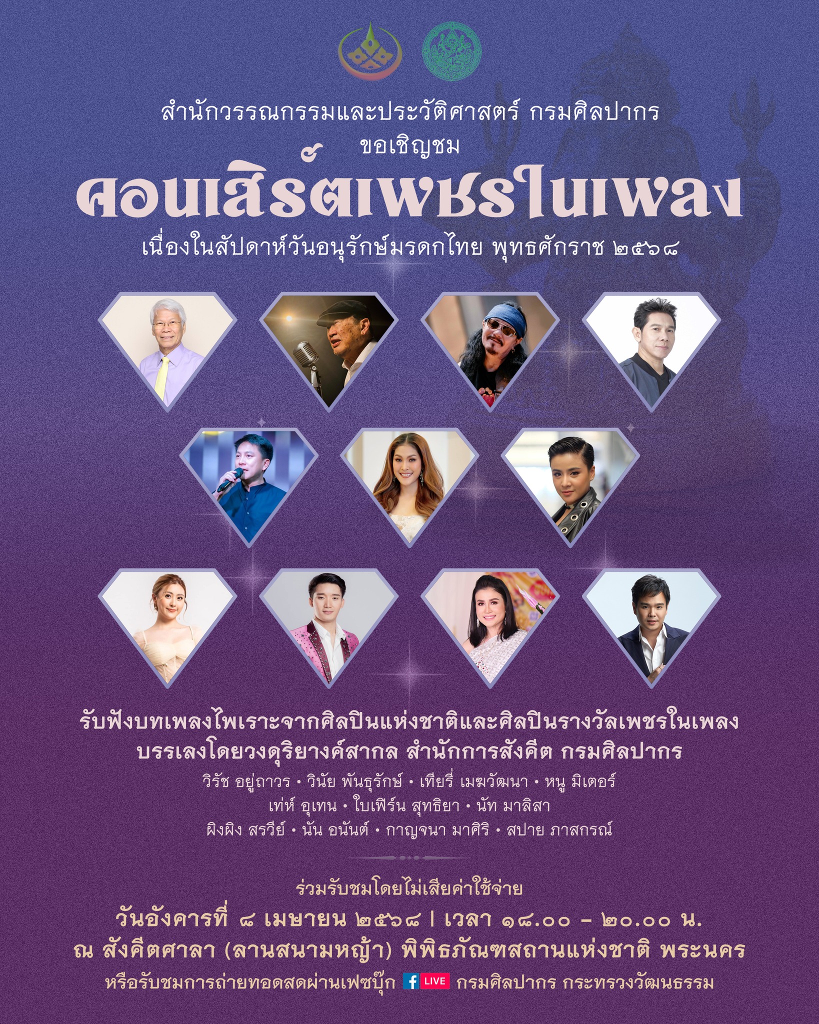 - การแสดงคอนเสิร์ต “เพชรในเพลง” ในวันที่ ๘ เมษายน ๒๕๖๘ เวลา ๑๘.๐๐ น. ณ เวทีกลางแจ้ง พบกับศิลปินแห่งชาติและศิลปินที่ได้รับรางวัล "เพชรในเพลง"