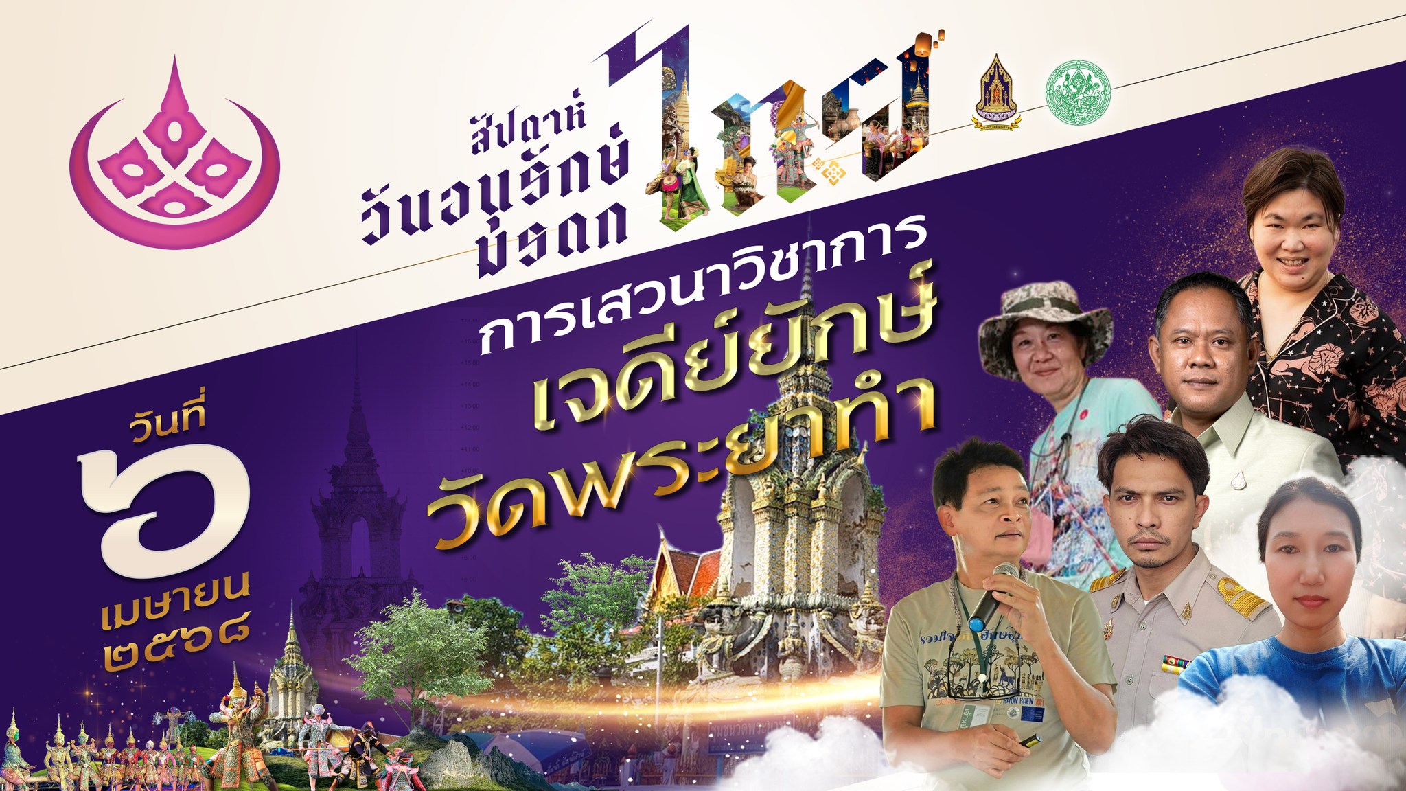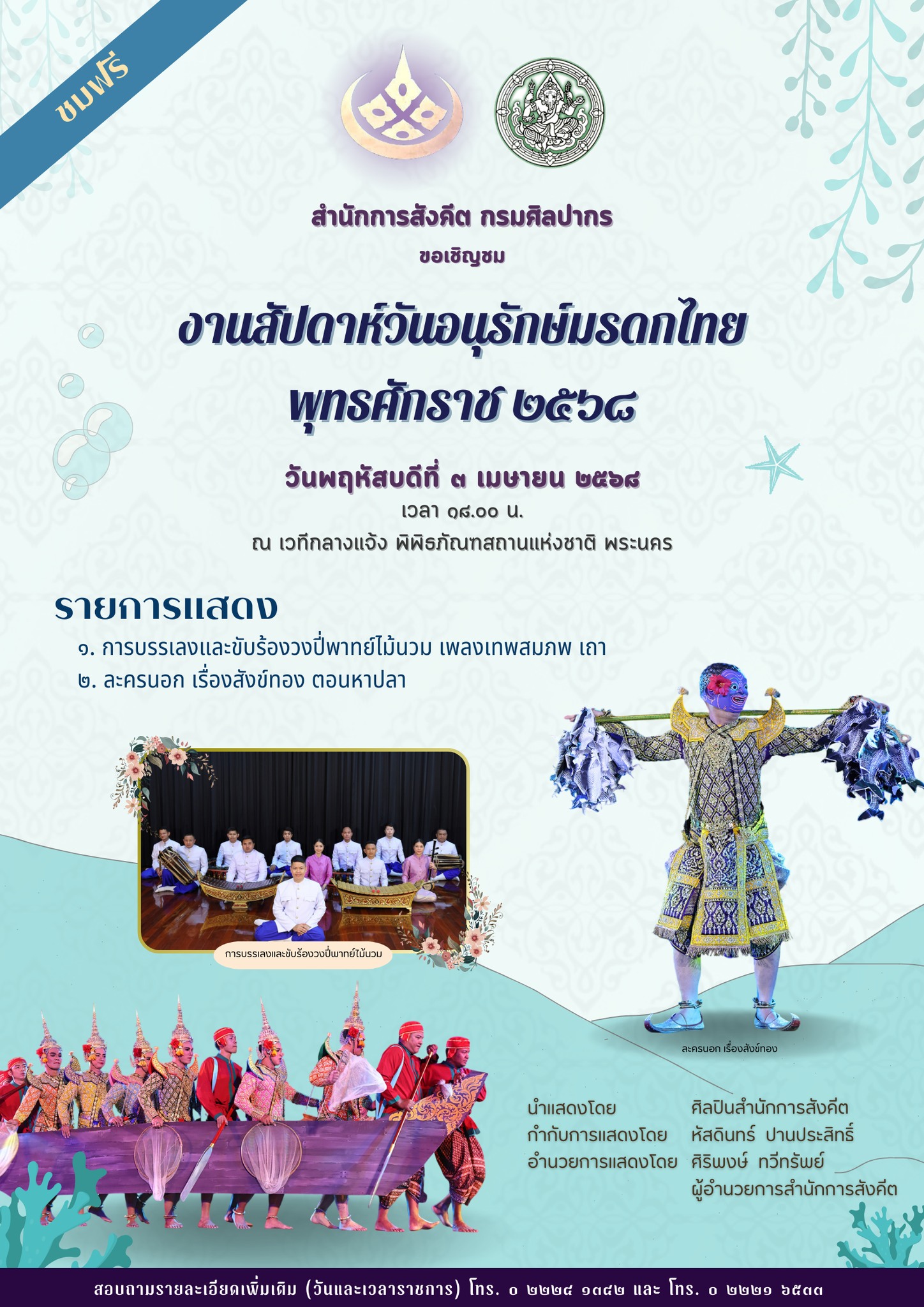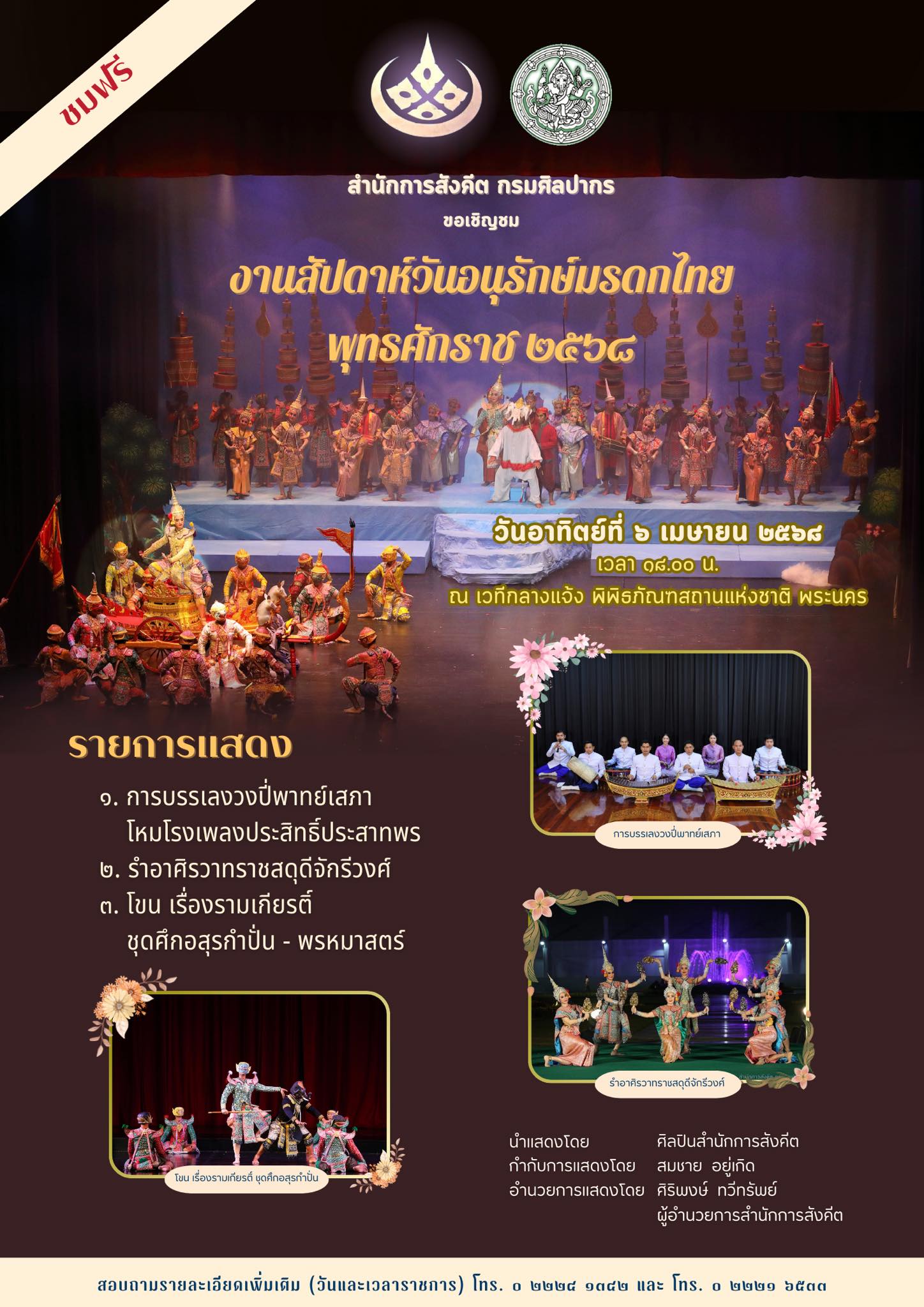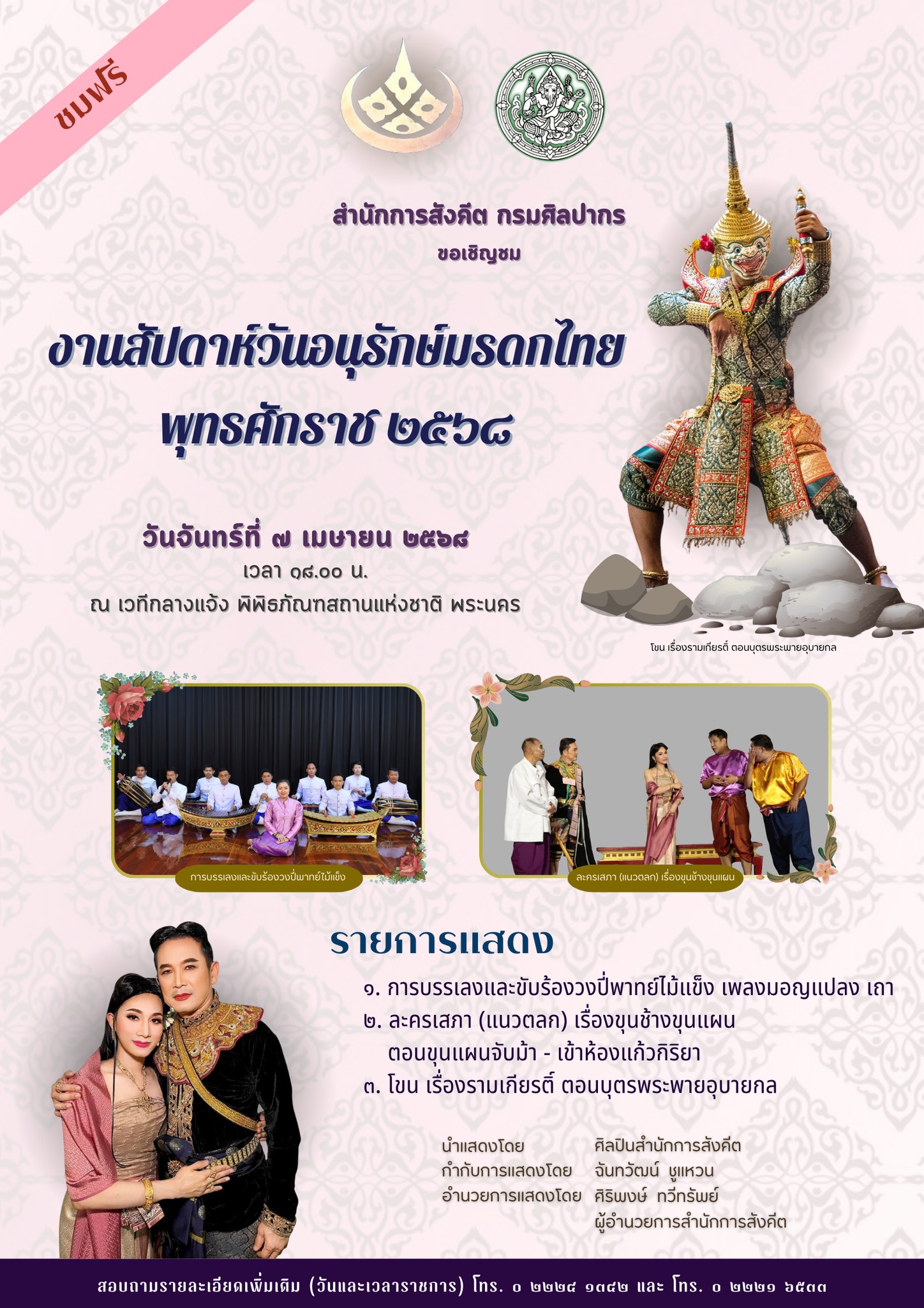 ขอเชิญชวนประชาชนชาวไทยเข้าร่วมงานสัปดาห์วันอนุรักษ์มรดกไทย พุทธศักราช ๒๕๖๘ ระหว่างวันที่ ๒ - ๘ เมษายน ๒๕๖๘ ณ บริเวณพิพิธภัณฑสถานแห่งชาติ พระนคร