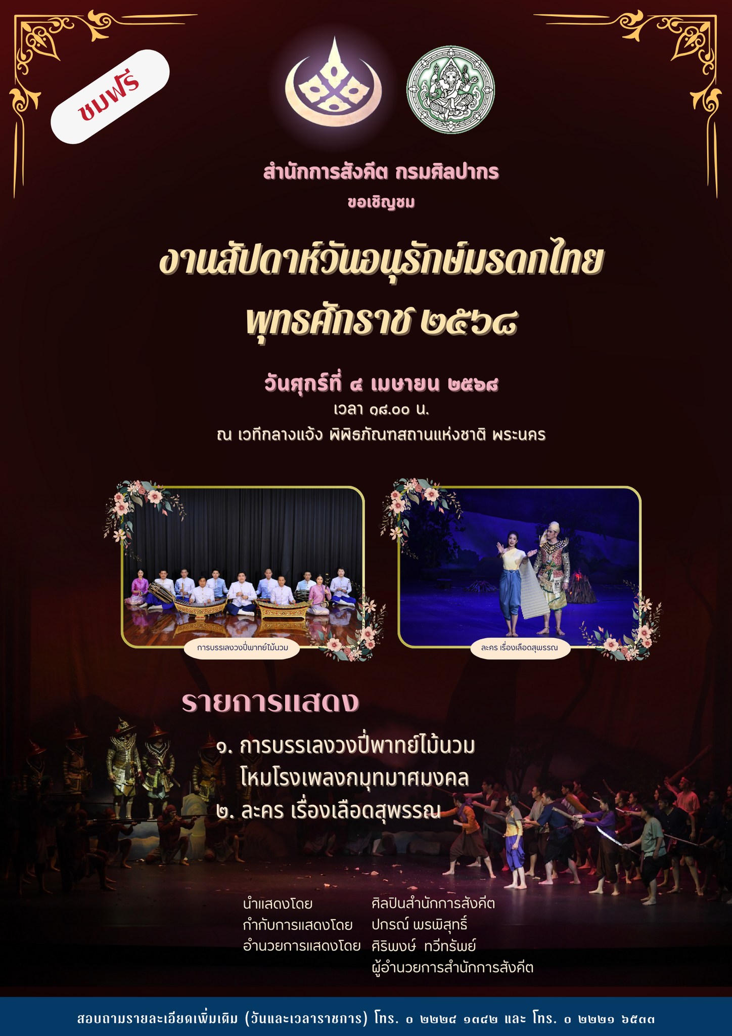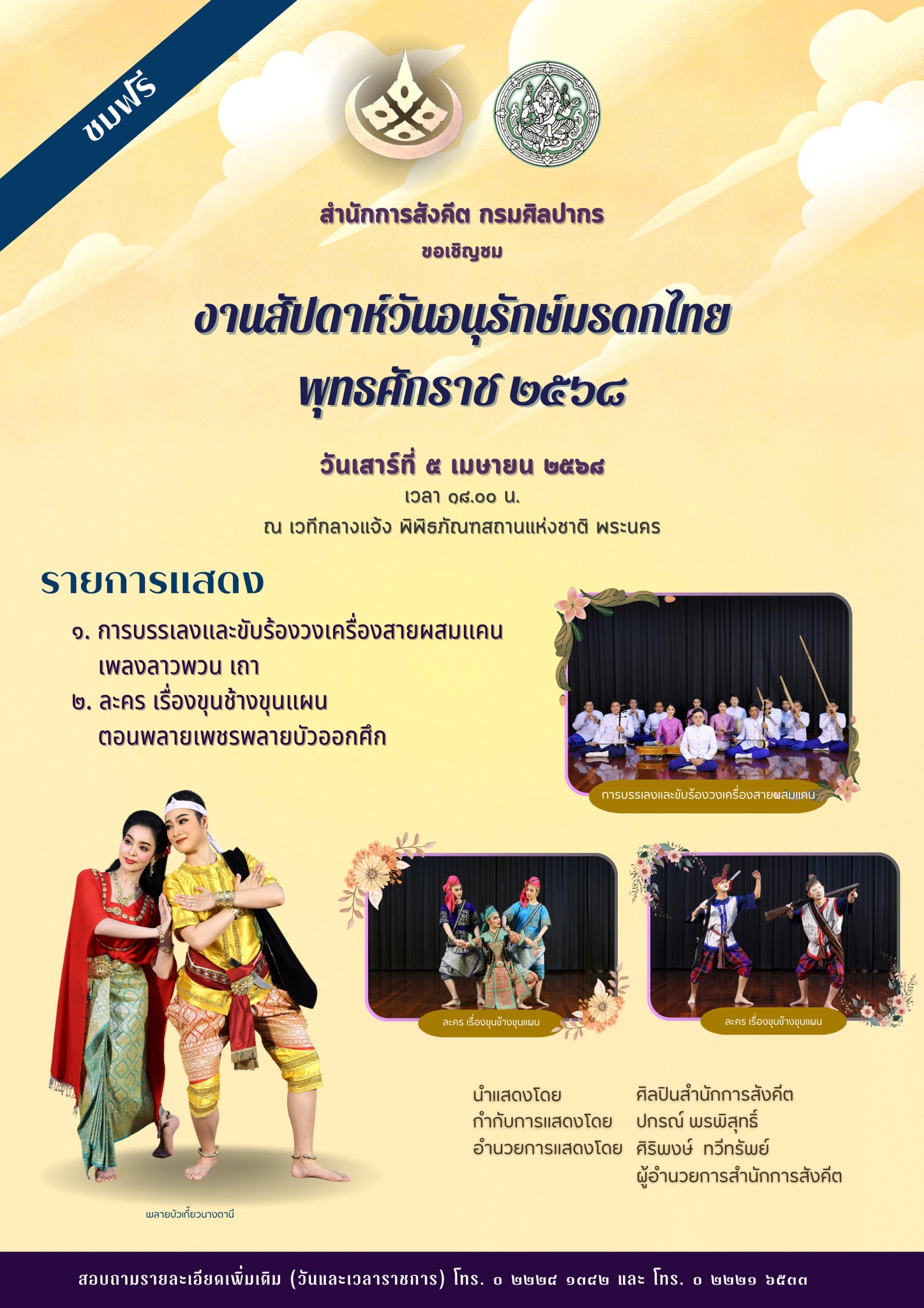 ชวนร่วมงานสัปดาห์วันอนุรักษ์มรดกไทย รับฟังการเสวนาทางวิชาการ และชมการแสดงนาฏศิลป์ - ดนตรี วันที่ ๒ – ๘ เมษายนนี้