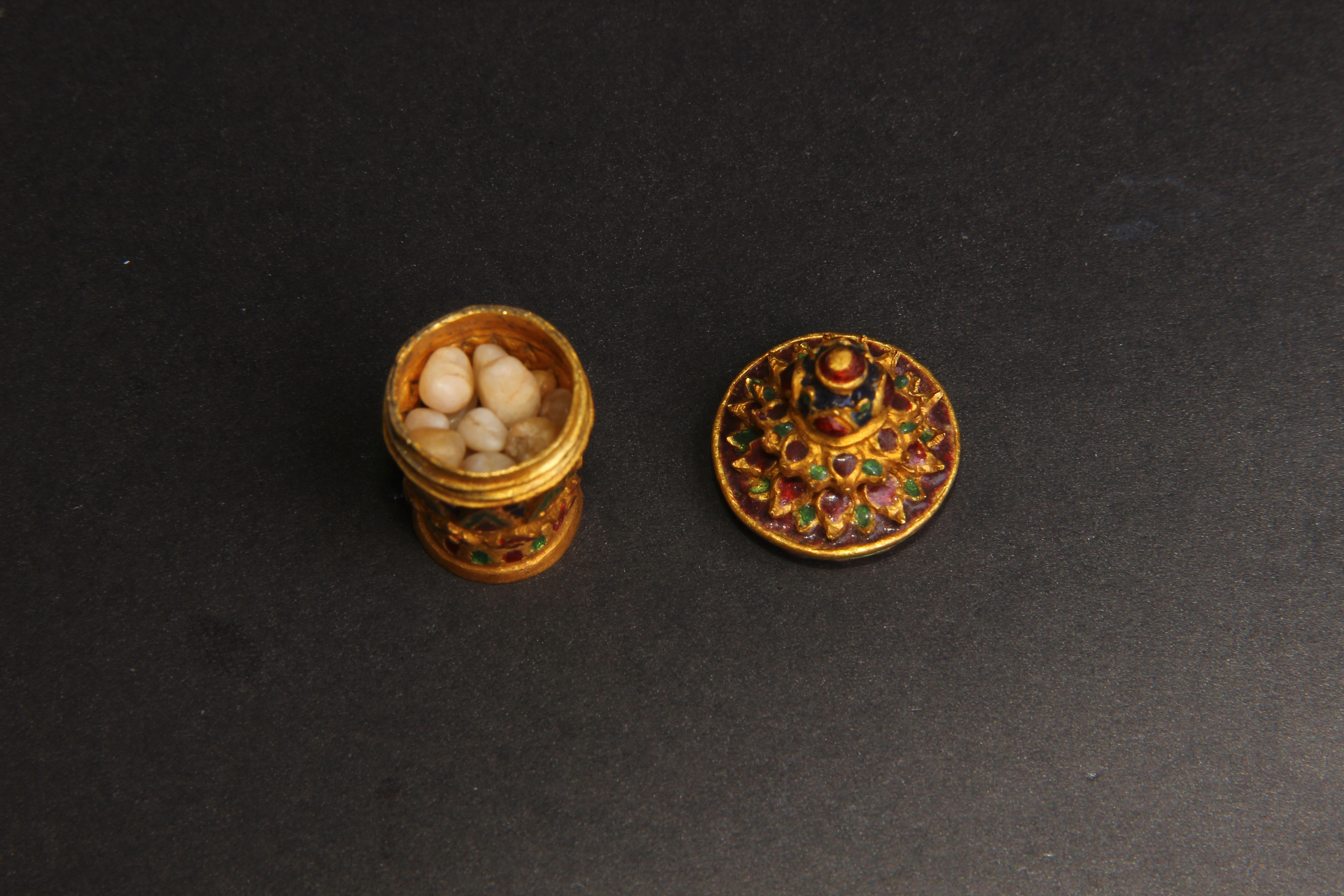 ประดิษฐานในพระกรัณฑ์ทองคำลงยา ขนาดเส้นผ่านศูนย์กลาง ๑.๒ เซนติเมตร สูง ๓.๕ เซนติเมตร เป็นภาชนะทองคำทรงโกศยอดปริกขนาดเล็กภายในประดิษฐานพระธาตุ ๒๓ องค์ เดิมทีพระกรัณฑ์นี้อยู่ในก้านพระรัศมีของพระพุทธสิหิงค์ ซึ่งประดิษฐานที่พระที่นั่งพุทไธสวรรย์ พระราชวังบวรสถานมงคล หรือพิพิธภัณฑสถานแห่งชาติ พระนคร ในปัจจุบันความเป็นมาของพระธาตุนี้ ไม่ปรากฏหลักฐานแน่ชัด อาจมีการประดิษฐานไว้ในพระเศียรพระพุทธสิหิงค์มาก่อนแล้วจึงมีการสร้างพระกรัณฑ์ทองคำลงยาถวายภายหลัง หรือเป็นการประดิษฐานในภายหลังทั้งหมดก็เป็นได้ การจำหลักลายแล้วลงยาสีที่รู้จักกันในชื่อ การลงยา นั้น ปรากฏหลักฐานการใช้งานมาแต่ครั้งกรุงศรีอยุธยา แต่เนื่องจากลวดลายที่ปรากฏ รวมทั้งสีและเทคนิคในการลงยาสันนิษฐานว่า อาจจะทำขึ้นในสมัยกรุงรัตนโกสินทร์