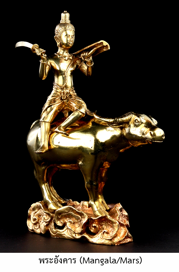 พระอังคาร พระอิศวรทรงสร้างจากกระบือ ๘ ตัว บดป่นเป็นผง ห่อด้วยผ้าสีชมพูหม่น พรมด้วยน้ำอมฤตได้บุรุษผิวสีทองแดงทรงกระบือเป็นพาหนะ ประจำอยู่ทิศตะวันออกเฉียงใต้ เป็นเทพนพเคราะห์ประเภทบาปเคราะห์ มีอารมณ์มุทะลุ ตึงตัง ชอบใช้กำลัง ใจร้อน เป็นมิตรกับพระศุกร์ และเป็นศัตรูกับพระอาทิตย์ สัญลักษณ์เลข ๓ มีกำลังพระเคราะห์เป็น ๘