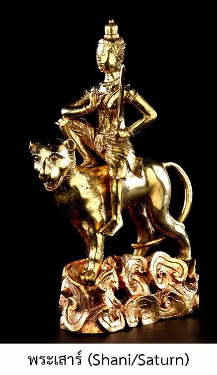 พระเสาร์ พระอิศวรทรงสร้างจากเสือ ๑๐ตัว บดป่นเป็นผง ห่อผ้าสีดำ พรมด้วยน้ำอมฤตได้พระเสาร์มีสีกายดำคล้ำ ทรงเสือเป็นพาหนะ ประจำอยู่ทิศตะวันตกเฉียงใต้ เป็นเทพนพเคราะห์ประเภทบาปเคราะห์ มีกิริยาดุดัน แข็งแรง กล้าได้กล้าเสีย บุคลิกเคร่งขรึม เป็นมิตรกับพระราหูและเป็นศัตรูกับพระศุกร์ สัญลักษณ์เลข ๗ มีกำลังพระเคราะห์เป็น ๑๐