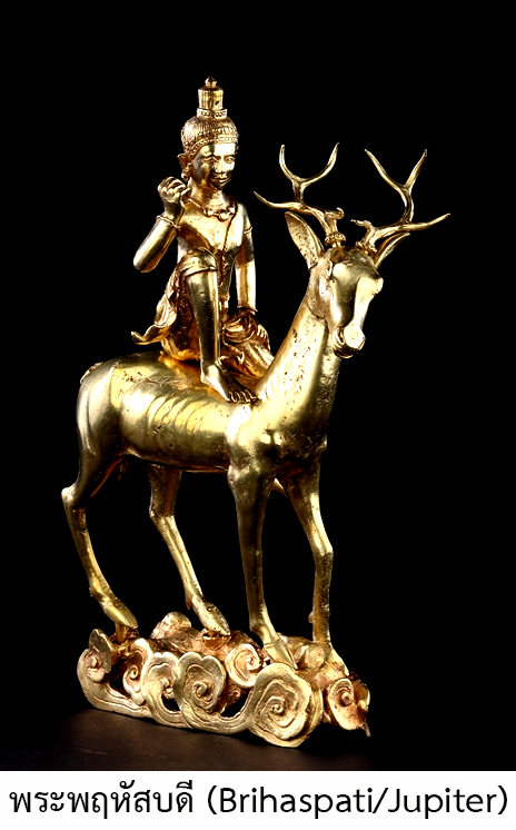 พระพฤหัสบดี พระอิศวรสร้างจากฤษี ๑๙ ตน บดป่นเป็นผง ห่อผ้าสีส้มแดง พรมน้ำอมฤตได้เป็นพระพฤหัสบดี มีผิวกายสีส้มแดง ทรงกวางเป็นพาหนะ ประจำอยู่ทิศตะวันตก เป็นเทพนพเคราะห์ประเภทศุภเคราะห์ มักทำอะไรด้วยความระมัดระวัง สุขุม รอบคอบ เมตตาปรานีต่อผู้อื่น เป็นมิตรกับพระอาทิตย์ และเป็นศัตรูกับพระจันทร์ สัญลักษณ์เลข ๕ มีกำลังพระเคราะห์เป็น ๑๙ เป็นครูของเทพทั้งหลาย จึงนิยมทำพิธีไหว้ครูในวันพฤหัสบดี