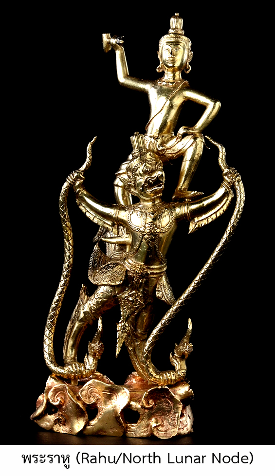 พระราหู พระอิศวรทรงสร้างจากหัวกะโหลก ๑๒ หัว (บางตำราว่าผีโขมด ๑๒ ตัว) บดป่นเป็นผง ห่อผ้าสีทอง พรมน้ำอมฤตได้เป็นพระราหู มีกายสีนิลออกไปทางทองแดง ทรงครุฑเป็นพาหนะ มีวิมานสีนิลอยู่ในอากาศ ประจำอยู่ทิศตะวันตกเฉียงเหนือ เป็นเทพนพเคราะห์ประเภทบาปเคราะห์ ให้ผลในทาง ลุ่มหลงมัวเมา เป็นมิตรกับพระเสาร์และเป็นศัตรูกับพระพุธ สัญลักษณ์เลข ๘ มีกำลังพระเคราะห์เป็น ๑๒