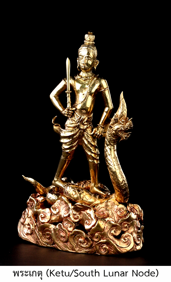 พระเกตุ พระอิศวรทรงสร้างจากพญานาค ๙ ตัว กายสีทองคำทรงนาคเป็นพาหนะ มีวิมานสีดอกบุษบา(เปลวไฟ) ประจำอยู่ในทิศท่ามกลาง บ้างว่าพระเกตุเกิดจากหางของพระราหู ซึ่งขโมยดื่มน้ำอมฤต พระอินทร์โกรธจึงขว้างจักรตัดเอวขาด ด้วยอำนาจแห่งน้ำอมฤตทำให้พระราหูไม่ตาย หางที่ขาดนั้นกลายเป็นพระเกตุ ซึ่งจะไม่เสวยอายุโดยตรง แต่จะเข้าแทรกเพื่อบรรเทาเรื่องร้ายและส่งเสริมในเรื่องดี สัญลักษณ์คือเลข ๙