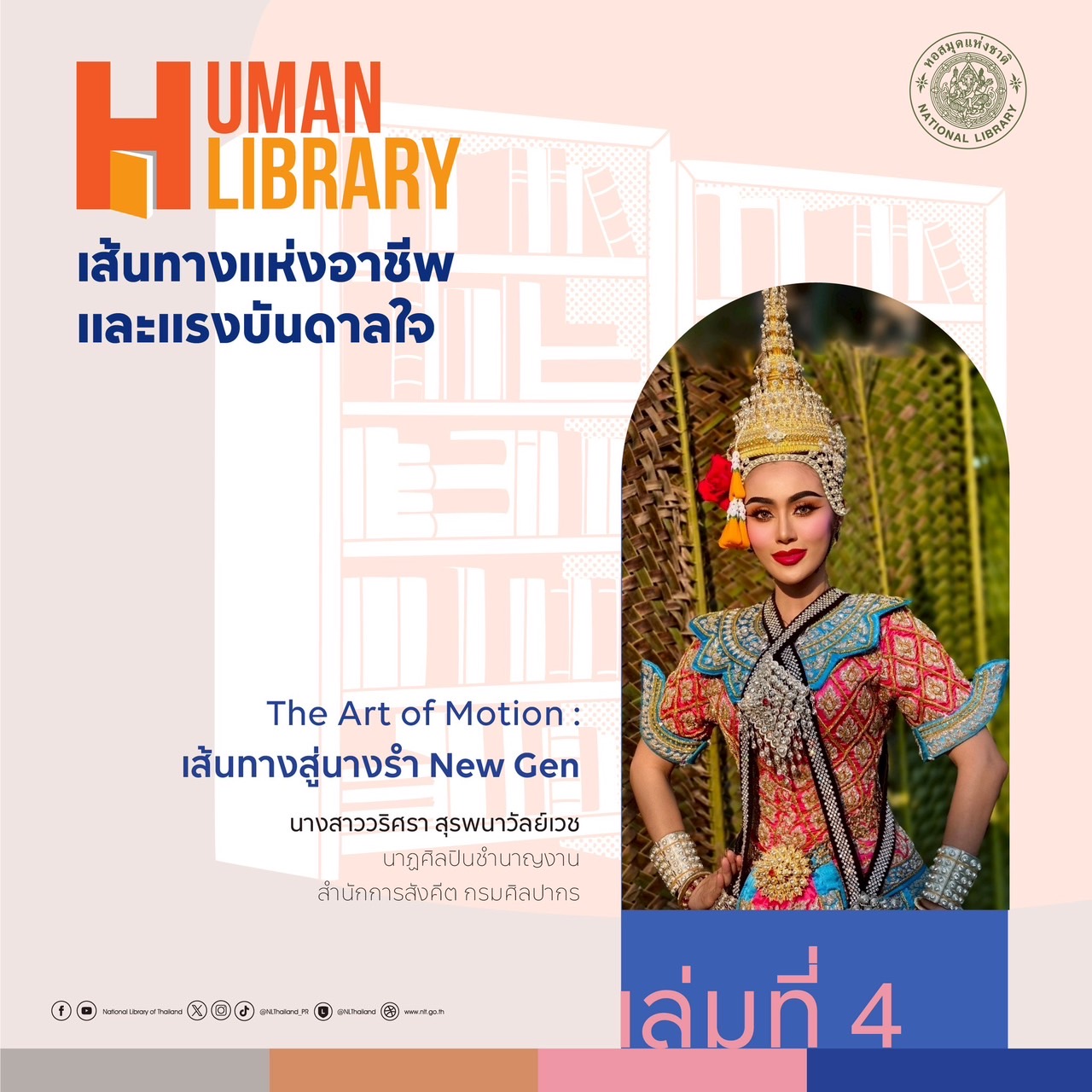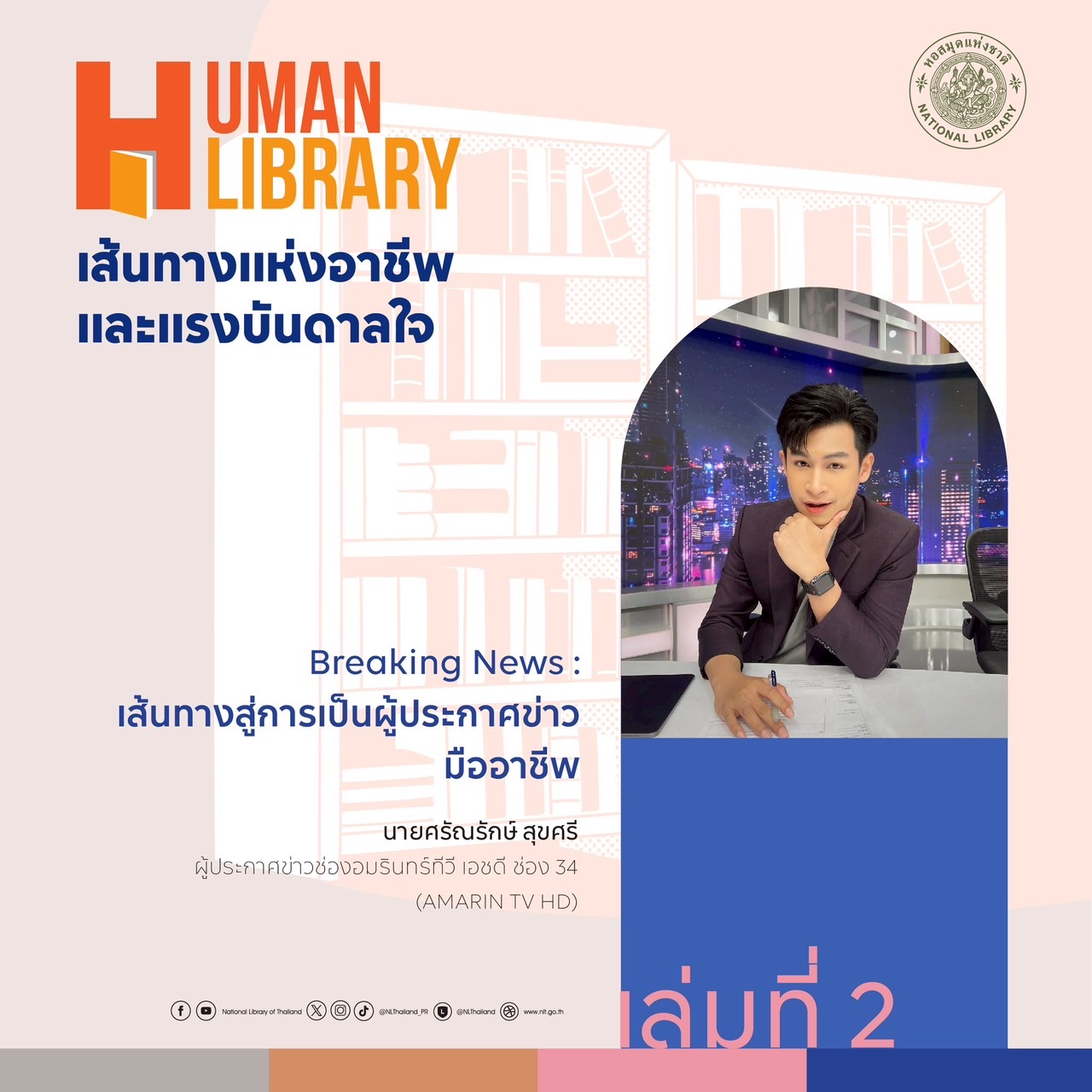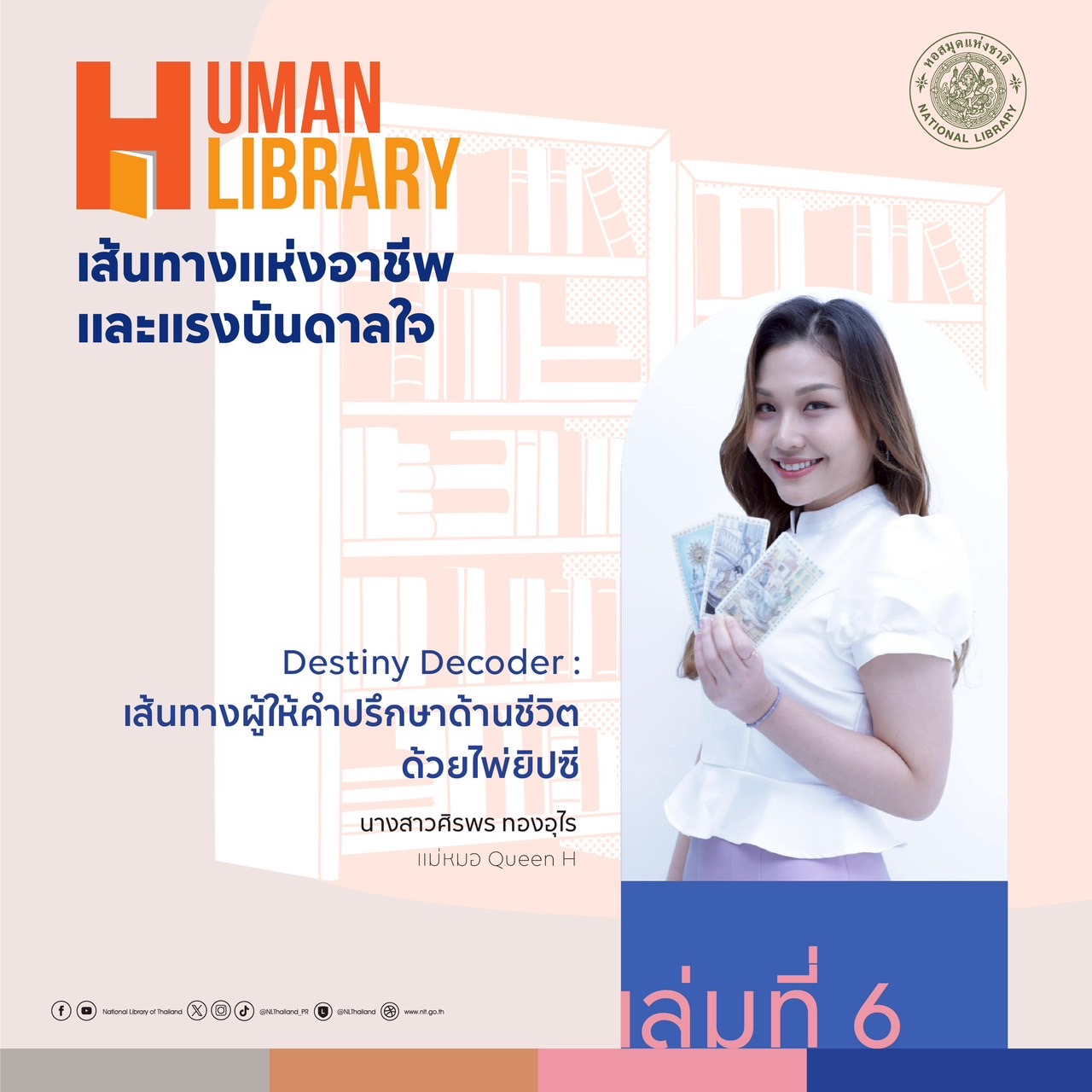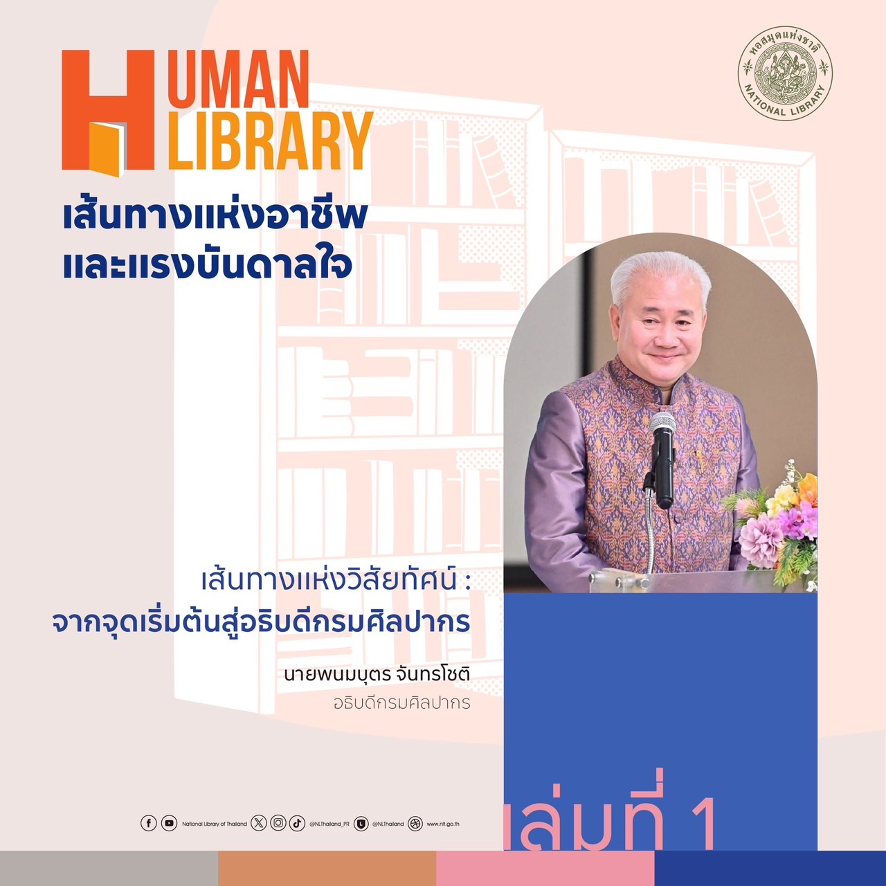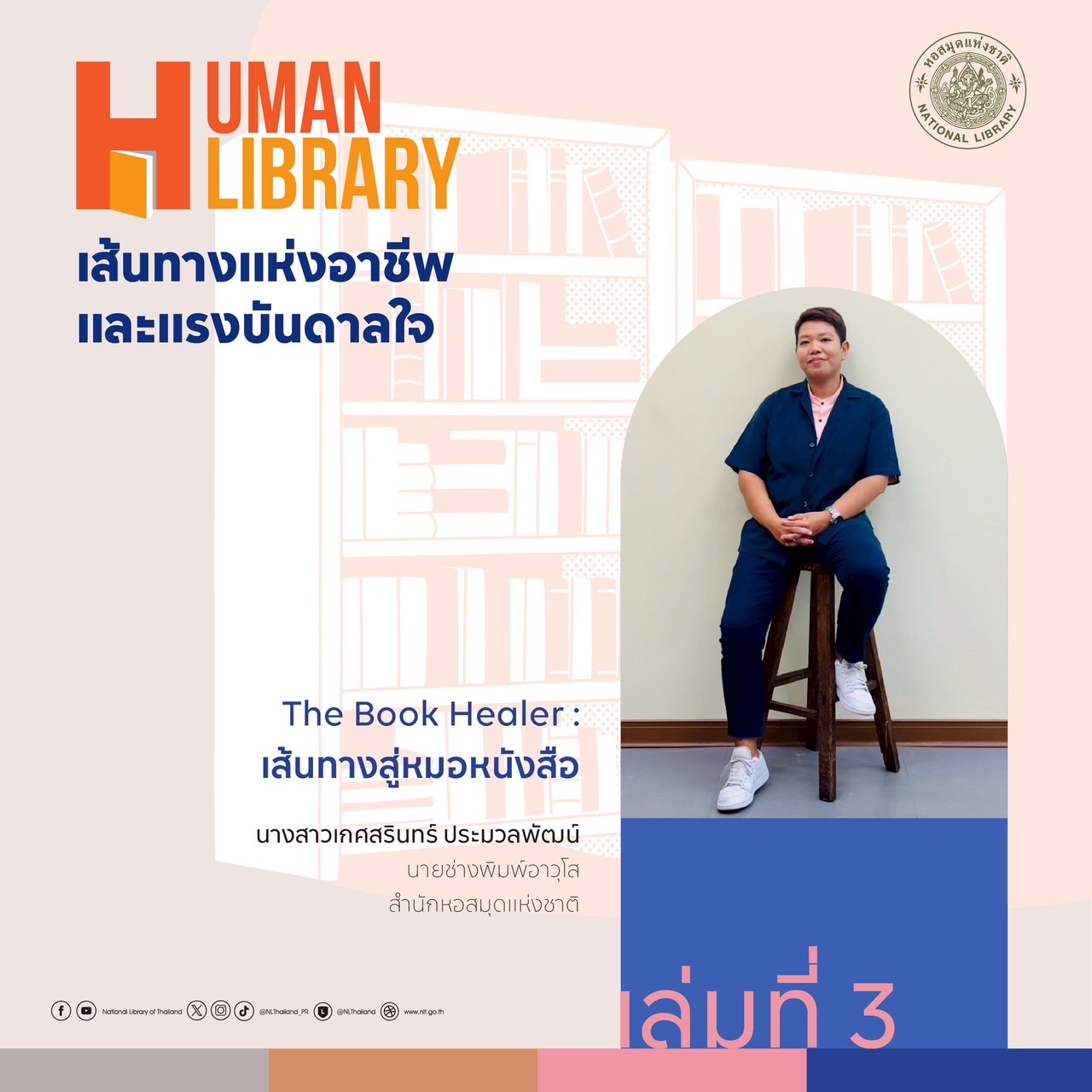 หอสมุดแห่งชาติ ขอเชิญร่วมกิจกรรม "Human Library: เส้นทางแห่งอาชีพและแรงบันดาลใจ" พบกับ Human Book จากหลากหลายสาขาอาชีพ ที่จะมาแบ่งปันประสบการณ์ จุดเริ่มต้น แรงบันดาลใจ และบทเรียนที่ไม่มีในตำรา ร่วมฟังตัวจริงเล่าเรื่องจริงจากสายอาชีพหลากหลาย เปิดโลก เปิดมุมมอง และค้นหา "ตัวคุณ" ไปพร้อมกัน ในพฤหัสบดีที่ 8 พฤษภาคม 2568 ณ ห้องบริการหนังสือทั่วไป อาคาร 1ชั้น 2 หอสมุดแห่งชาติ เวลา 08.30 - 15.00 น.