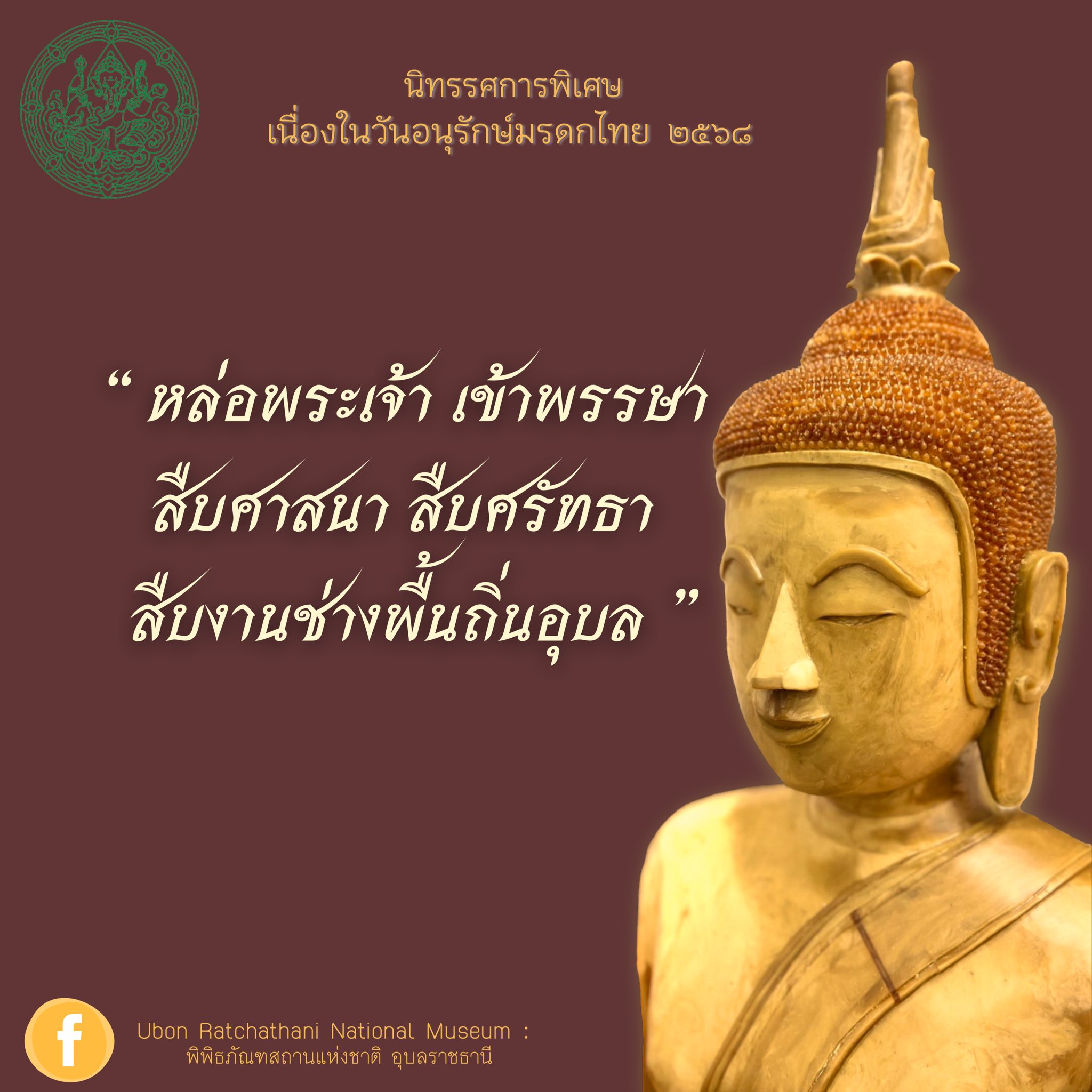 พิพิธภัณฑสถานแห่งชาติ อุบลราชธานี จัดโครงการเสวนาความรู้เชิงปฏิบัติการ นิทรรศการพิเศษเนื่องในวันอนุรักษ์มรดกไทย ประจำปี ๒๕๖๘ เรื่อง “หล่อพระเจ้า เข้าพรรษา สืบศาสนา สืบศรัทธา สืบงานช่างพื้นถิ่นอุบล” เพื่อเป็นการเผยแพร่ข้อมูลความรู้เกี่ยวกับงานช่างหล่อพระพุทธรูปอีสานแบบดั้งเดิมให้แก่ประชาชน ในวันอาทิตย์ที่ ๑๕ มิถุนายน ๒๕๖๘ เวลา ๐๙.๐๐ น. เป็นต้นไป ขอเชิญร่วมฟังการเสวนา เรื่อง “พระพุทธรูป : พุทธศิลป์พื้นถิ่นเมืองอุบล” และการสาธิตเชิงปฏิบัติการหล่อพระพุทธรูปพื้นถิ่นอีสานแบบดั้งเดิม โดยวิทยากร พระภัทรพงษ์ ญาณเมธี ผู้เชี่ยวชาญด้านการปั้นและหล่อพระพุทธรูปแบบดั้งเดิม วัดป่าศิลาอาสน์ ตำบลหนองหิน อำเภอเมือง จังหวัดยโสธร, พระปกรณ์ ชินวโร ผู้ดูแลพิพิธภัณฑ์วัดมณีวนาราม วัดมณีวนาราม ตำบลในเมือง อำเภอเมือง จังหวัดอุบลราชธานี, นายสิทธิโชค พาละพล ช่างหล่อพระพุทธรูป, นางสาวเชาวนี เหล็กกล้า ภัณฑารักษ์ชำนาญการ และนางสาวสิริภา เจริญเขต ภัณฑารักษ์ชำนาญการ เป็นผู้ดำเนินรายการ อีกทั้งยังมีนิทรรศการพิเศษ เรื่อง “หล่อพระเจ้า เข้าพรรษา สืบศาสนา สืบศรัทธา สืบงานช่างพื้นถิ่นอุบล” จัดแสดงให้ชมอีกด้วยประเพณีแห่เทียนเข้าพรรษาของจังหวัดอุบลราชธานี เป็นประเพณีใหญ่ประจำจังหวัด ที่จัดขึ้นอย่างต่อเนื่องทุกปี โดยแต่ละคุ้มวัดจะนำเทียนที่สร้างสรรค์อย่างงดงามมาร่วมแห่และเข้าประกวด เป็นงานบุญใหญ่ของจังหวัดที่เป็นที่รู้จักของนักท่องเที่ยวทั้งชาวไทยและชาวต่างชาติ จึงถือเป็นโอกาสอันดีที่พิพิธภัณฑสถานแห่งชาติ อุบลราชธานีได้จัดกิจกรรมเผยแพร่ความรู้เกี่ยวกับ “งานช่างหล่อพระพุทธรูปอีสานแบบดั้งเดิม” โดยงานหล่อ เป็นหนึ่งในงานช่างสิบหมู่ คือ การสร้างประติมากรรมด้วยการหลอมโลหะให้ละลายเป็นของเหลว แล้วเทเข้าไปในแม่พิมพ์ที่ได้ทำขึ้น เมื่อโลหะคลายความร้อนและคืนตัวแข็งดังเดิม จะเป็นรูปทรงตามแม่พิมพ์นั้น เมื่อแกะแม่พิมพ์ออก จะได้ประติมากรรมตามรูปต้นแบบ งานหล่อเป็นงานที่เกี่ยวเนื่องกับงานปั้น ส่วนใหญ่ช่างหล่อและช่างปั้นมักจะเป็นคนเดียวกัน ซึ่งต้องปั้นต้นแบบจากขี้ผึ้ง การหล่อด้วยกรรมวิธีแบบดั้งเดิมเช่นนี้ เรียกว่า “การหล่อโลหะแบบสูญขี้ผึ้ง (Lost wax) ” กรรมวิธีการปั้นและหล่อโลหะแบบดั้งเดิมนี้ เกิดจากภูมิปัญญาของครูช่างโบราณที่ได้ถ่ายทอดความรู้และประสบการณ์จากรุ่นสู่รุ่น ปัจจุบันงานหล่อและงานปั้นพระพุทธรูปฝีมือช่างพื้นถิ่นภาคตะวันออกเฉียงเหนือแบบดั้งเดิมเริ่มลดน้อยลง อาจเป็นเพราะความเจริญทางด้า