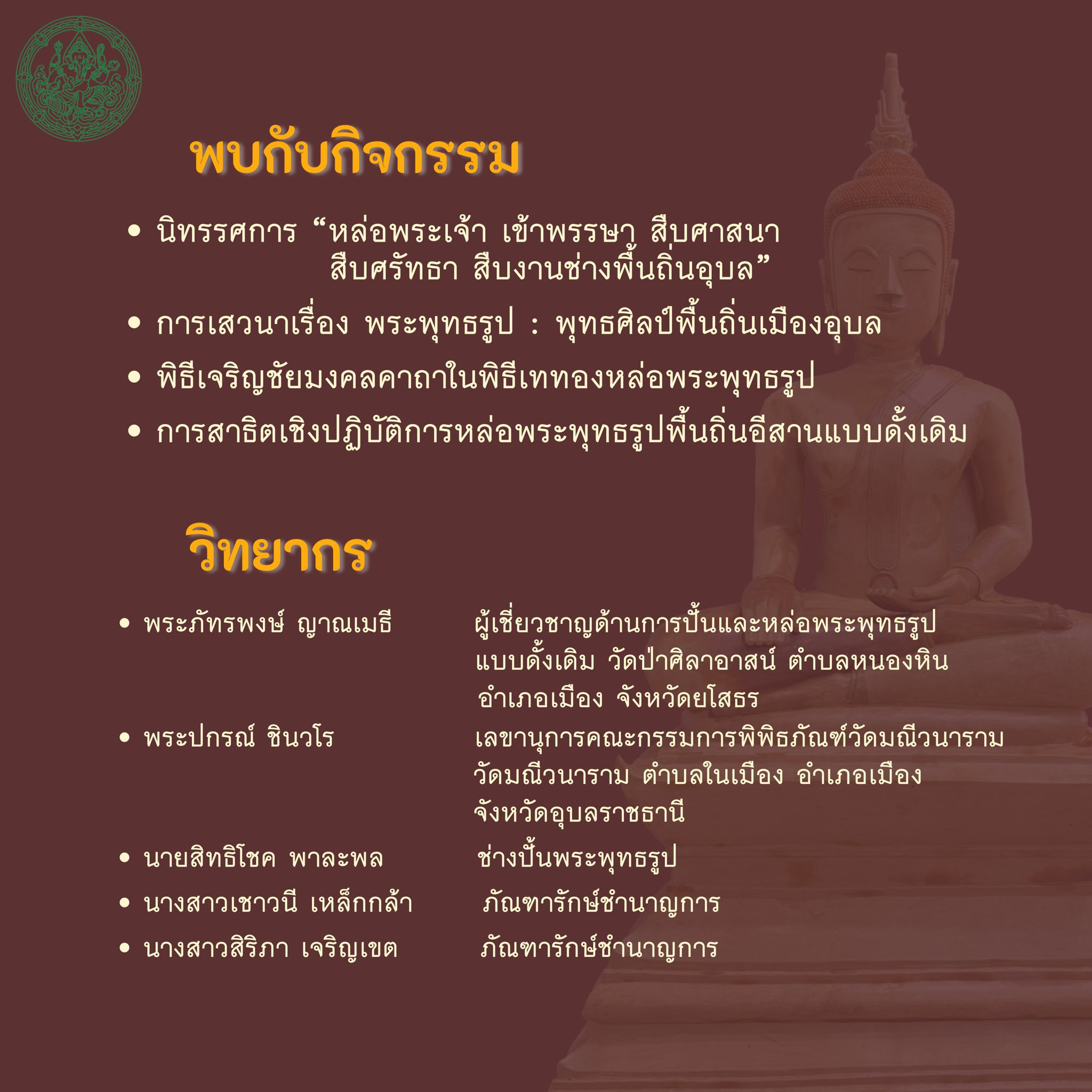 ขอเชิญร่วมกิจกรรมพิเศษ “หล่อพระเจ้า เข้าพรรษา สืบศาสนา สืบศรัทธา สืบงานช่างพื้นถิ่นอุบล” ณ พิพิธภัณฑสถานแห่งชาติ อุบลราชธานี