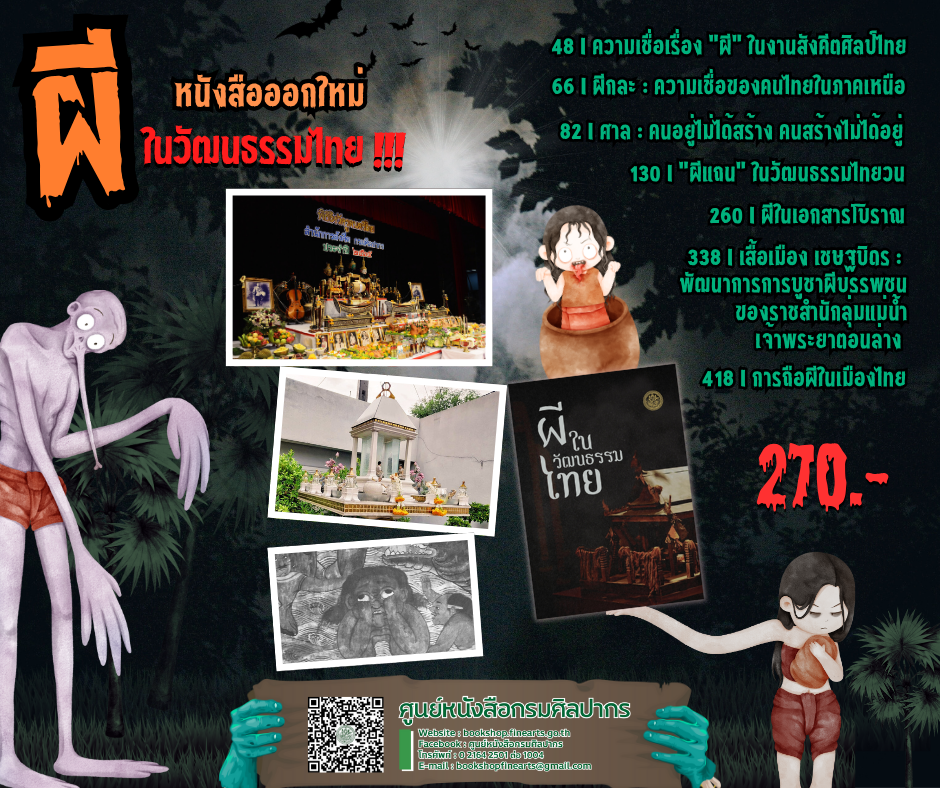 "ผี" ความเชื่อดั้งเดิมที่หยั่งลึกในสังคมไทยมายาวนาน ตั้งแต่ครั้งบรรพกาลกระทั่งปัจจุบัน ดังปรากฏหลักฐานทางโบราณคดี และหลักฐานทางประวัติศาสตร์อย่างต่อเนื่อง ตลอดจนปรากฏในรูปแบบประเพณีพิธีกรรมเกี่ยวเนื่องกับชีวิตทุกช่วงอายุของคนไทย ศูนย์หนังสือกรมศิลปากร ขอแนะนำหนังสือน่าอ่าน เรื่อง “ผีในวัฒนธรรมไทย” เป็นหนังสือที่รวบรวมบทความจากนักวิชาการในหลากหลายสาขา ทั้งด้านคติชนวิทยา นิเทศศาสตร์ โบราณคดี ประวัติศาสตร์ และมานุษยวิทยา จัดพิมพ์โดยสำนักวรรณกรรมและประวัติศาสตร์ มีบทความที่น่าสนใจ อาทิ ความเชื่อเรื่อง “ผี” ในงานสังคีตศิลป์ไทย, ผีกละ: ความเชื่อของคนไทยในภาคเหนือ, ศาล: คนอยู่ไม่สร้าง คนสร้างไม่ได้อยู่, “ผีแถน” ในวัฒนธรรมไทยวน, ผีในเอกสารโบราณ, เสื้อเมือง เชษฐบิดร: พัฒนาการการบูชาผีบรรพชนของราชสำนักลุ่มแม่น้ำเจ้าพระยาตอนล่าง, การถือผีในเมืองไทย จำหน่ายเล่มละ ๒๗๐ บาท