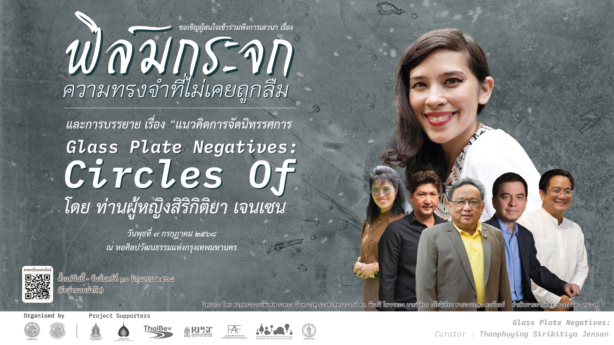 สำนักหอจดหมายเหตุแห่งชาติ ขอเชิญเข้าร่วมฟังการเสวนา เรื่อง “ฟิล์มกระจกมรดกความทรงจำที่ไม่เคยถูกลืม” วิทยากรโดย ศาสตราจารย์พิเศษ ธงทอง จันทรางศุ รองศาสตราจารย์ ดร.พีระศรี โพวาทอง นายนิติกร กรัยวิเชียร นายอรรถดา คอมันตร์ ดำเนินรายการโดย นางภาวิดา สมวงศ์ และการบรรยาย เรื่อง “แนวคิดการจัดนิทรรศการ Glass Plate Negatives : Circles of Centres” โดย ท่านผู้หญิงสิริกิติยา เจนเซน ในวันพุธที่ ๙ กรกฎาคม ๒๕๖๘ เวลา ๑๓.๐๐ น. ณ ห้องออดิทอเรียม ชั้น ๕ หอศิลปวัฒนธรรมแห่งกรุงเทพมหานคร ผู้สนใจสามารถลงทะเบียนทางออนไลน์ผ่าน QR CODE หรือทาง https://qr.me-qr.com/jM53ilxi ตั้งแต่วันนี้ - วันจันทร์ที่ ๓๐ มิถุนายน ๒๕๖๘ (รับจำนวนจำกัด) ประกาศรายชื่อผู้ร่วมฟังการเสวนา วันพุธที่ ๒ กรกฎาคม ๒๕๖๘ ทางเฟซบุ๊ก “สำนักหอจดหมายเหตุแห่งชาติ”