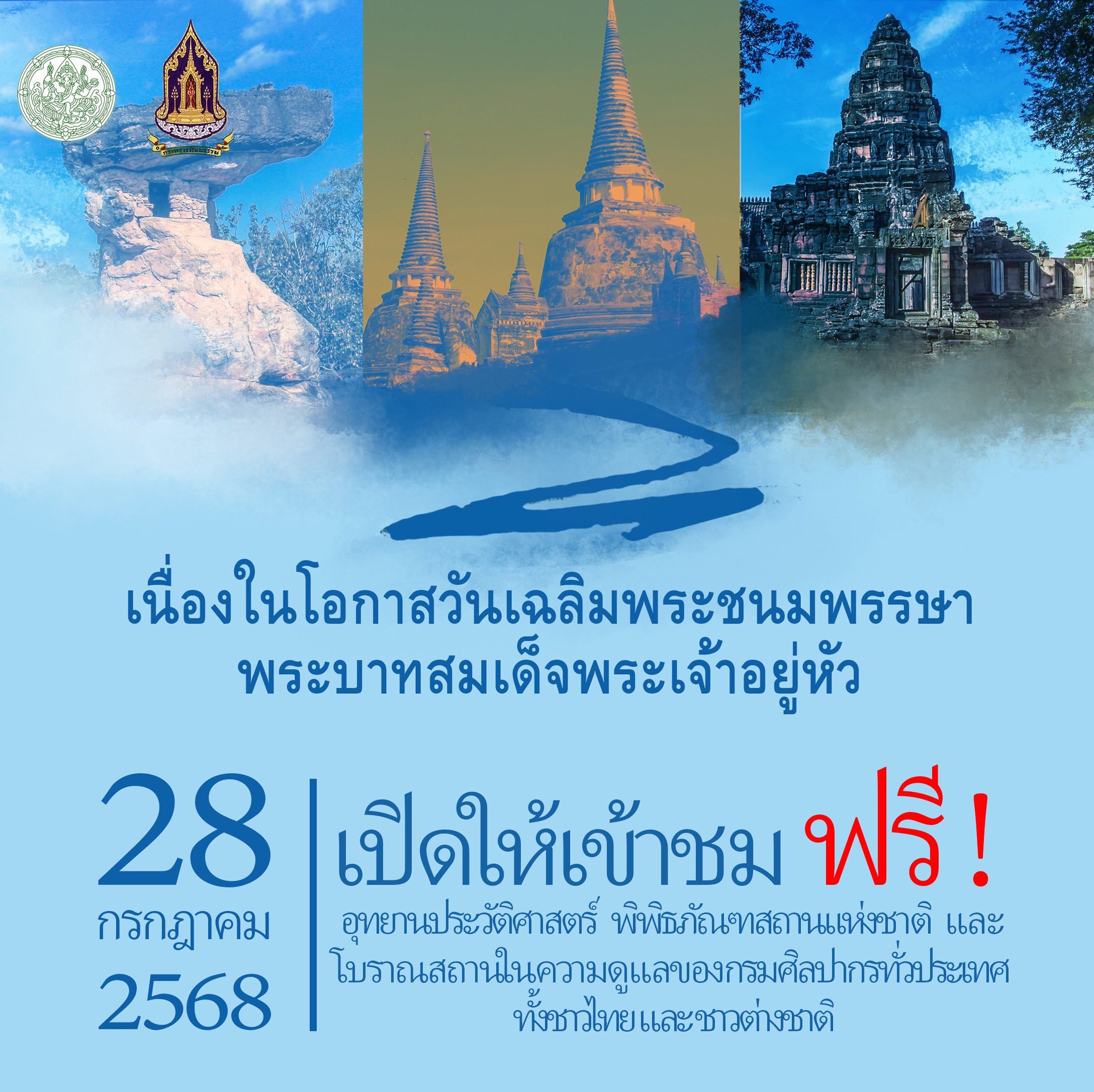 ๑. งดเก็บค่าเข้าชมอุทยานประวัติศาสตร์ พิพิธภัณฑสถานแห่งชาติ และโบราณสถานที่อยู่ในความดูแลของกรมศิลปากรทั่วประเทศ ทั้งชาวไทยและชาวต่างชาติ ในวันที่ ๒๘ กรกฎาคม ๒๕๖๘