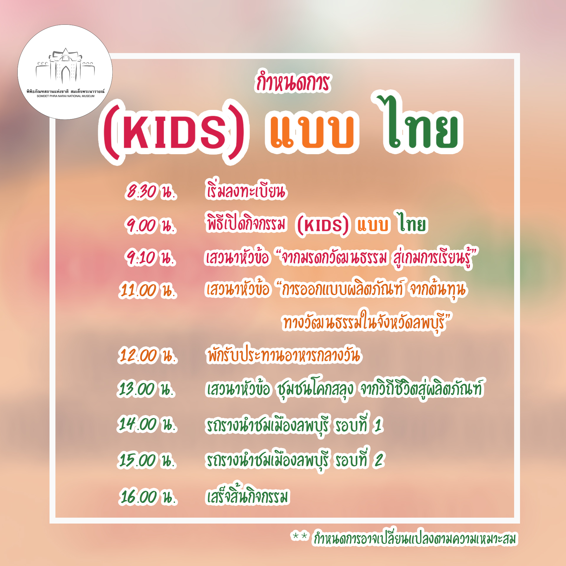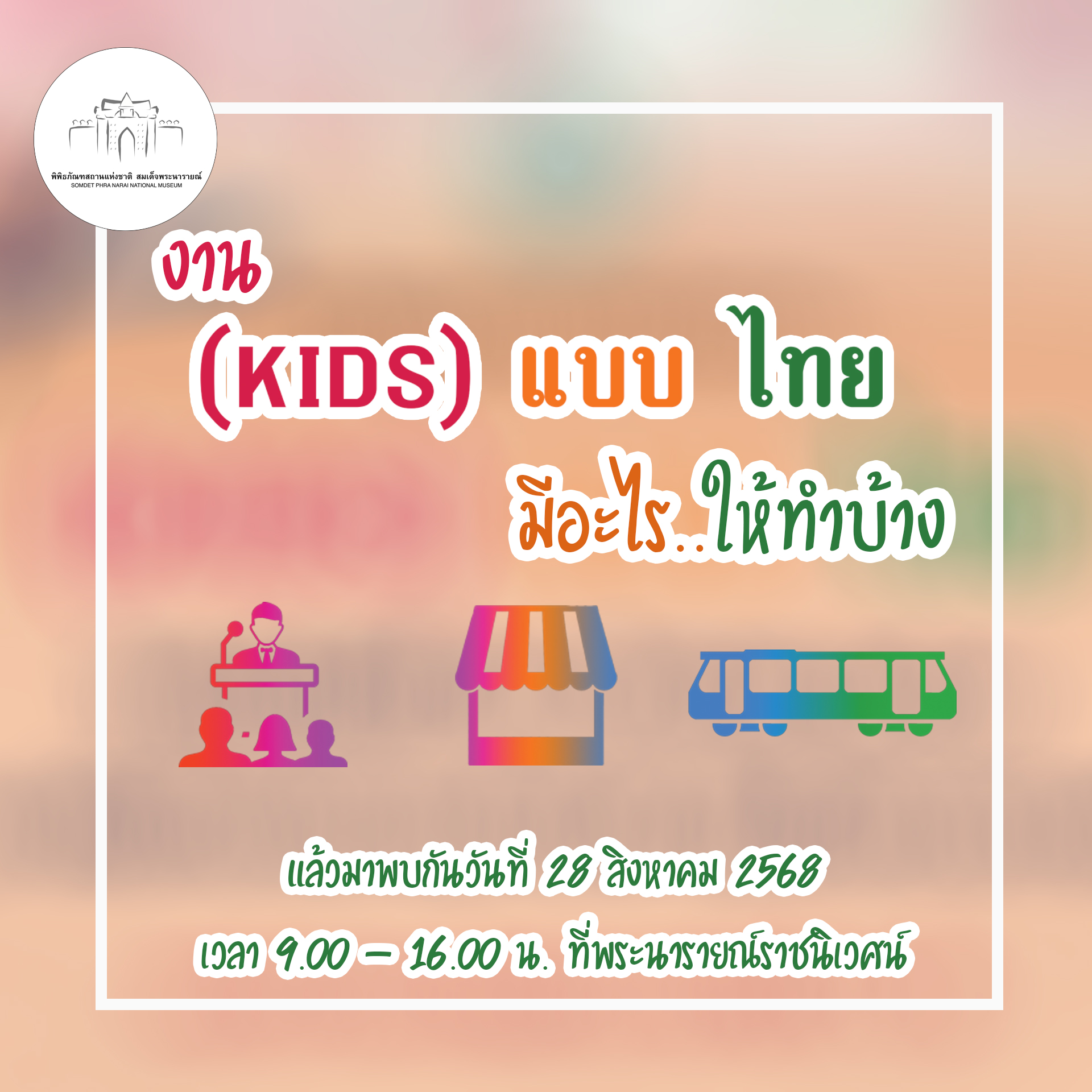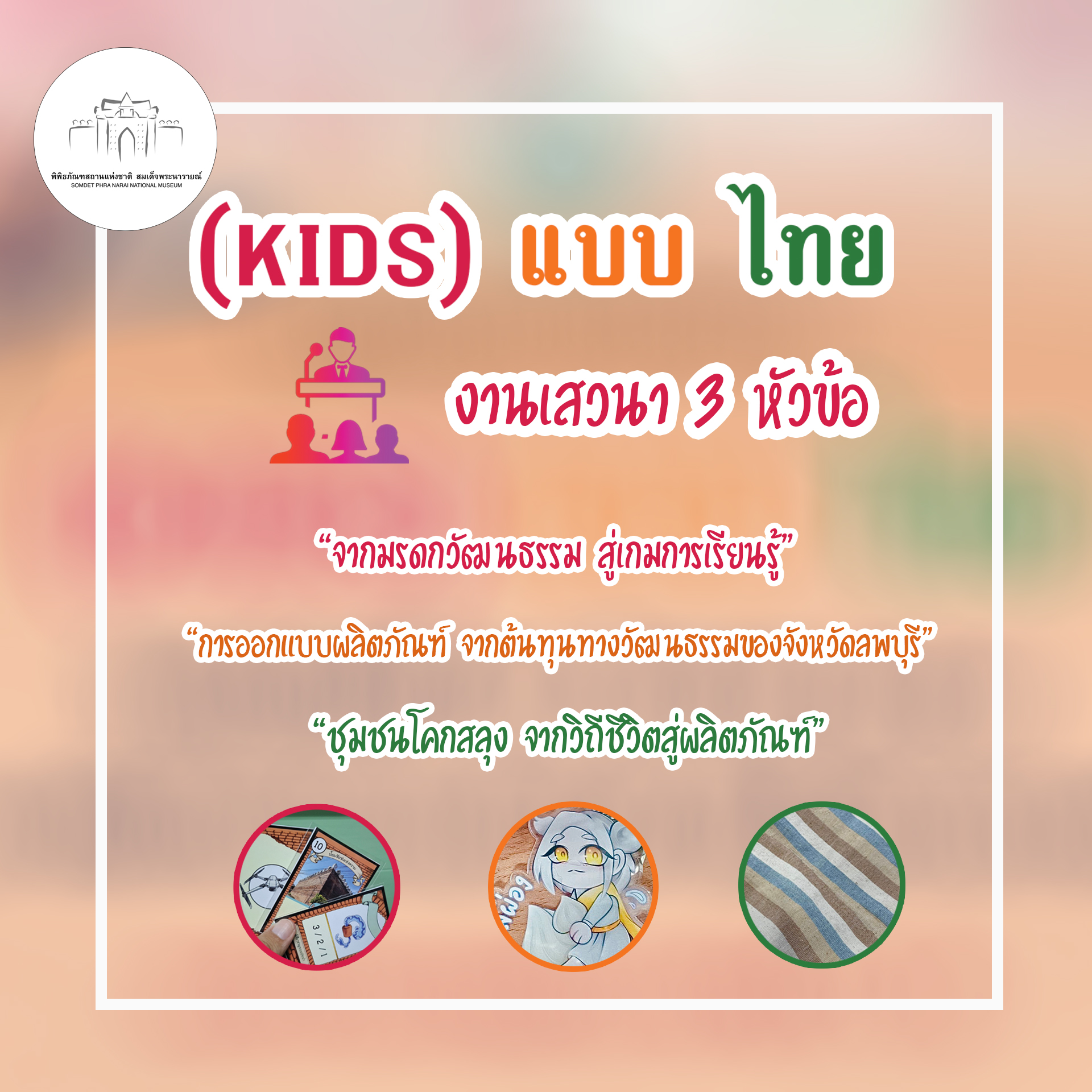 พิพิธภัณฑสถานแห่งชาติ สมเด็จพระนารายณ์ ขอเชิญชวนทุกท่านร่วมงาน (kids) แบบ ไทย ในวันพฤหัสบดีที่ 28 สิงหาคม 2568 เวลา 09.00 - 16.00 น. ณ พระนารายณ์ราชนิเวศน์ พิพิธภัณฑสถานแห่งชาติ สมเด็จพระนารายณ์ จังหวัดลพบุรี ภายในงานมีกิจกรรม ดังนี้ - การเสวนา 3 หัวข้อ ได้แก่ 1.”จากมรดกวัฒนธรรม สู่เกมการเรียนรู้” 2. “การออกแบบผลิตภัณฑ์ จากต้นทุนทางวัฒนธรรมในจังหวัดลพบุรี” 3. “ชุมชนโคกสลุง จากวิถีชีวิตสู่ผลิตภัณฑ์”