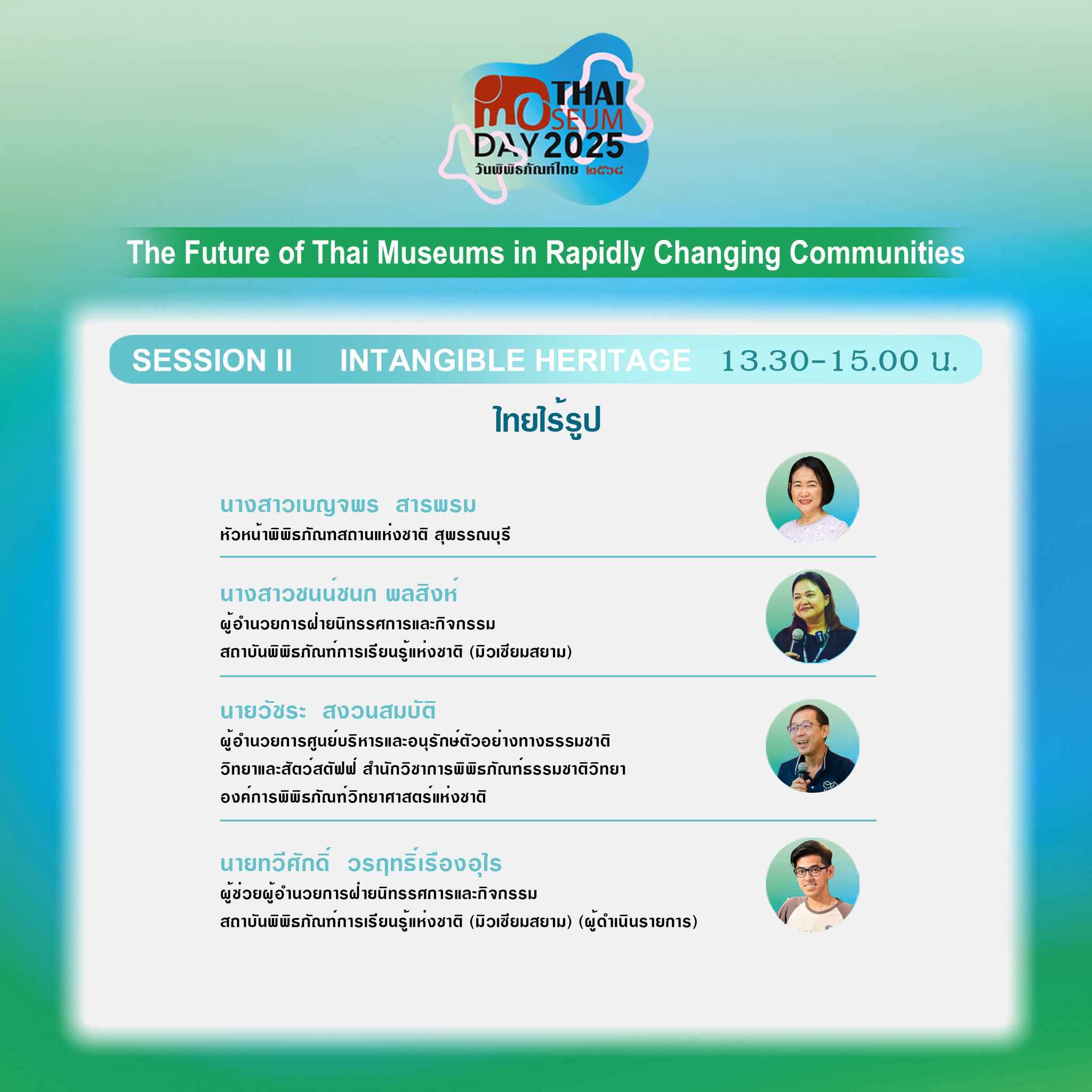 เวลา 13.30 - 15.00 น. พบกิจกรรม [Stage] สัมผัสประวัติศาสตร์ที่ไม่ใช่แค่การอ่าน แต่ผ่านประสาทสัมผัสด้านอื่นๆ เพื่อสร้างประสบการณ์ที่น่าจดจำ มาร่วมหาคำตอบได้กับกิจกรรมเนื่องในวันพิพิธภัณฑ์ไทย 2568 การเสวนาในหัวข้อ "ไทยไร้รูป" วิทยากรโดย