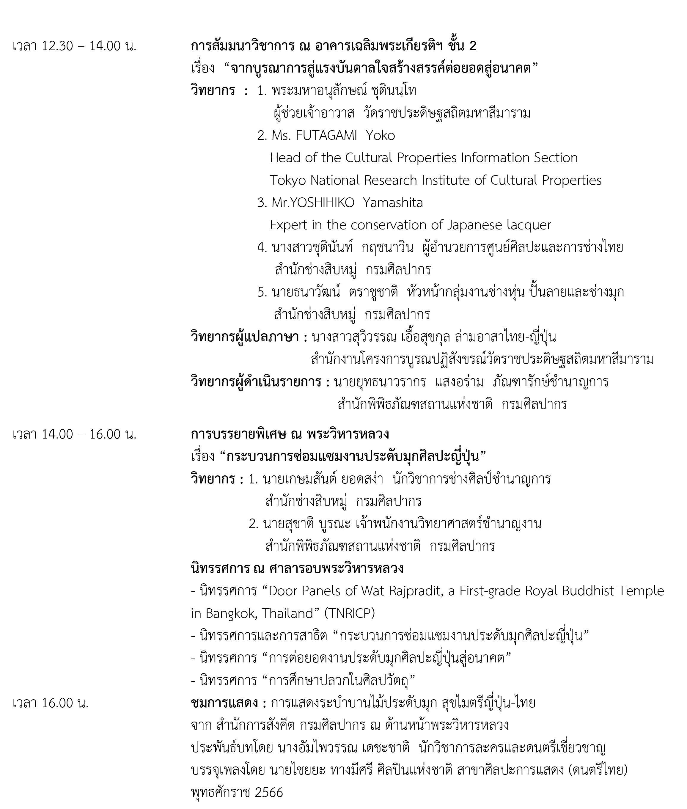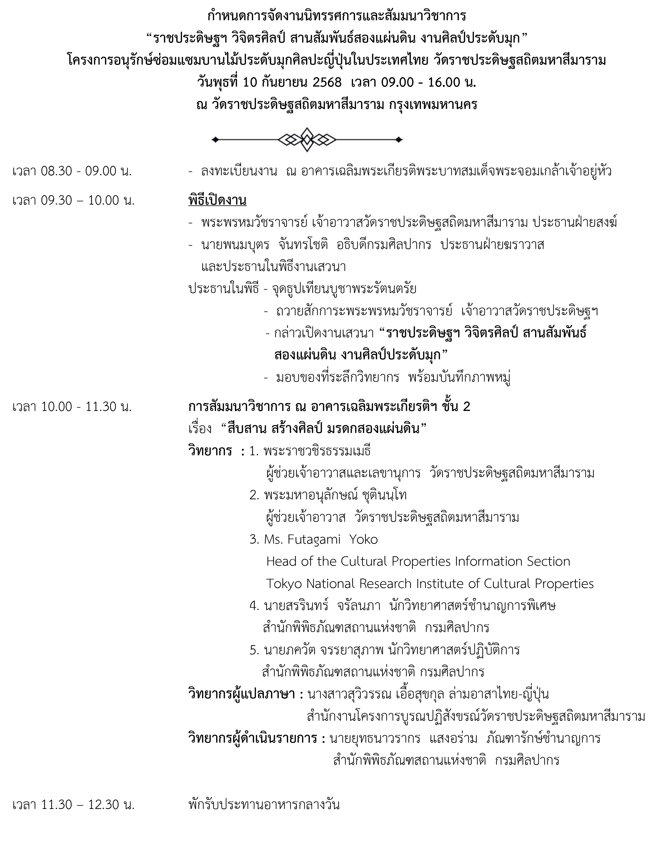 กรมศิลปากร โดยสำนักช่างสิบหมู่ ภายใต้ความร่วมมือกับวัดราชประดิษฐสถิตมหาสีมาราม และสถาบันวิจัยมรดกทางวัฒนธรรมแห่งชาติ กรุงโตเกียว ประเทศญี่ปุ่น ขอเชิญชมนิทรรศการและร่วมฟังการสัมมนาวิชาการ เรื่อง “ราชประดิษฐฯ วิจิตรศิลป์ สานสัมพันธ์สองแผ่นดิน งานศิลป์ประดับมุก” ในวันพุธที่ 10 กันยายน 2568 เวลา 09.00 – 16.00 น. ณ วัดราชประดิษฐสถิตมหาสีมาราม กรุงเทพมหานคร ผู้สนใจสามารถลงทะเบียนออนไลน์ได้ที่ https://forms.gle/NP3Cu2D1hgW9jAyq7