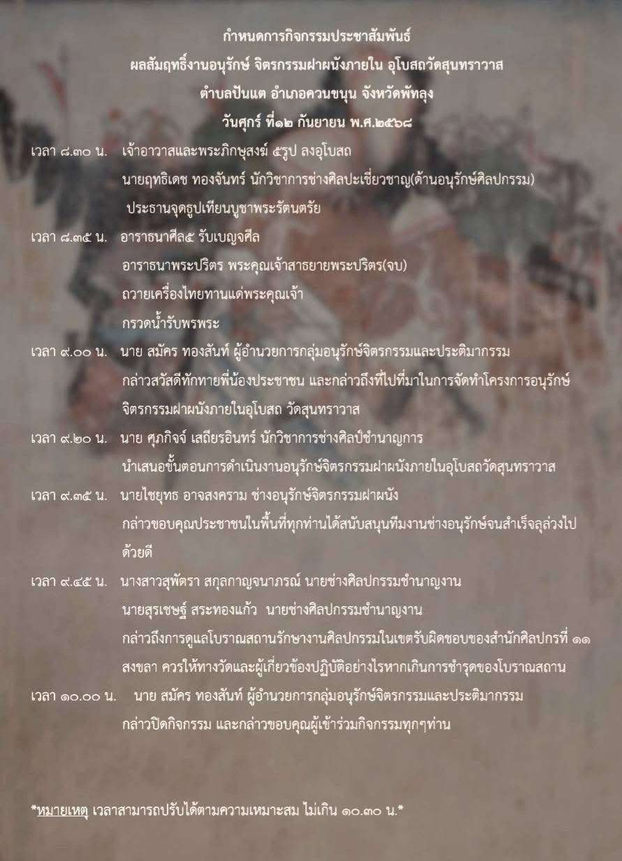 ขอเชิญฟังผลสัมฤทธิงานอนุรักษ์จิตรกรรมฝาผนังภายในอุโบสถวัดสุนทราวาส จังหวัดพัทลุง