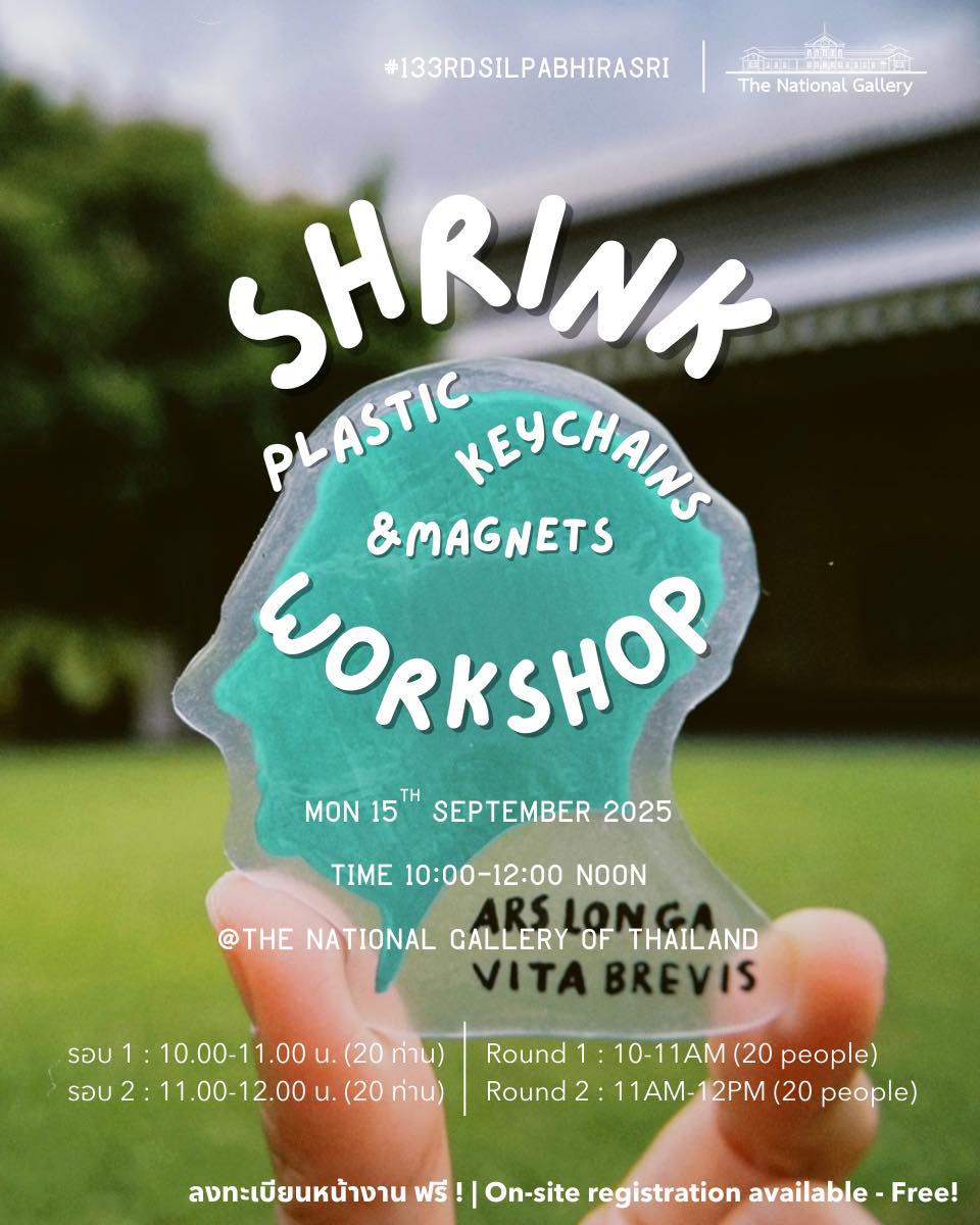 พิพิธภัณฑสถานแห่งชาติ หอศิลป ชวนกันมาออกแบบพวงกุญแจและแม่เหล็กสุดเก๋ จากแผ่นพลาสติกหดในรูปแบบของตัวเอง! ในงานวันศิลป์ พีระศรี ปีนี้ มาร่วมสนุกใน WORKSHOP Shrink Plastic Keychains & Magnets วันที่ 15 กันยายน 2568 กิจกรรมแบ่งเป็น 2 รอบ ได้แก่ รอบ 1 เวลา 10.00 - 11.00 น. (จำนวนจำกัด 20 ท่าน) รอบ 2 เวลา 11.00 - 12.00 น. (จำนวนจำกัด 20 ท่าน) ลงทะเบียนหน้างาน ฟรี!_______________________________________
