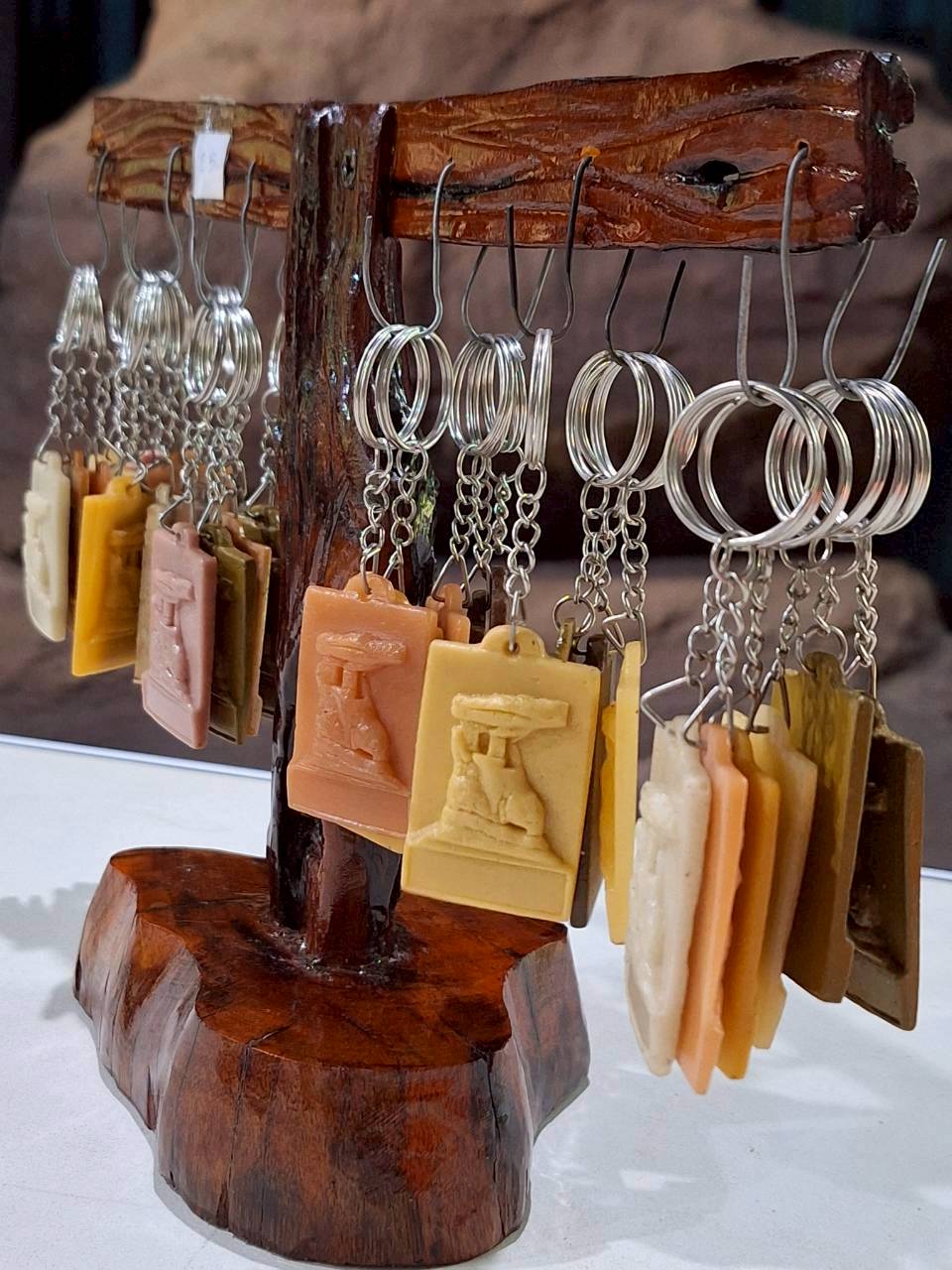 พวงกุญแจหอนางอุสา ทำจากไม้อัด มีทั้งแบบเป็นรูปภาพสวยงาม และแบบยิงเลเซอร์ ราคา 25 บาท
