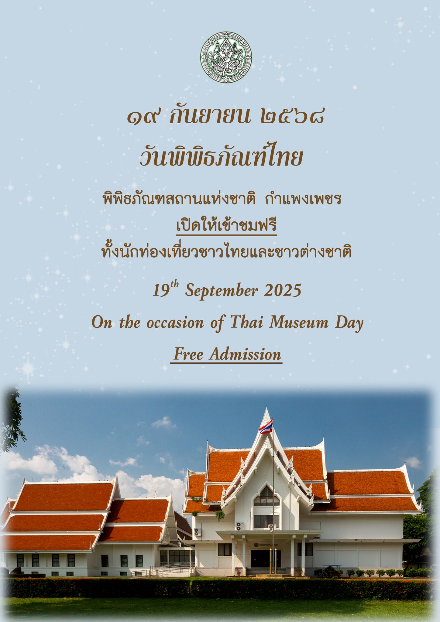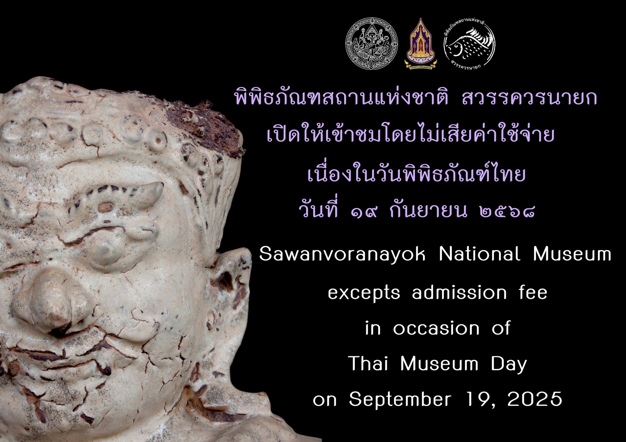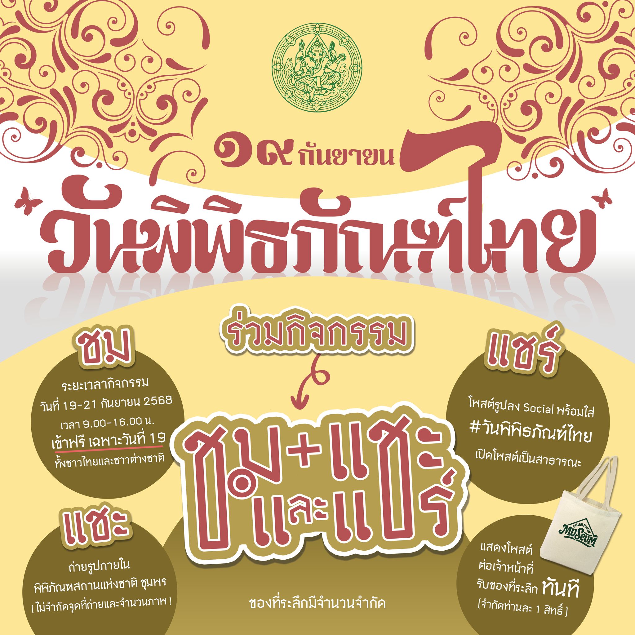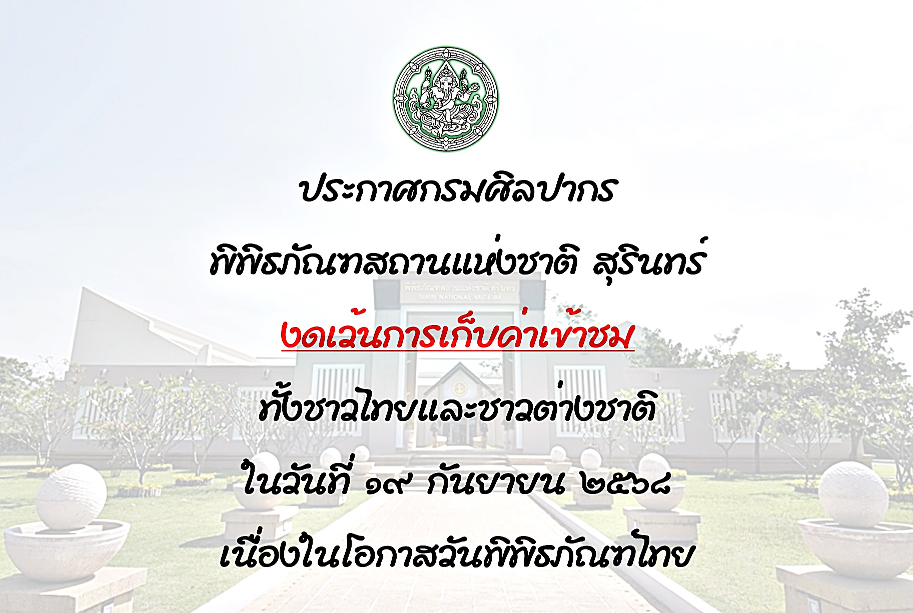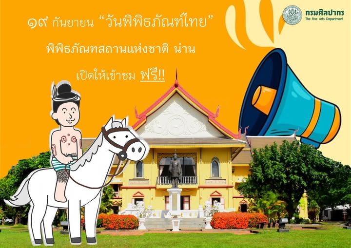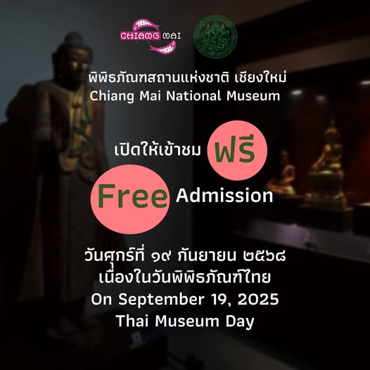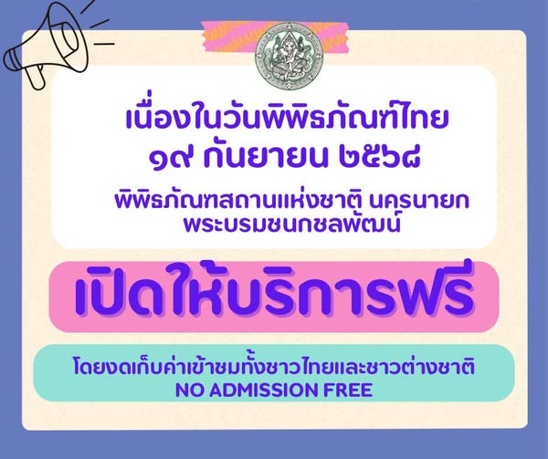 กรมศิลปากรเปิดให้ประชาชนเข้าชมพิพิธภัณฑสถานแห่งชาติในสังกัด ทุกแห่งทั่วประเทศ เนื่องในวันพิพิธภัณฑ์ไทย ในวันที่ ๑๙ กันยายน ๒๕๖๘ เวลา ๐๙.๐๐ - ๑๖.๐๐ น. โดยยกเว้นค่าธรรมเนียมเข้าชม (ฟรี)