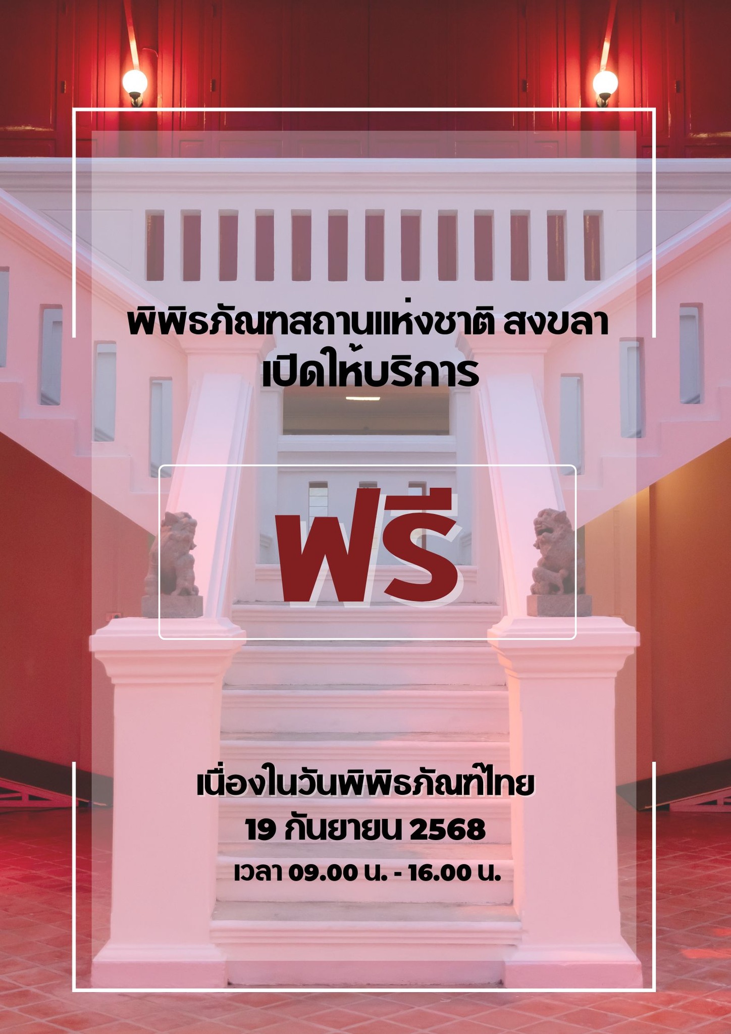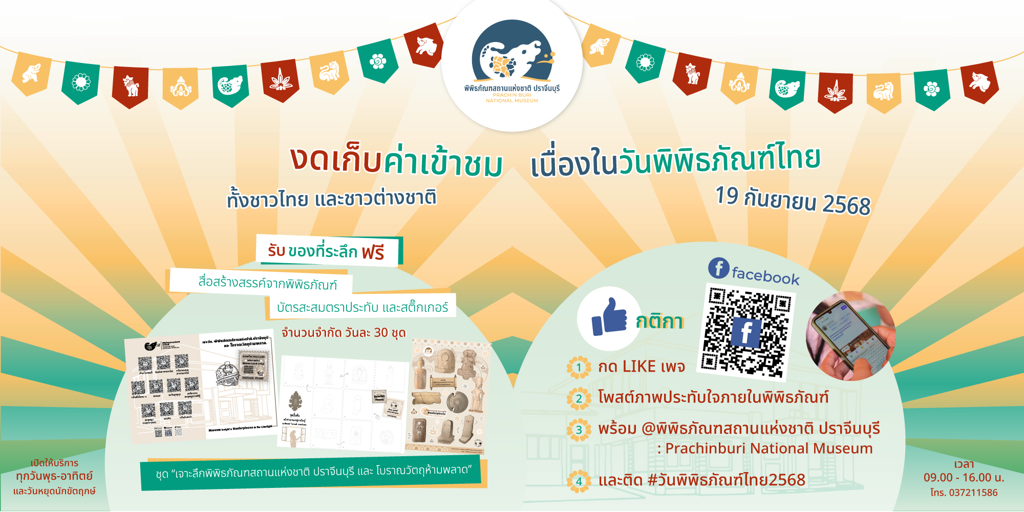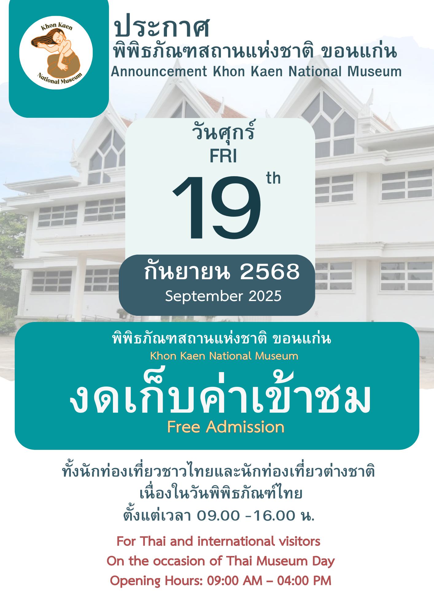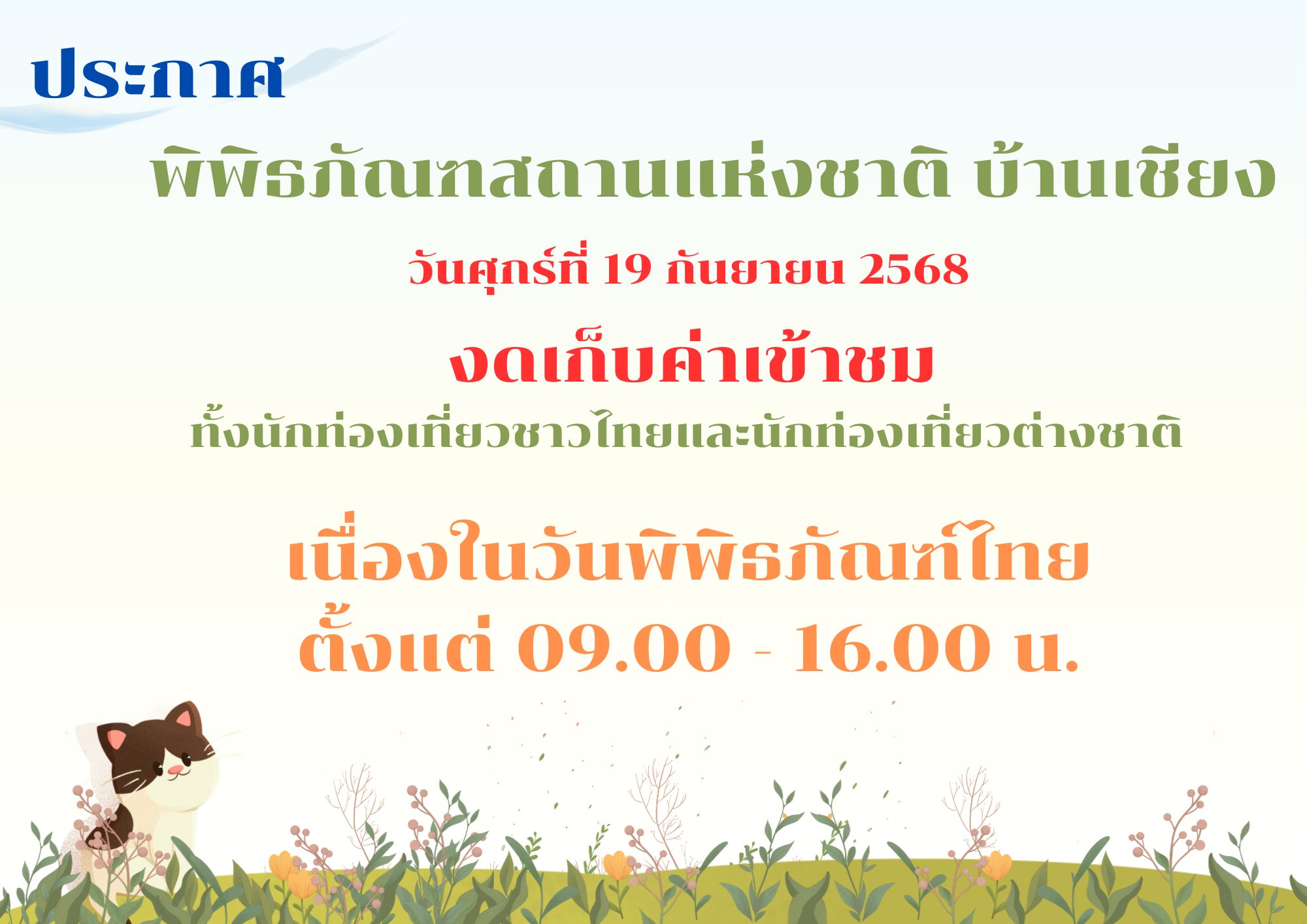 กรมศิลปากรเปิดให้ประชาชนเข้าชมพิพิธภัณฑสถานแห่งชาติในสังกัด ทุกแห่งทั่วประเทศ เนื่องในวันพิพิธภัณฑ์ไทย ในวันที่ ๑๙ กันยายน ๒๕๖๘ เวลา ๐๙.๐๐ - ๑๖.๐๐ น. โดยยกเว้นค่าธรรมเนียมเข้าชม (ฟรี)