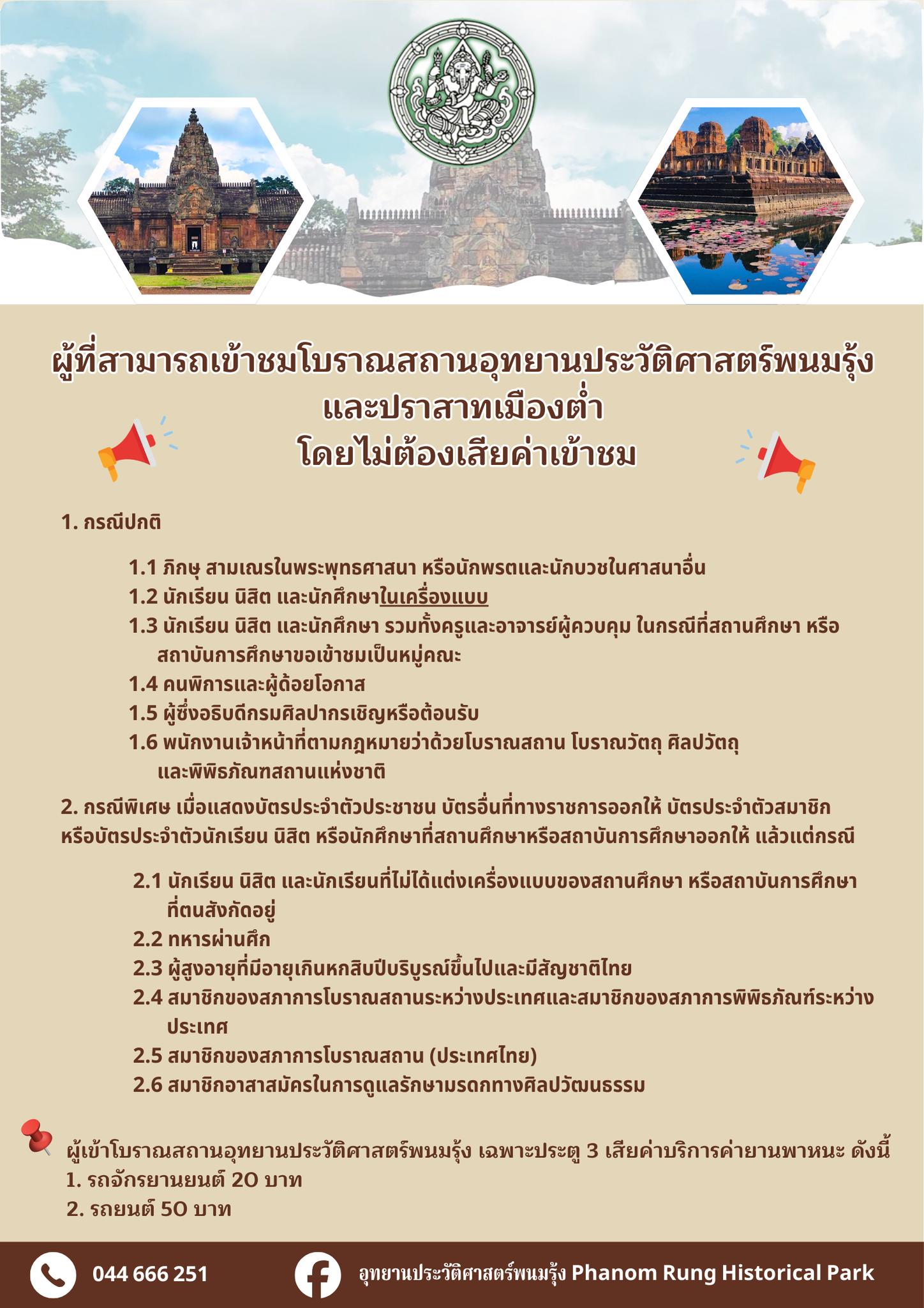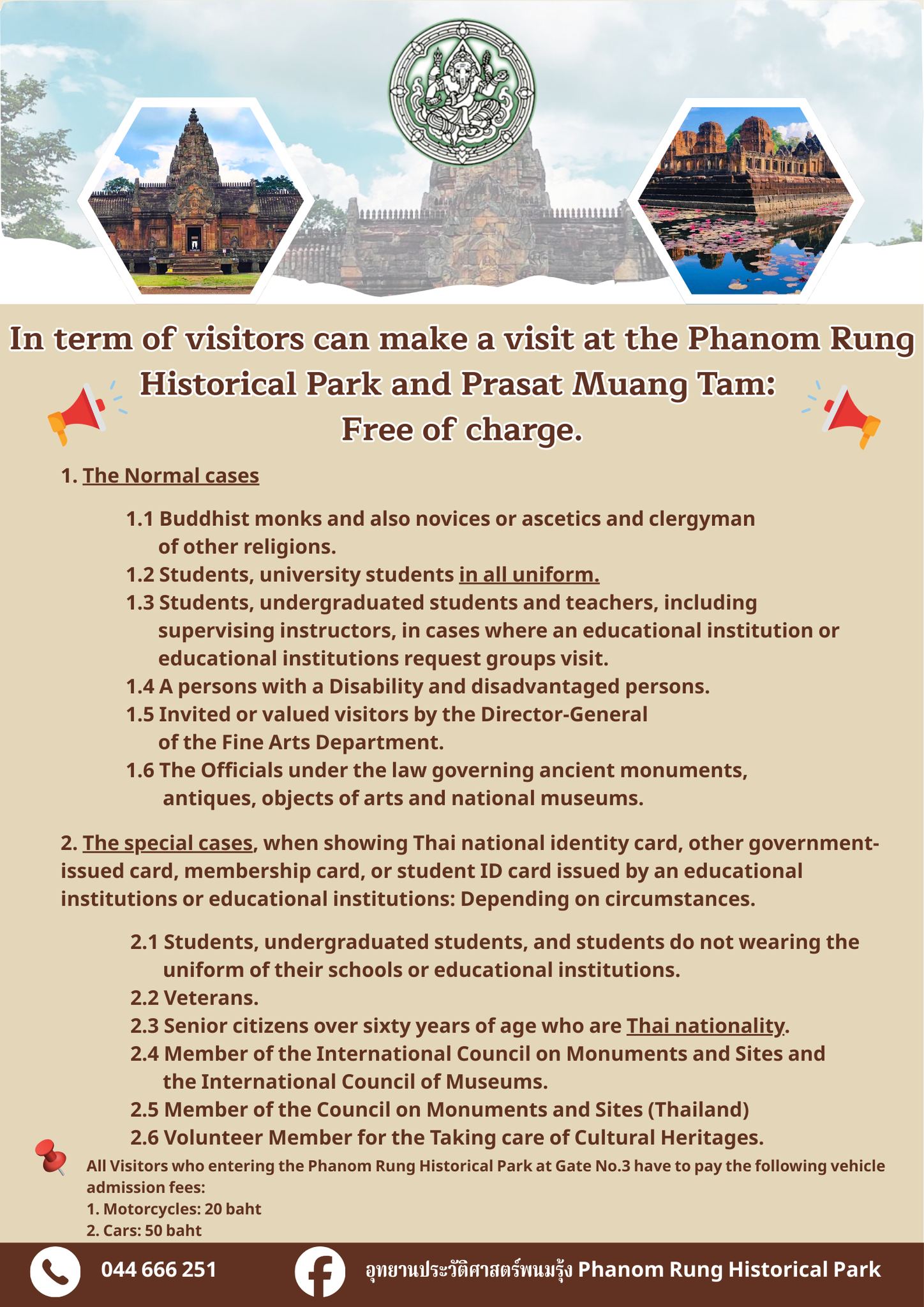 In term of visitors can make a visit at the Phanom Rung Historical Park and Prasat Muang Tam: Free of charge.