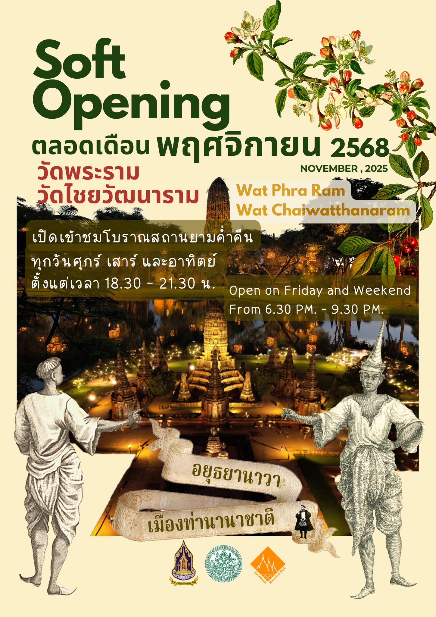 นับถอยหลังอีก 7 วันเท่านั้น!!! อุทยานประวัติศาสตร์พระนครศรีอยุธยา ขอเชิญชวนประชาชนร่วมงาน "อยุธยานาวา เมืองท่านานาชาติ" กิจกรรมท่องเที่ยวโบราณสถานยามค่ำคืนที่ปังที่สุดในนครประวัติศาสตร์พระนครศรีอยุธยา ณ วัดไชยวัฒนาราม วัดพระราม พระราชวังจันทรเกษม และพิพิธภัณฑสถานแห่งชาติ เจ้าสามพระยา เตรียมพบกับกิจกรรมช่วงที่ 1 Soft Opening ตลอดเดือนพฤศจิกายน 2568 (ระหว่างวันที่ 1-30 พฤศจิกายน 2568) เปิดเข้าชมโบราณสถานยามค่ำคืน วัดพระรามและวัดไชยวัฒนาราม ทุกวันศุกร์ - เสาร์ และอาทิตย์ เวลา 18.30 - 21.00 น. (ชมโบราณสถานได้ถึง 21.30 น.) ขอเชิญทุกท่านมารับลมหนาวด้วยกันที่อยุธยา ในงาน "อยุธยานาวา เมืองท่านานาชาติ" สอบถามเพิ่มเติม โทร. 0 3524 2525 Facebook: อุทยานประวัติศาสตร์พระนครศรีอยุธยา Ayutthaya Historical Park https://www.facebook.com/AY.HI.PARK อีเมล ayh_hispark@hotmail.com