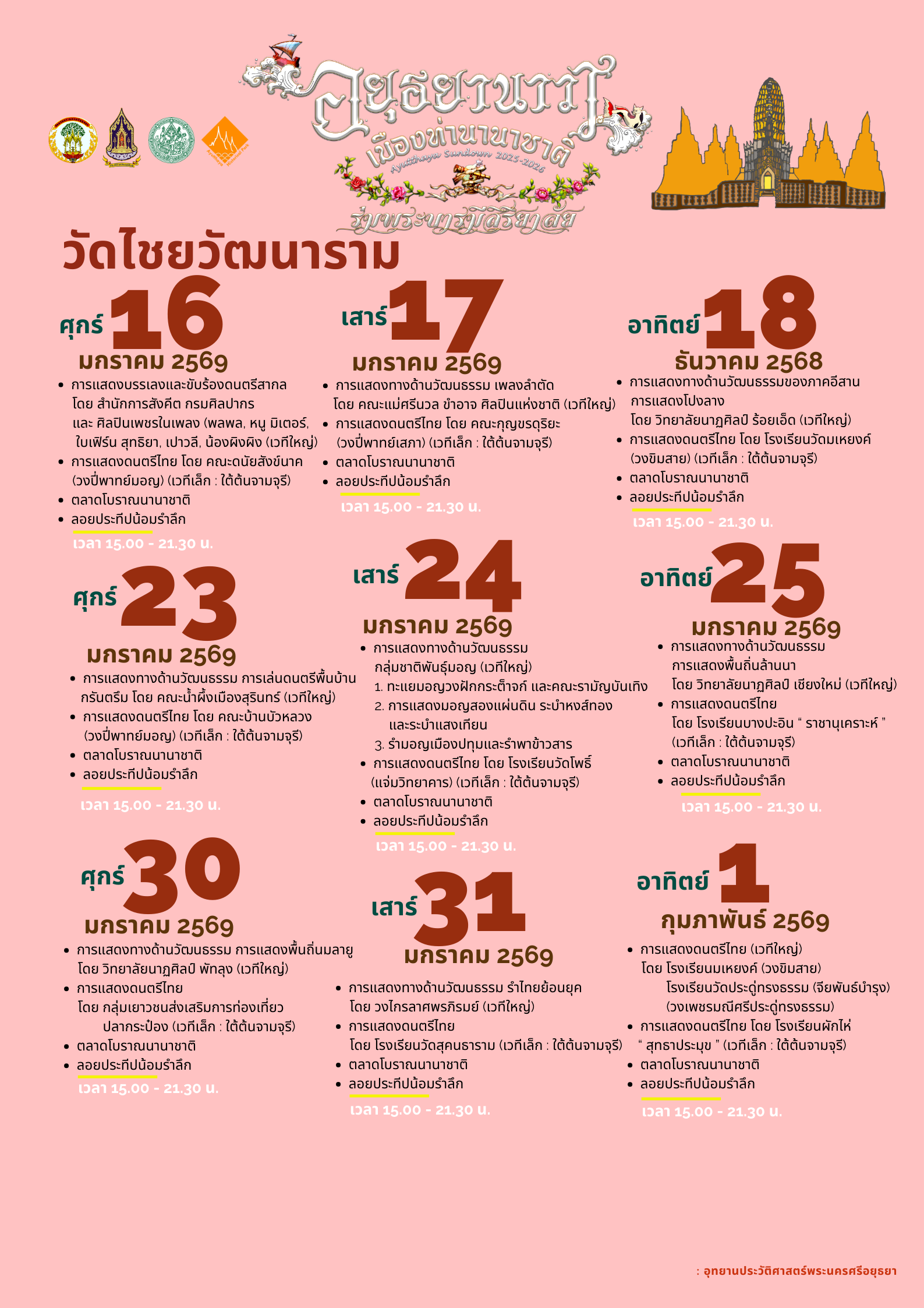 ตารางกิจกรรม “อยุธยานาวา เมืองท่านานาชาติ ร่มพระบารมีสิริยาลัย” ณ วัดไชยวัฒนาราม