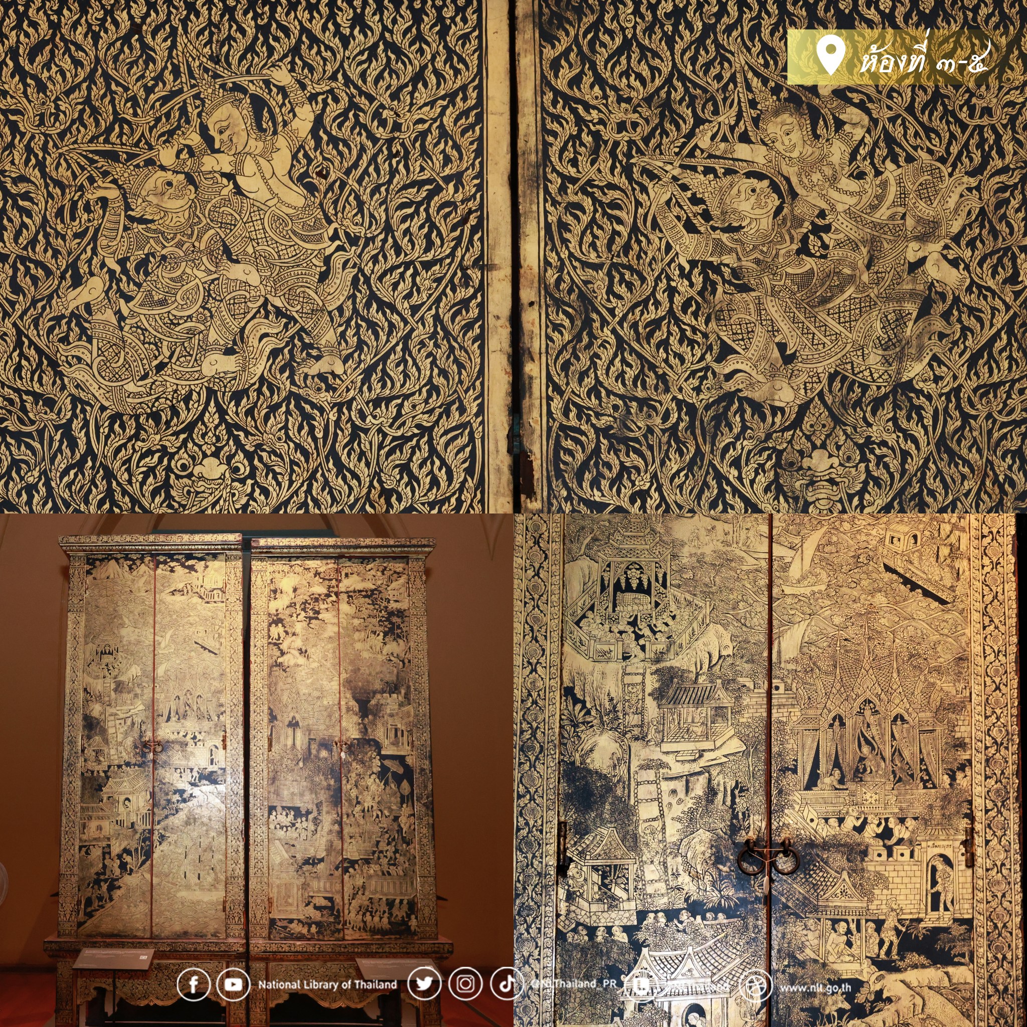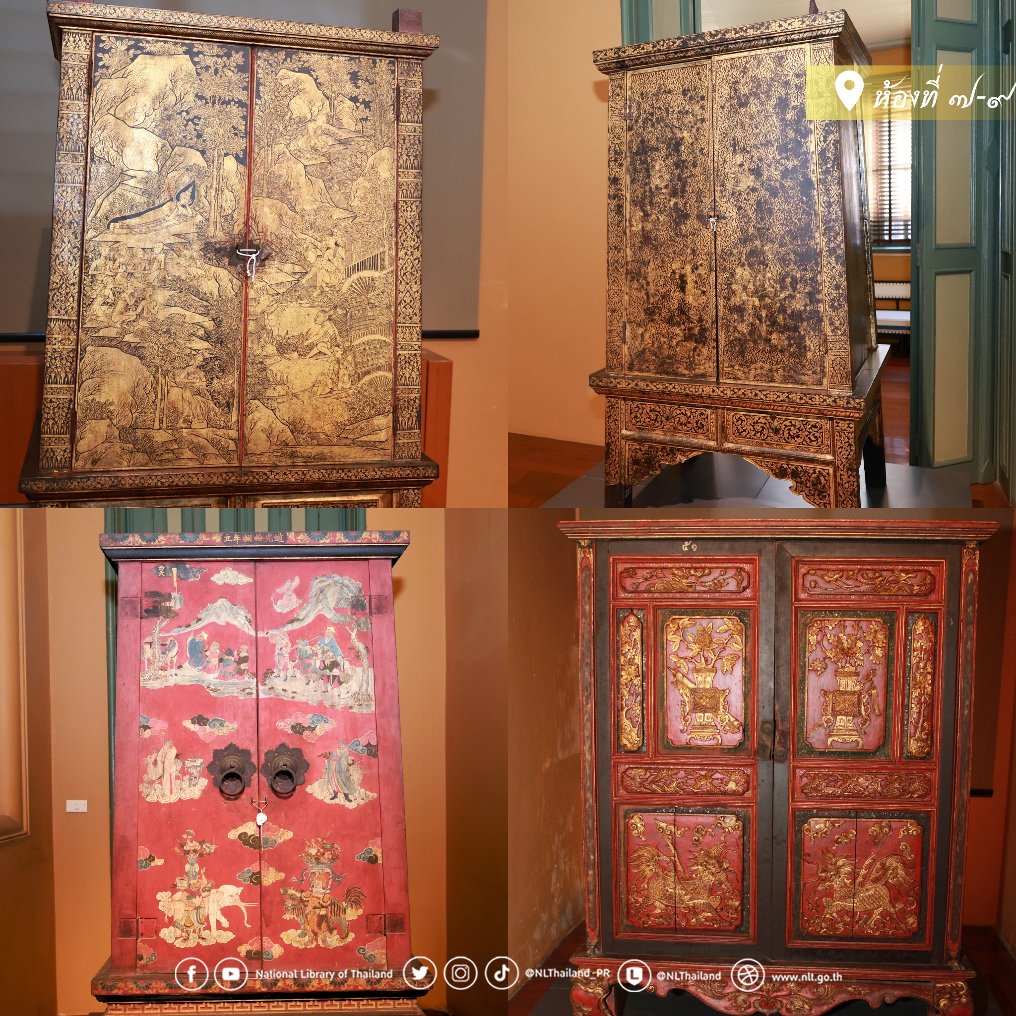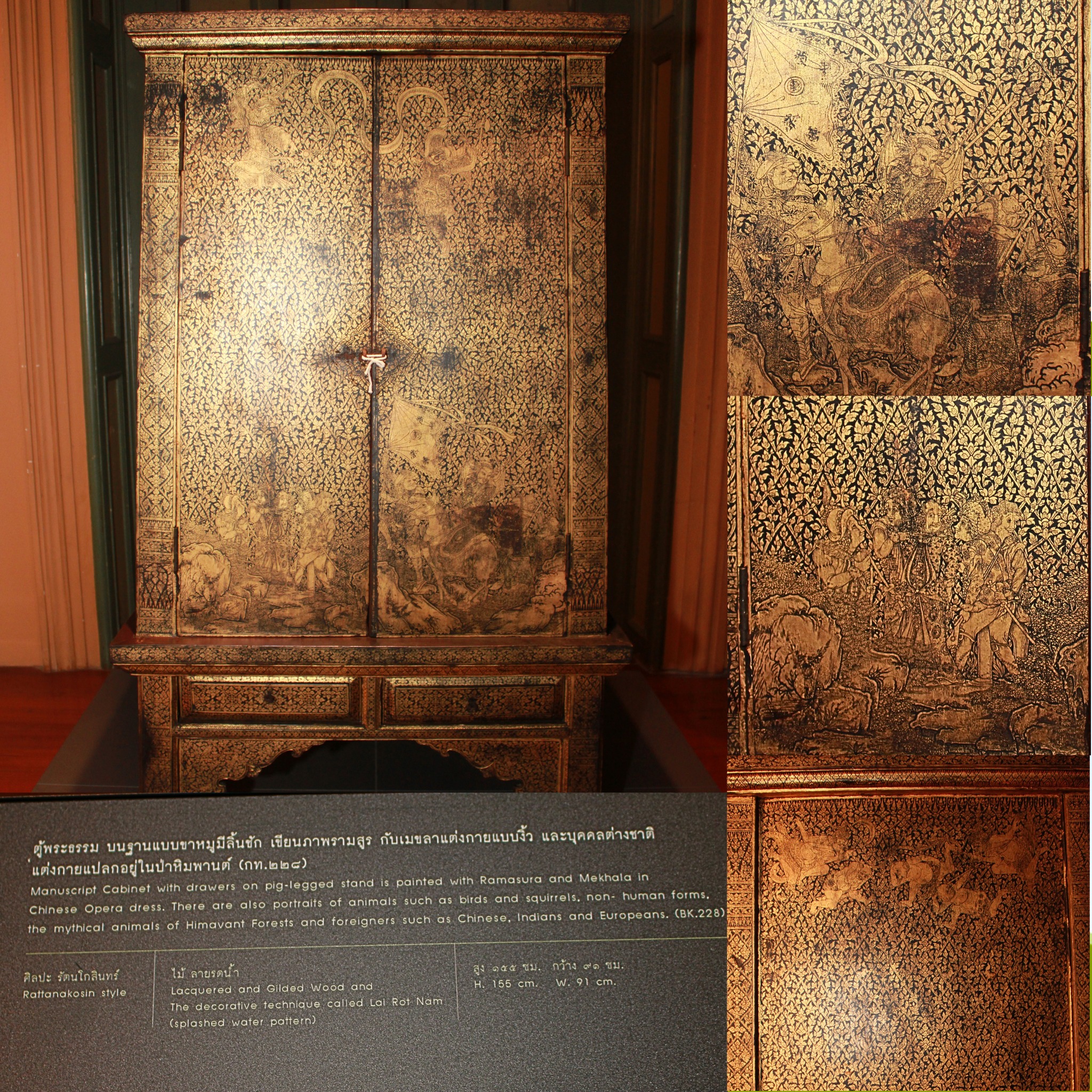 - ตู้ลายรดน้ำ "นานาชาติ" (กท. 228): สนุกไปกับจินตนาการของช่างโบราณที่เขียนภาพรามสูรแต่งชุดงิ้ว และภาพกองทัพจีนเผชิญหน้ากับทหารชาวยุโรป