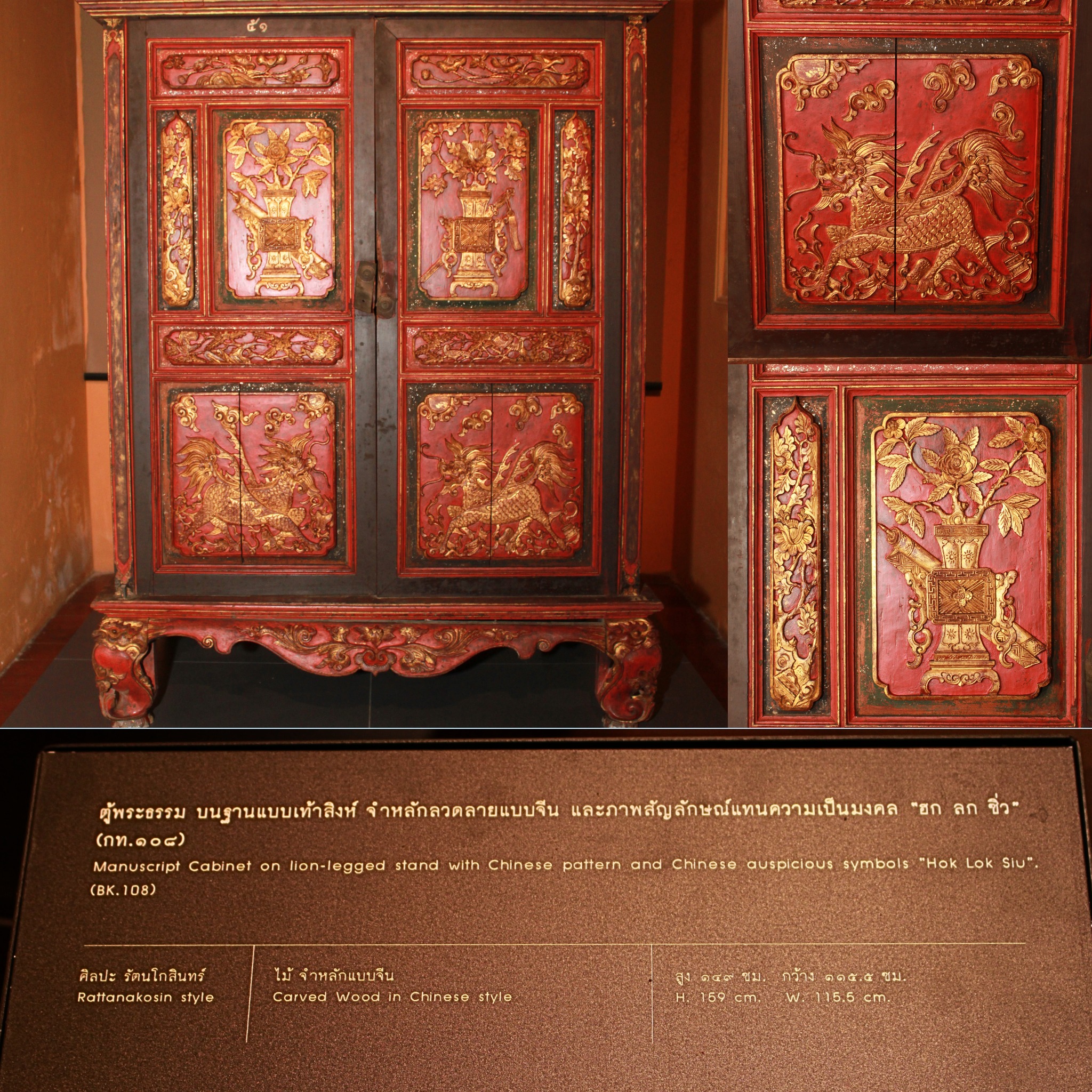 - ตู้จำหลักนูนต่ำมงคล (กท. 108): โดดเด่นด้วยงานแกะสลักรูปกิเลนและสัญลักษณ์ ฮก ลก ซิ่ว บนพื้นรักสีแดง ตัดกับทองทึบสวยสง่าตามแบบฉบับศิลปะจีน