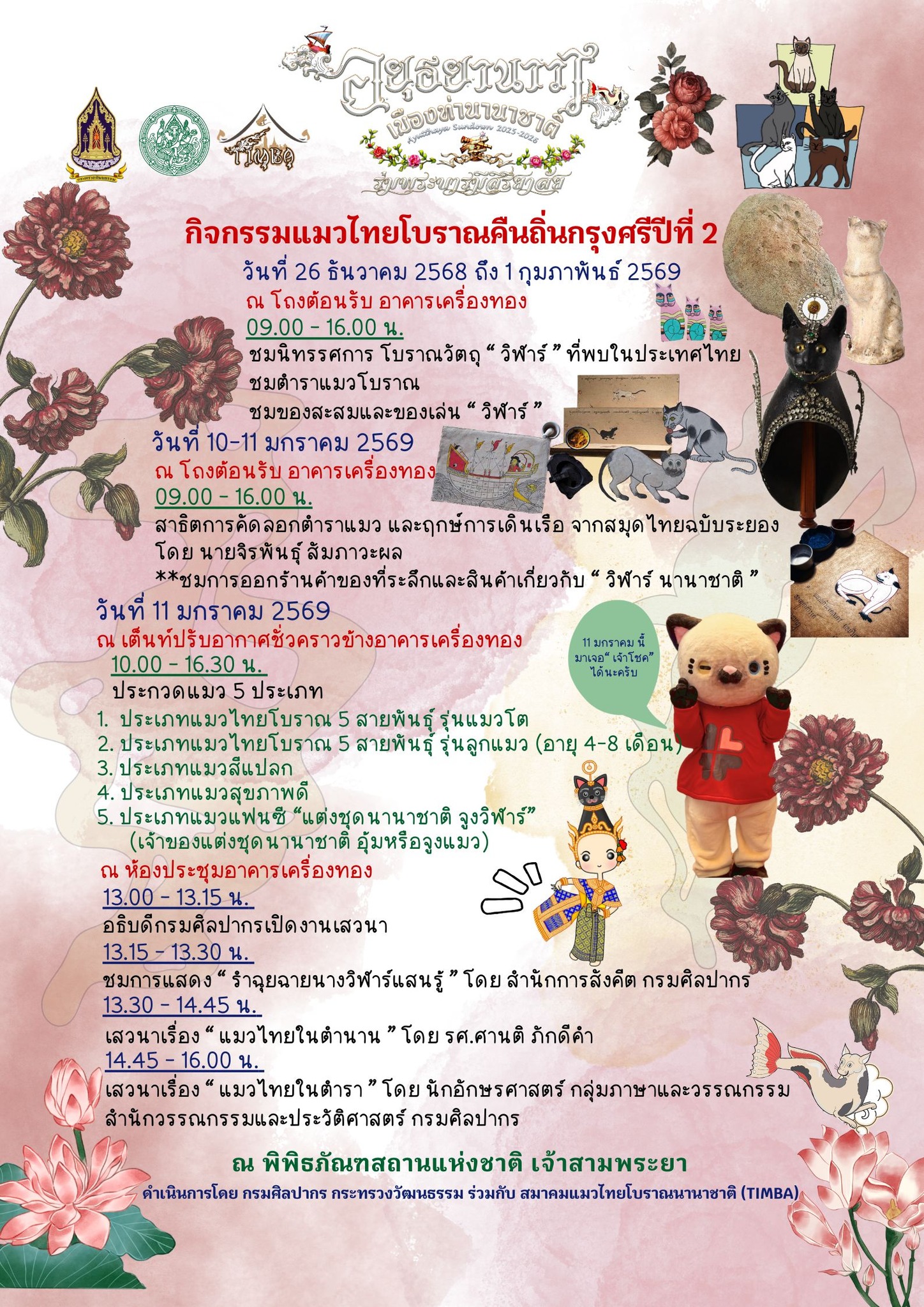 กระทรวงวัฒนธรรม โดยกรมศิลปากร ร่วมกับสมาคมแมวไทยโบราณนานาชาติ (TIMBA) ขอเชิญคนรักแมวเข้าร่วมกิจกรรมพิเศษ ประกวดแมวไทยโบราณคืนถิ่นกรุงศรี ปีที่ 2 ในหัวข้อ “แมวไทยโบราณ ประชันแมวนานาชาติ” ภายใต้โครงการอยุธยานาวา เมืองท่านานาชาติ ร่มพระบารมีสิริยาลัย ในวันอาทิตย์ที่ 11 มกราคม 2569 ตั้งแต่เวลา 09.00 น. - 16.00 น. ณ พิพิธภัณฑสถานแห่งชาติ เจ้าสามพระยา จังหวัดพระนครศรีอยุธยา