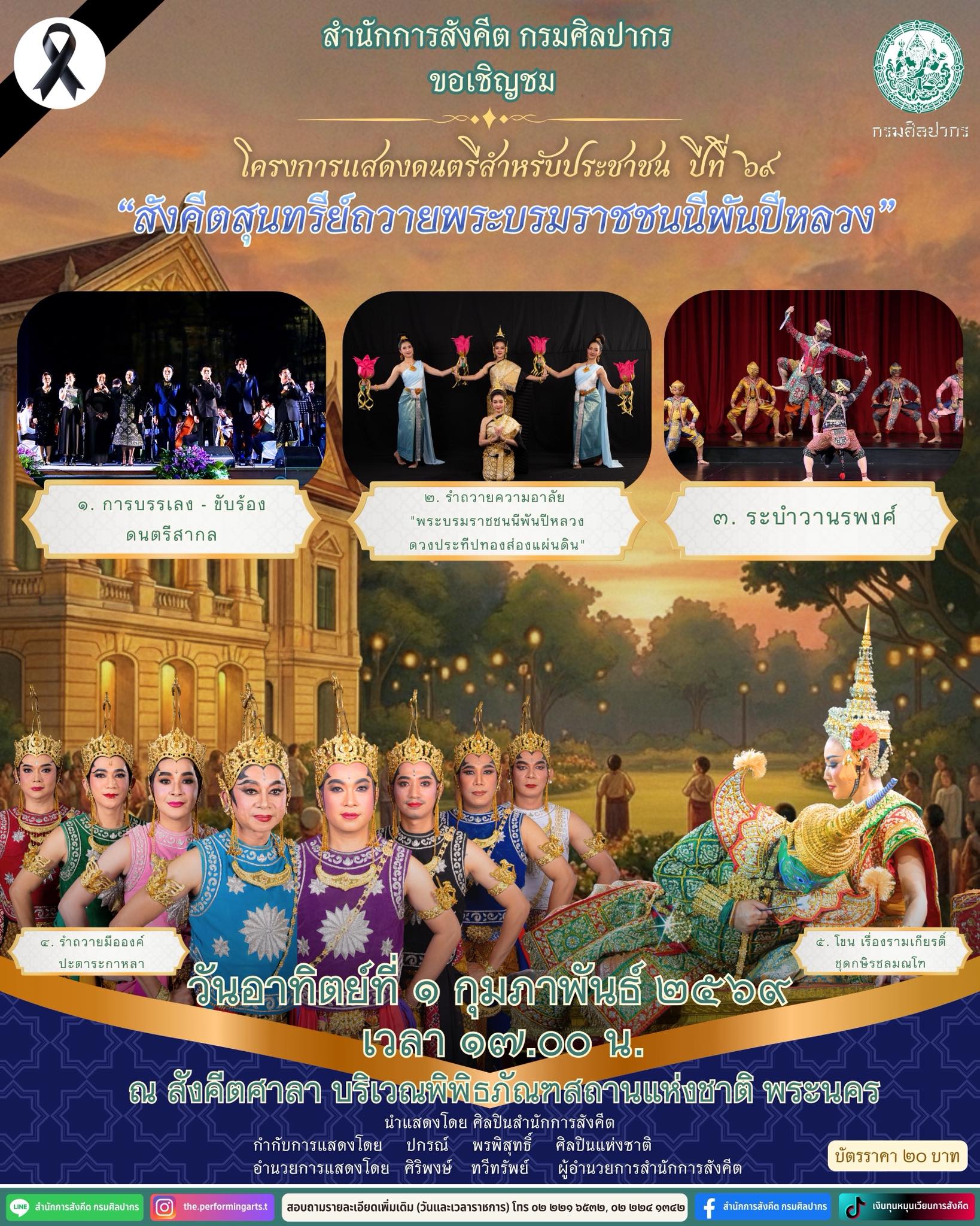 เริ่มวันอาทิตย์ที่ ๑ กุมภาพันธ์ ๒๕๖๙ เวลา ๑๗.๐๐ น. ขอเชิญชมการแสดงเนื่องในวันเปิดโครงการแสดงดนตรีสำหรับประชาชน ณ สังคีตศาลา ปีที่ ๖๙ “สังคีตสุนทรีย์ถวายพระบรมราชชนนีพันปีหลวง” วันอาทิตย์ที่ ๑ กุมภาพันธ์ ๒๕๖๙ เวลา ๑๗.๐๐ น. ณ สังคีตศาลา บริเวณพิพิธภัณฑสถานแห่งชาติ พระนคร พบกับรายการแสดง ดังนี้