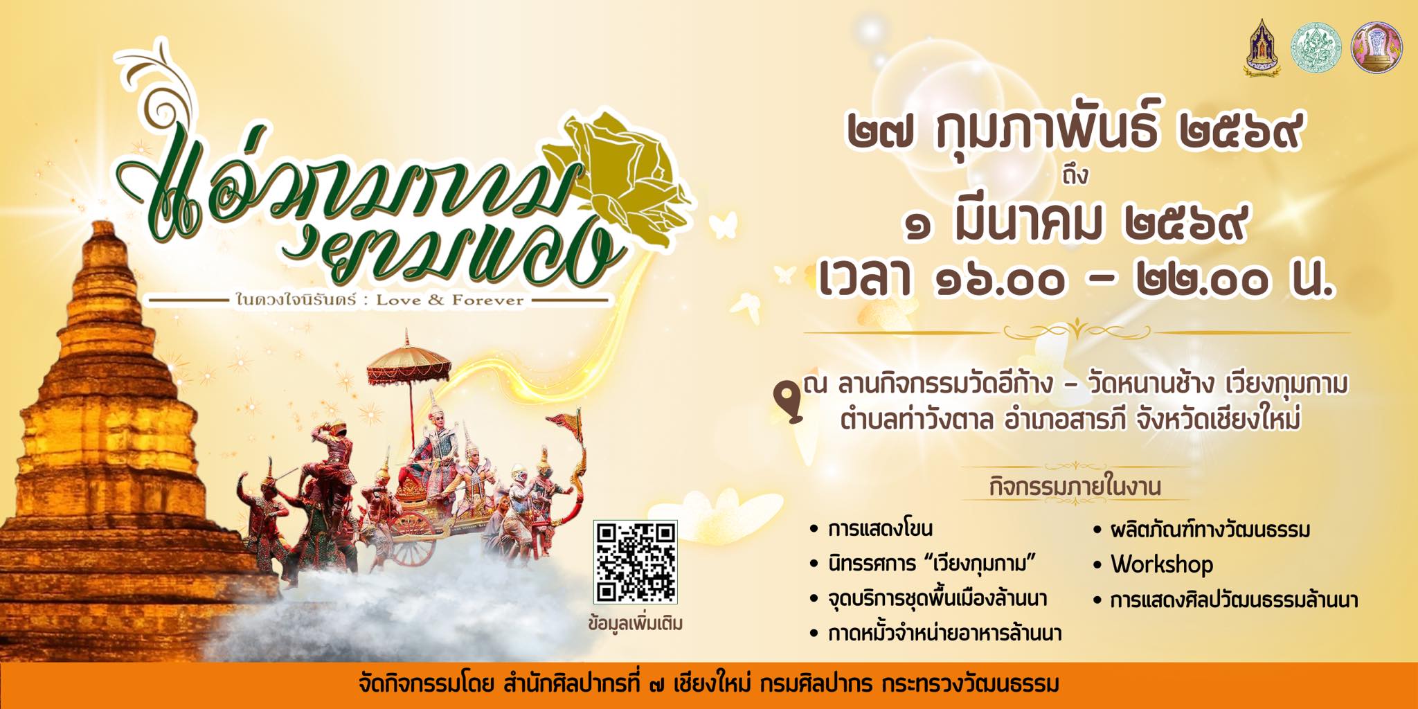 กรมศิลปากร โดยสำนักศิลปากรที่ 7 เชียงใหม่ ขอเชิญชวนทุกท่านร่วมงาน “แอ่วเวียงกุมกามยามแลง : ในดวงใจนิรันดร์ Love & Forever“ ระหว่างวันที่ 27 กุมภาพันธ์ - 1 มีนาคม 2569 ตั้งแต่เวลา 16.00 – 22.00 น. ณ ลานกิจกรรม วัดอีก้าง - วัดหนานช้าง เวียงกุมกาม ตำบลท่าวังตาล อำเภอสารภี จังหวัดเชียงใหม่