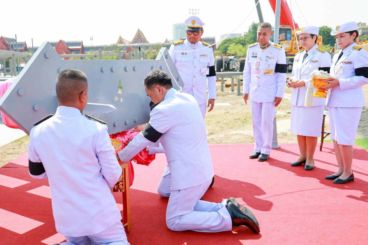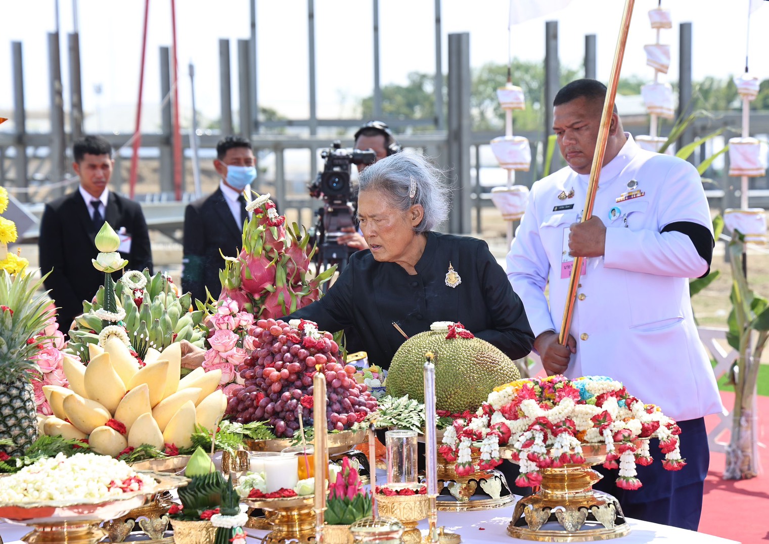 นายอนุทิน ชาญวีรกูล นายกรัฐมนตรี กราบบังคมทูลรายงาน จากนั้นสมเด็จพระกนิษฐาธิราชเจ้า กรมสมเด็จพระเทพรัตนราชสุดา ฯ สยามบรมราชกุมารี เสด็จ ฯ ไปยังมณฑลพิธีบวงสรวง ทรงจุดเทียนทอง เทียนเงิน และธูป แล้วทรงปักธูปหางที่เครื่องบวงสรวง ทรงจุดธูปเทียนเครื่องทองน้อย พระมหาราชครูพิธีศรีวิสุทธิคุณ ประธานพระครูพราหมณ์ อ่านโองการบวงสรวงเทพยดา และดวงพระวิญญาณสมเด็จพระบูรพมหากษัตริยาธิราช ในการก่อสร้างพระเมรุมาศ และอาคารประกอบ เมื่ออ่านโองการบวงสรวง จบแล้ว สมเด็จพระกนิษฐาธิราชเจ้า กรมสมเด็จพระเทพรัตนราชสุดา ฯ สยามบรมราชกุมารี ทรงพระกรุณาโปรดเกล้า ฯ ให้พระมหาราชครูพิธีศรีวิสุทธิคุณ ประธานพระครูพราหมณ์ หลั่งน้ำเทพมนตร์ เจิมและวางใบมะตูมที่เสาพระเมรุมาศ นายอนุทิน ชาญวีรกูล นายกรัฐมนตรี ปิดทอง และผูกผ้าสีชมพูที่เสาพระเมรุมาศ