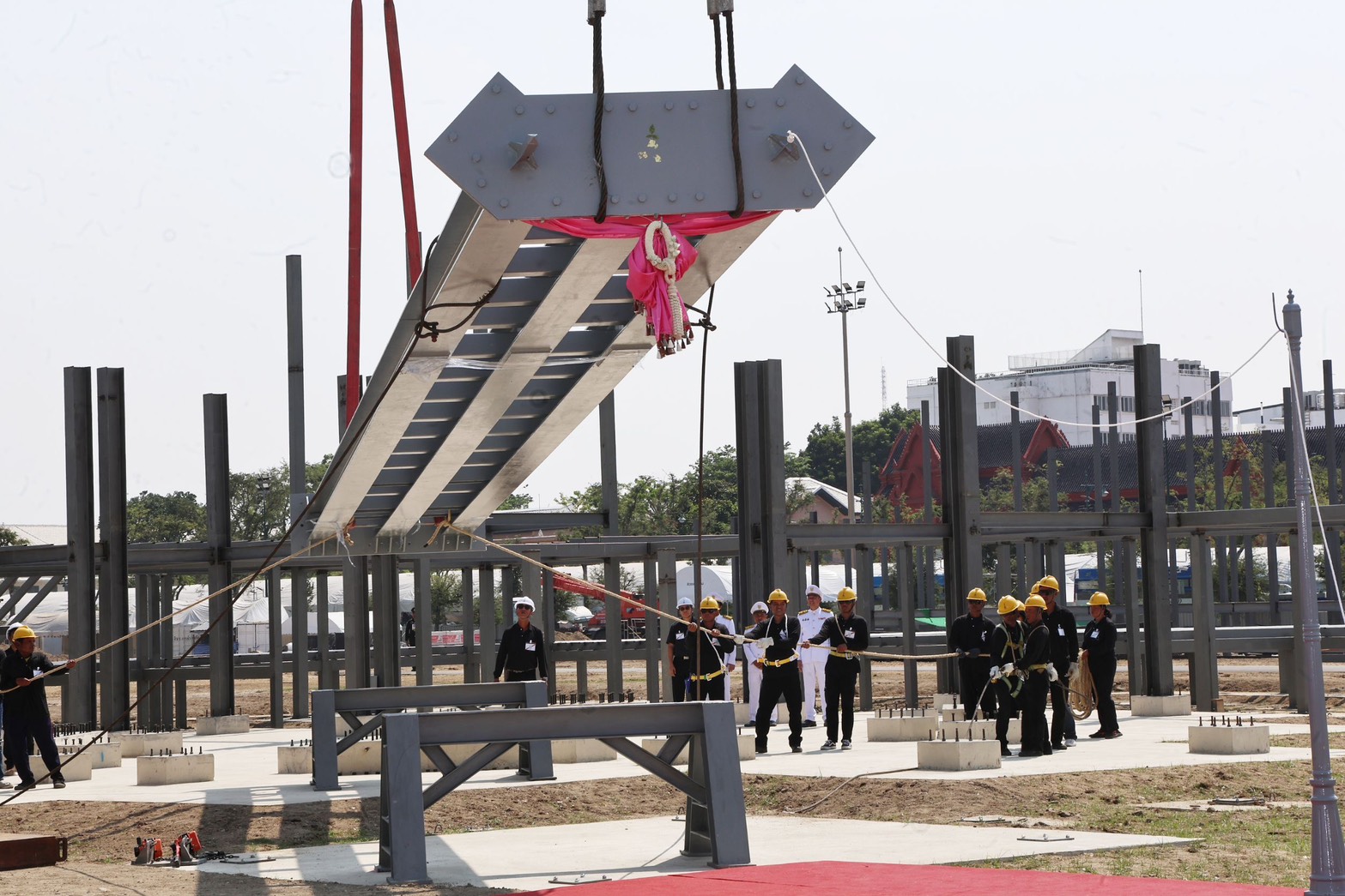 สำหรับเสาที่ยกในพิธี ได้แก่ เสาที่มุมอาคารทิศตะวันออกเฉียงเหนือ เป็นการยกชิ้นโครงสร้างเสาเหล็กถัก โดยใช้เครน 2 ตัว ยกขึ้นตั้งให้ได้ระดับ แล้วจึงขันน็อตที่โคนเสาให้ยึดติดกับฐานราก จากนั้นขึงสลิงให้เสาตั้งได้อย่างมั่นคง เมื่อเสร็จสิ้นพิธีแล้ว กรมศิลปากรจะทำการยกเสาโดยเวียนประทักษิณหรือเวียนขวาไปจนยกเสาขึ้นครบทั้ง 4 มุม คือจะใช้เครนยกเสาทางทิศตะวันออกเฉียงใต้ขึ้นเป็นเสาที่ 2 และวนไปตามเข็มนาฬิกา จนครบทั้ง 4 ต้น หลังจากนั้นจะเข้าสู่ขั้นตอนการติดตั้งโครงสร้างเครื่องยอด และโครงสร้างส่วนอื่น ๆ ของพระเมรุมาศต่อไป และในส่วนของ สถาปนิก วิศวกร และช่างศิลปกรรม จะเริ่มขั้นตอนสำคัญคือ "การขยายแบบ" หรือการเขียนแบบขยายด้วยมาตราส่วนเท่าของจริงทุกองค์ประกอบ โดยเฉพาะส่วนที่เป็นลวดลายองค์ประกอบสถาปัตยกรรมและองค์ประกอบศิลปกรรม โดยได้มีการจัดสร้างโรงขยายแบบขึ้น ณ ท้องสนามหลวง เพื่อใช้เป็นพื้นที่ในการเขียนแบบองค์ประกอบขนาดใหญ่ ซึ่งงานก่อสร้างและงานขยายแบบจะดำเนินงานคู่ขนานกันไปจนกว่าจะแล้วเสร็จตามกำหนดในเดือนตุลาคม 2569 นี้