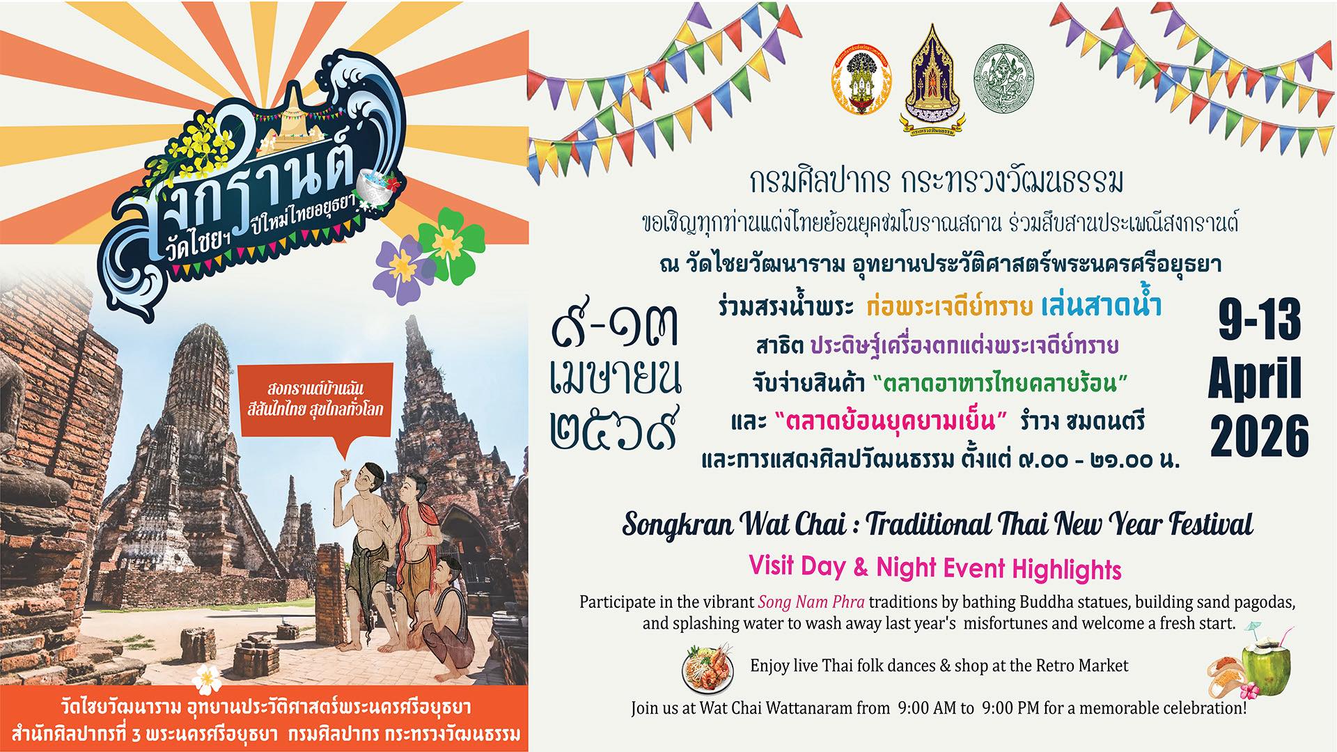 อุทยานประวัติศาสตร์พระนครศรีอยุธยา ขอเชิญชวนทุกท่านเที่ยวสงกรานต์วัดไชยฯ ชวนแต่งไทยเข้าวัด ในงาน "สงกรานต์ วัดไชยฯ ปีใหม่ไทยอยุธยา" ระหว่างวันที่ 9 - 13 เมษายน 2569 เวลา 09.00 - 21.00 น. ตลอด 5 วัน 5 คืน ณ โบราณสถานวัดไชยวัฒนาราม จังหวัดพระนครศรีอยุธยา โดยมีกิจกรรมภาคกลางวัน เวลา 09.00 น. เป็นต้นไป ประกอบด้วย