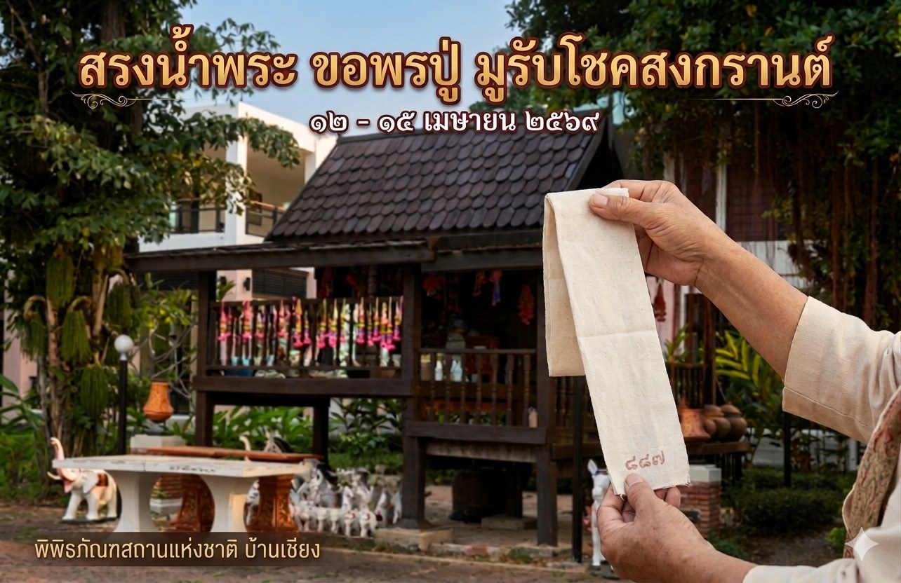 พิพิธภัณฑสถานแห่งชาติ บ้านเชียง ขอเชิญร่วมกิจกรรมสืบสานประเพณีสงกรานต์ 2569 "สรงน้ำพระ ขอพรปู่ มูรับโชคสงกรานต์" ระหว่างวันที่ 12 - 15 เมษายน 2569 ณ ลานด้านข้างศาลปู่ขุนเชียงสวัสดิ์ ภายในบริเวณพิพิธภัณฑสถานแห่งชาติ บ้านเชียง จังหวัดอุดรธานี ทุกท่านจะได้พบกับกิจกรรมพิเศษ ความลับที่ปลายผ้า... มีเพียง "50 คน" ต่อวันเท่านั้นที่จะได้รู้! ปู่แอบกระซิบมา... ใครอยากมีโชคใหญ่รับปีใหม่ไทย ต้องห้ามพลาดกิจกรรมที่บ้านเชียง! สอบถามเพิ่มเติม โทร. 0 4223 5040---------------------------------------------