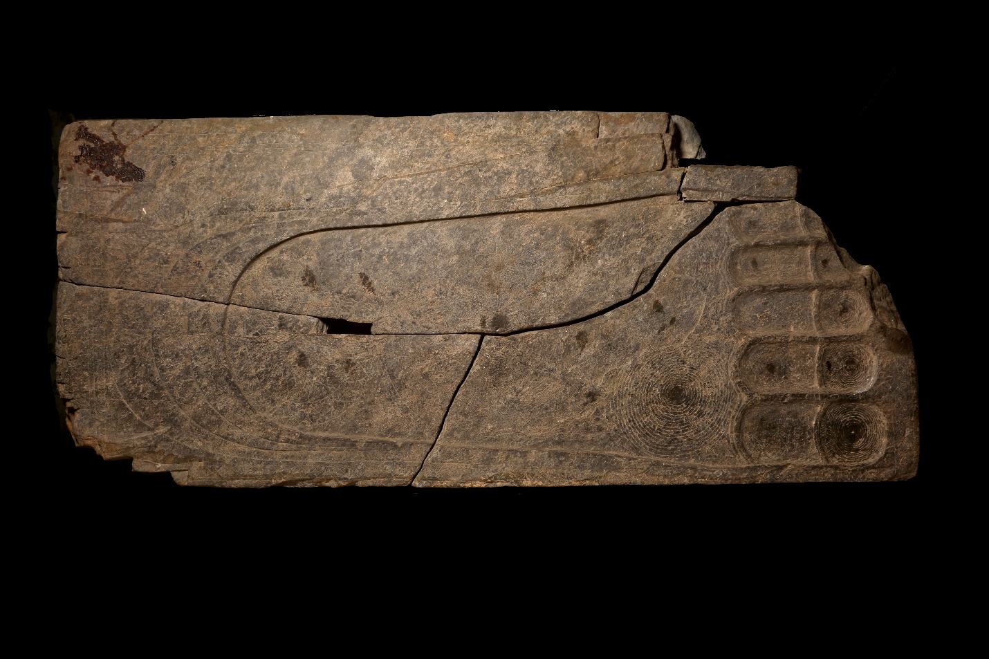 พระพุทธบาทสี่รอย สลักจากแผ่นหินชนวนขนาดกว้าง ๔๖ เซนติเมตร ยาว ๒๐๕ เซนติเมตร