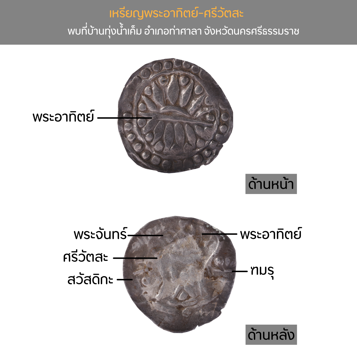 สำหรับเหรียญที่นำมากล่าวถึงในองค์ความรู้ชุดนี้ คือ “เหรียญพระอาทิตย์ – ศรีวัตสะ” พบที่บ้านทุ่งน้ำเค็ม อำเภอท่าศาลา จังหวัดนครศรีธรรมราช กำหนดอายุราวพุทธศตวรรษที่ ๑๒ - ๑๔ ลักษณะเป็นเหรียญทรงกลมแบน ทำจากโลหะเงิน มีขนาดเส้นผ่าศูนย์กลางเฉลี่ย ๓ เซนติเมตร พบทั้งเหรียญที่มีสภาพสมบูรณ์ และเหรียญที่มีการตัดแบ่งออกเป็นชิ้นส่วนเล็ก ๆ (สองส่วนและสี่ส่วน) ซึ่งสันนิษฐานว่าเป็นการตัดแบ่งเหรียญเพื่อให้เป็นหน่วยย่อยในการซื้อขายแลกเปลี่ยนสินค้า ด้านหน้าของเหรียญเป็นรูปพระอาทิตย์ มีเส้นรอบวงและลายไข่ปลาล้อมรอบ ส่วนด้านหลังของเหรียญเป็นรูปศรีวัตสะ และมีสัญลักษณ์ที่เป็นมงคลล้อมรอบ ประกอบด้วย ฑมรุ (กลอง ๒ หน้า) สวัสดิกะ พระจันทร์ และพระอาทิตย์