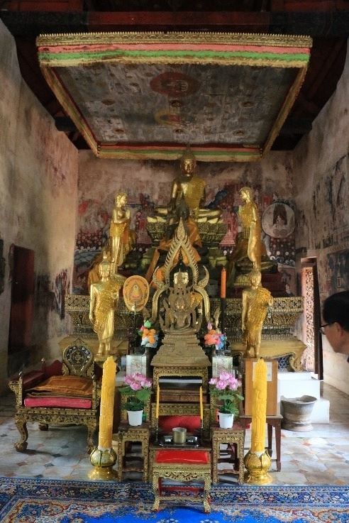 แถวที่สามอยู่ระหว่างช่องหน้าต่างเป็นภาพทศชาติชาดกบนไม้เพดานและชื่อ มีการตกแต่งลวดลายเป็นลายดอกไม้ และดาวเพดานทั้งหมดบนพื้นสีแดง ส่วนที่อยู่เหนือพระพุทธรูปประธานมีฉัตรทรงสี่เหลี่ยม โครงเป็นไม้ตกแต่งขอบด้วยไม้แกะสลักและผ้า พื้นเป็นสังกะสีเขียนลวดลายเป็นรูปท้องฟ้า มีภาพพระอาทิตย์และพระจันทร์กำลังทรงรถ และดวงดาราต่างๆ