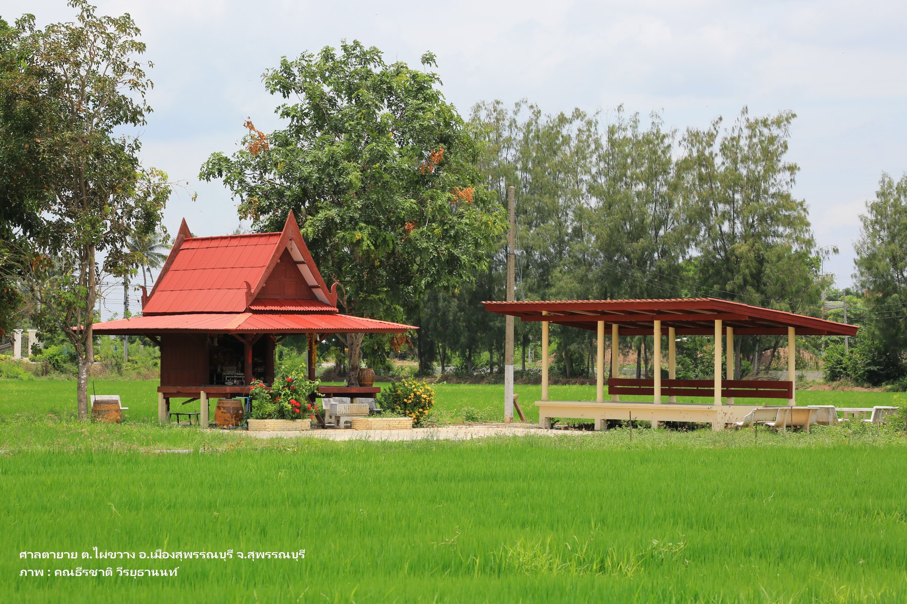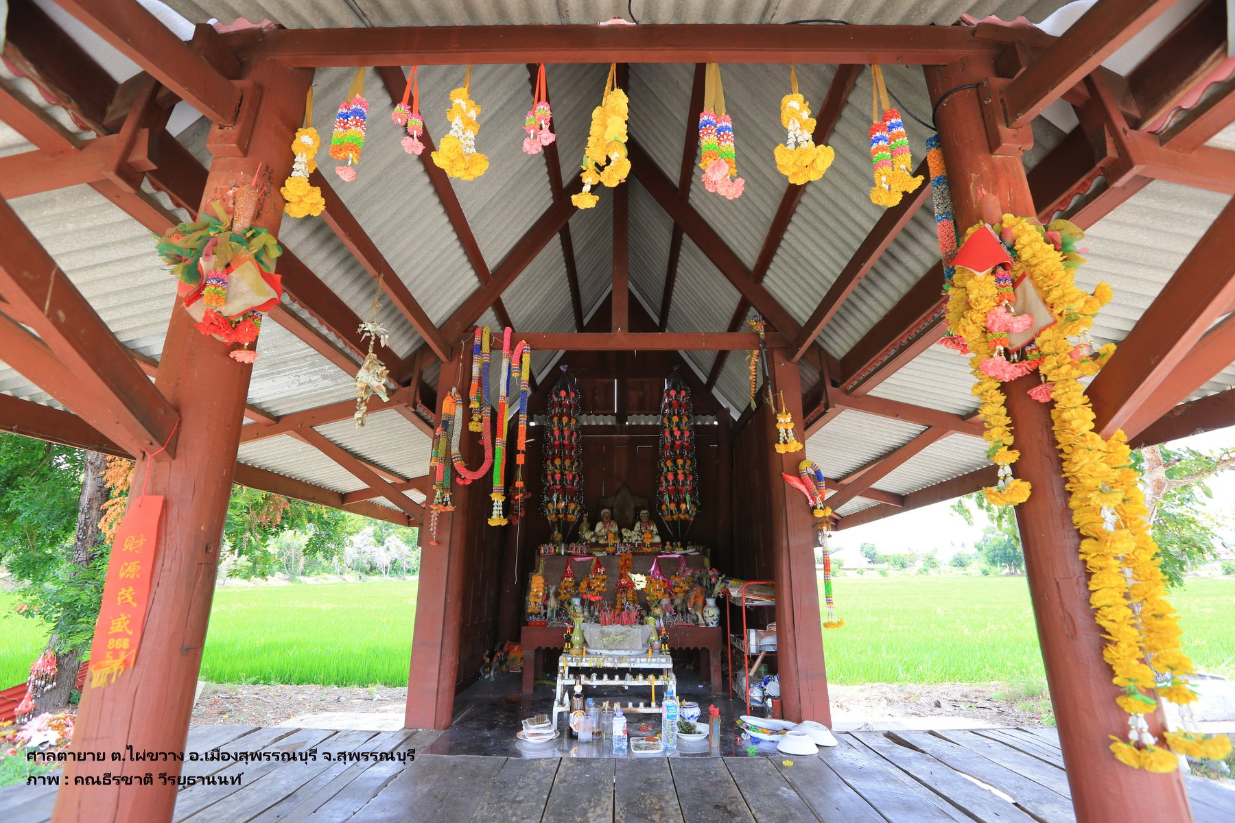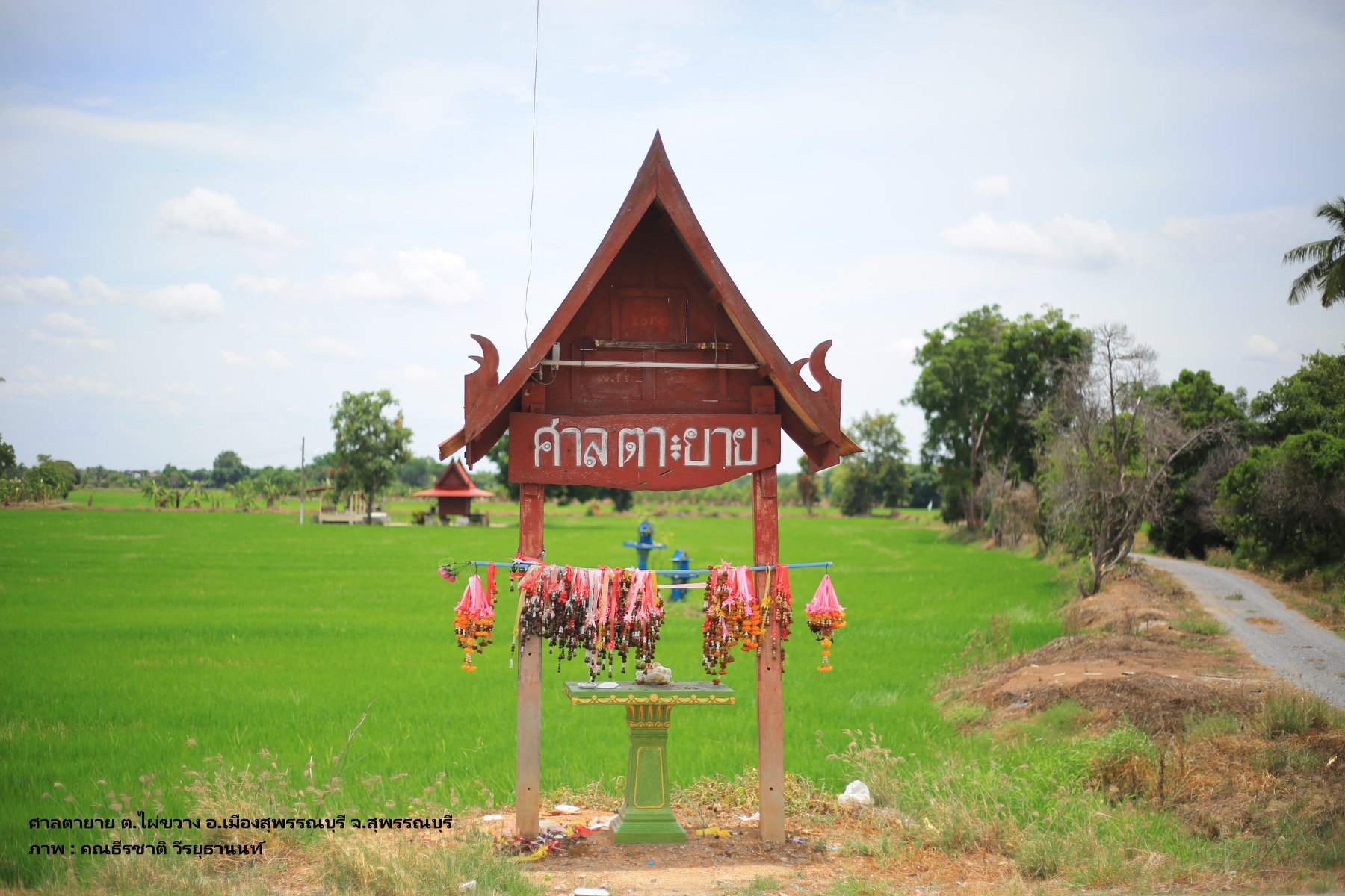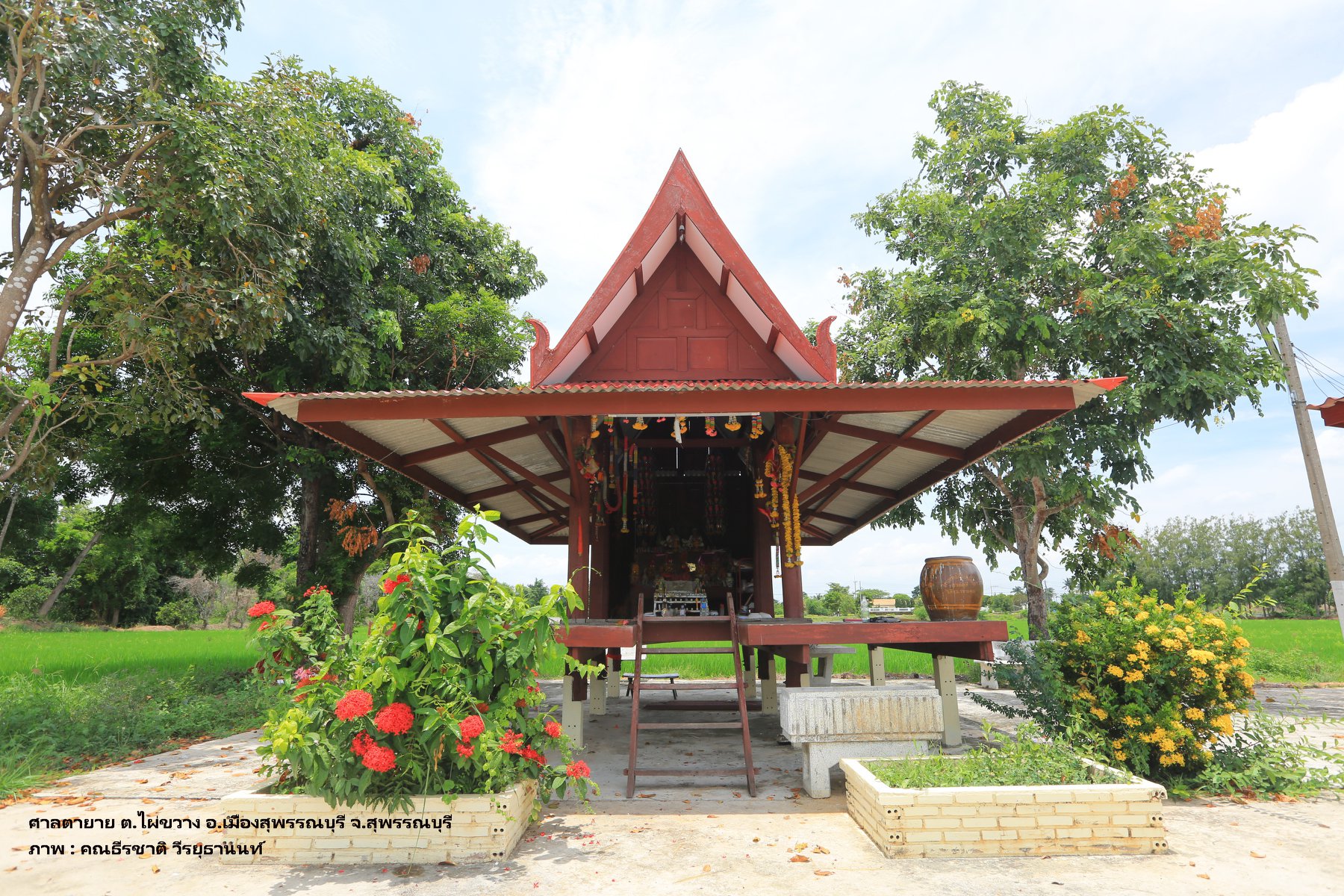 สภาพพื้นที่ตั้งศาลปู่ตา ใต้ต้นไม้ใหญ่ใกล้ท้องนา เงียบสงบ ร่มรื่น อ.บางปลาม้า จงสุพรรณบุรี