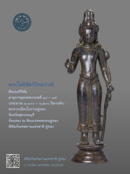 ประติมากรรมสำริดรูปพระโพธิสัตว์ปัทมปาณิ หรือพระโพธิสัตว์อวโลกิเตศวร สูงประมาณ ๒๓.๕ เซนติเมตร เกล้าพระเกศาทรงสูงทรงชฎามงกุฎ มีพระพุทธรูปนั่งปางสมาธิ ซึ่งหมายถึง พระธยานิพุทธเจ้าอมิตาภะ ประทับอยู่ที่ด้านหน้ามวยผม พระหัตถ์ขวาทรงถืออักษมาลา (ลูกประคำ) พระหัตถ์ซ้ายทรงถือปัทม (ดอกบัว) และกลศ (หม้อน้ำ) มีสายยัชโญปวีตพาดที่พระอังสาซ้าย นุ่งผ้าโธตียาว ประทับยืนบนฐานทรงกลม จากรูปแบบศิลปกรรมแบบศรีวิชัย กำหนดอายุราวพุทธศตวรรษที่ ๑๔ – ๑๕ (ประมาณ ๑,๑๐๐ – ๑,๒๐๐ ปีมาแล้ว) นอกจากนี้ ที่เมืองโบราณอู่ทอง ยังพบส่วนเศียรพระโพธิสัตว์อีก ๒ ชิ้น และยังมีการพบประติมากรรมรูปพระโพธิสัตว์ในเมืองโบราณวัฒนธรรมทวารวดีอีกหลายแห่ง เช่น เมืองโบราณคูบัว จังหวัดราชบุรี และเมืองโบราณศรีเทพ จังหวัดเพชรบูรณ์ เป็นต้น