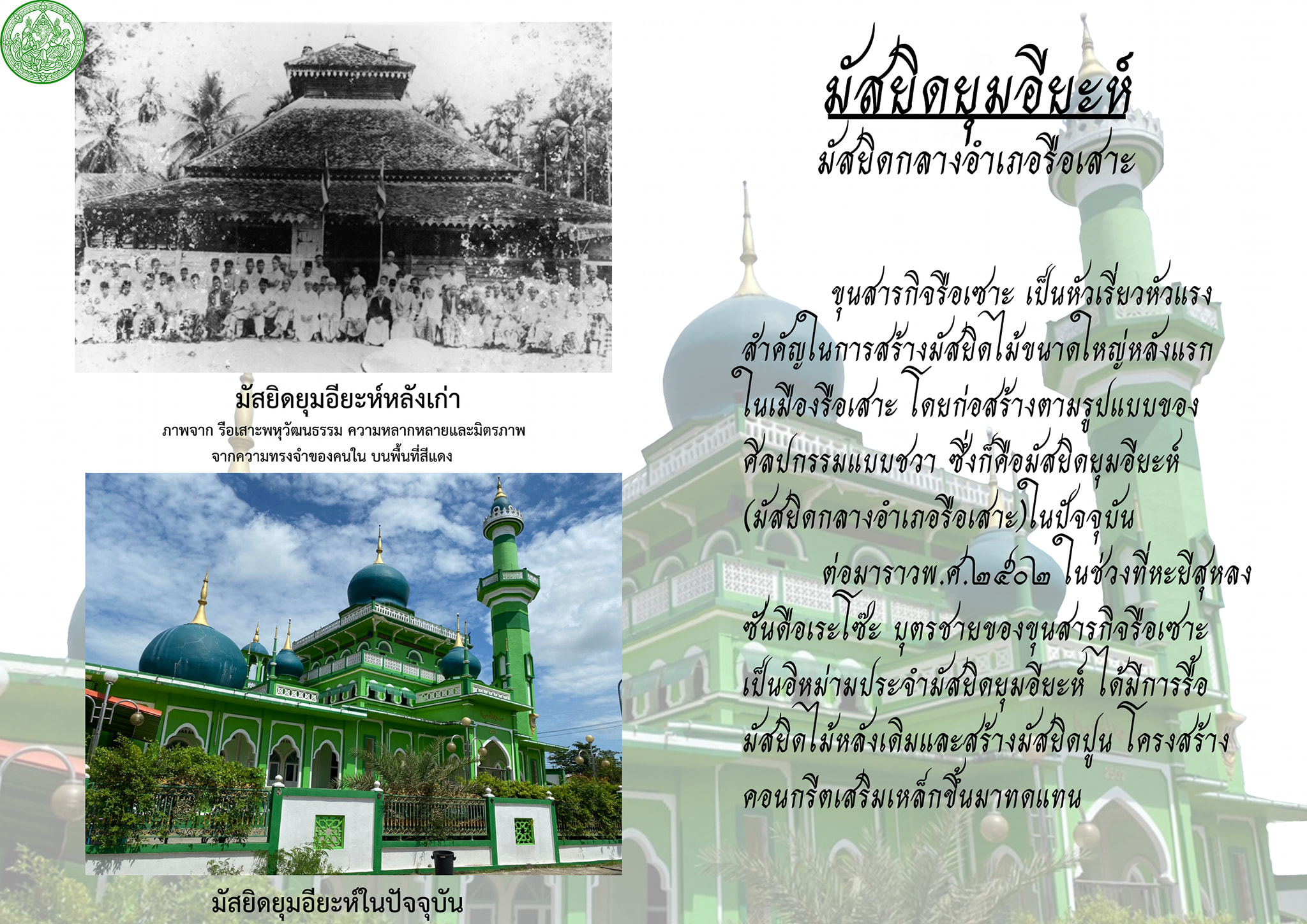 ขุนสารกิจรือเซาะเป็นหัวเรี่ยวหัวแรงสำคัญในการสร้างมัสยิดไม้ขนาดใหญ่หลังแรกในเมืองรือเสาะ โดยก่อสร้างตามรูปแบบของศิลปกรรมแบบชวา ซึ่งก็คือมัสยิดยุมอียะห์(มัสยิดกลางอำเภอรือเสาะ)ในปัจจุบัน ต่อมาราวพ.ศ.๒๕๐๒ ในช่วงที่หะยีสุหลง ซันดือเร๊ะโซ๊ะ บุตรชายของขุนสารกิจรือเซาะเป็นอิหม่ามประจำมัสยิดยุมอียะห์ ได้มีการรื้อมัสยิดไม้หลังเดิมและสร้างมัสยิดปูนคอนกรีตเสริมเหล็กขึ้นมาทดแทน