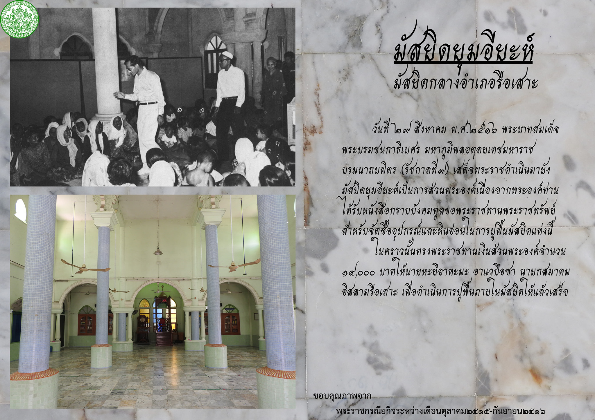 วันที่ ๒๙ สิงหาคม ๒๕๑๖ พระบาทสมเด็จพระบรมชนกาธิเบศร มหาภูมิพลอดุลยเดชมหาราช บรมนาถบพิตร(รัชกาลที่๙) เสด็จพระราชดำเนินมายังมัสยิดยุมอียะห์เป็นการส่วนพระองค์ เนื่องจากพระองค์ท่านได้รับหนังสือกราบบังคมทูลขอพระราชทานพระราชทรัพย์สำหรับจัดซื้ออุปกรณ์และหินอ่อนในการปูพื้นมัสยิดแห่งนี้ ในคราวนั้นทรงพระราชทานเงินส่วนพระองค์จำนวน ๑๔,๐๐๐ บาท ให้นายหะยีอาหะมะ อาแวบือซา นายกสมาคมอิสลามรือเสาะ เพื่อดำเนินการปูพื้นภายในมัสยิดให้แล้วเสร็จ