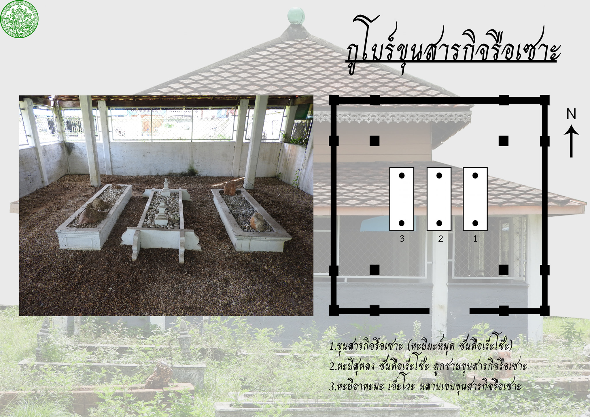 ตั้งอยู่ที่หมู่ที่ ๑ บ้านตลาดรือเสาะ ตำบลรือเสาะออก อำเภอรือเสาะ จังหวัดนราธิวาส ในบริเวณหลังมัสยิดยุมอียะห์ (มัสยิดกลางอำเภอรือเสาะ) อาคารคลุมหลุมฝังศพมีลักษณะเป็นอาคารคอนกรีต มุงกระเบื้องดินเผา ขนาดกว้าง ๕.๕๒ เมตร ยาว ๕.๕๘ เมตร มีประตูทางเข้าด้านทิศใต้ ๑ ประตู ภายในอาคารมีการฝังศพของผู้วายชนม์ ๓ ท่านคือ
