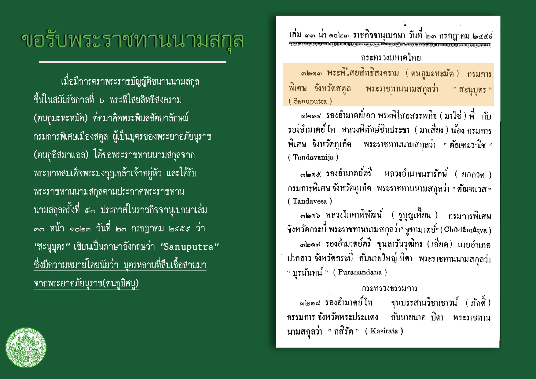เมื่อมีการตราพระราชบัญญัติขนานนามสกุล ขึ้นในสมัยรัชกาลที่ ๖ พระพิไสยสิทธิสงคราม(ตนกูมะหะหมัด) ต่อมาคือพระพิมลสัตยาลักษณ์ กรมการพิเศษเมืองสตูล ผู้เป็นบุตรของพระยาอภัยนุราช (ตนกูอิสมาแอล) ได้ขอพระราชทานนามสกุลจากพระบาทสมเด็จพระมงกุฎเกล้าเจ้าอยู่หัว และได้รับพระราชทานนามสกุลตามประกาศพระราชทานนามสกุลครั้งที่ ๕๓ ประกาศในราชกิจจานุเบกษาเล่ม ๓๓ หน้า ๑๐๒๓ วันที่ ๒๓ กรกฎาคม ๒๔๕๙ ว่า “สะนุบุตร” เขียนเป็นภาษาอังกฤษว่า “Sanuputra”