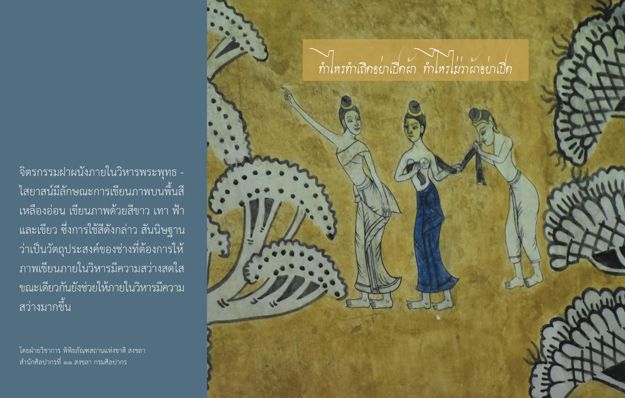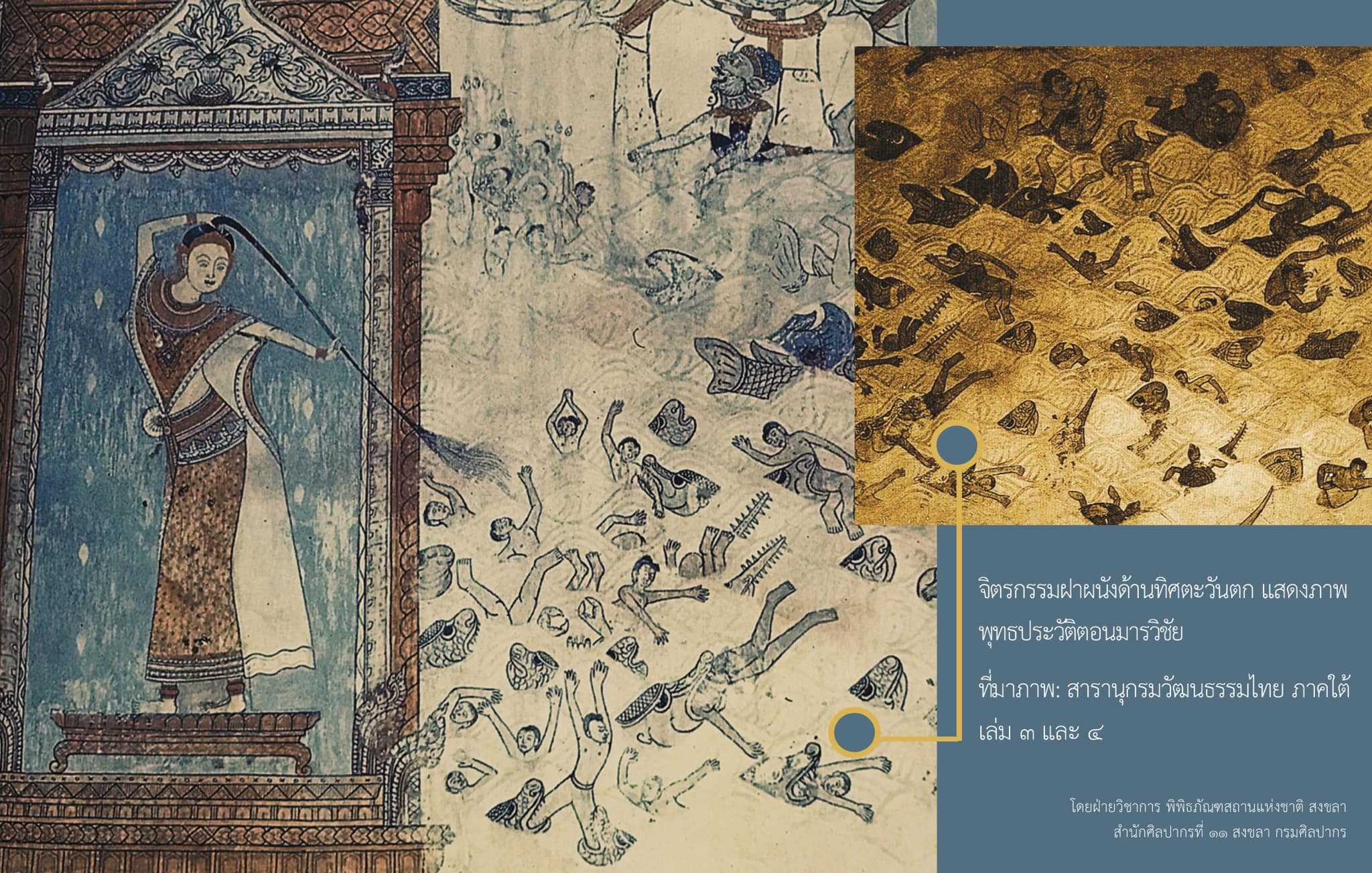 ภาพที่พิพิธภัณฑสถานแห่งชาติ สงขลา นำมาใช้ประชาสัมพันธ์ เป็นภาพจำลองมาจากจิตรกรรมฝาผนังภายในวิหารพระพุทธไสยาสน์ หรือวิหารพ่อเฒ่านอน วัดจะทิ้งพระ อำเภอสทิงพระ จังหวัดสงขลา